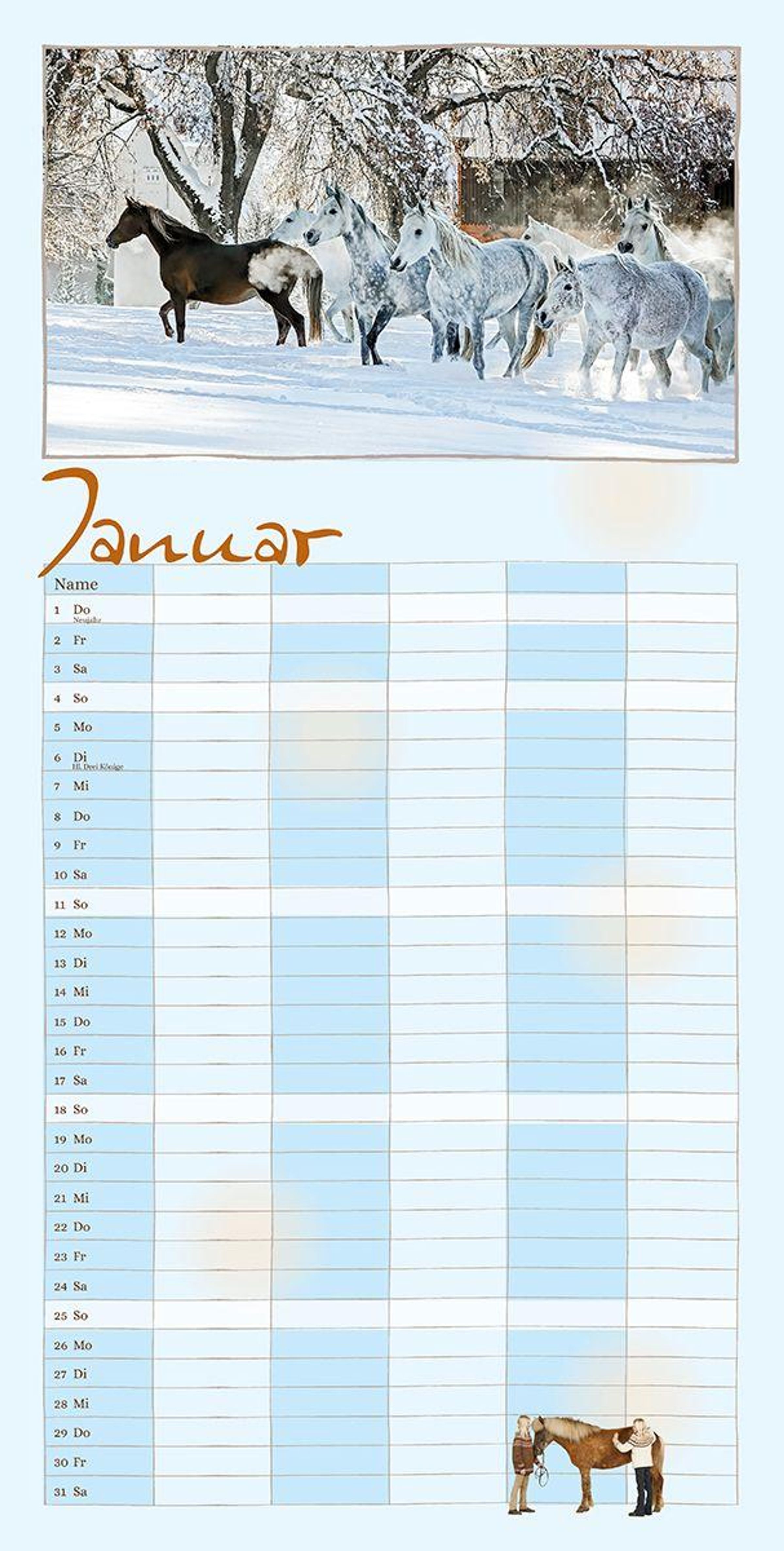 Der Terminkalender für die ganze Familie Dieser Kalender bietet viel Platz für alle möglichen Notizen - ein Terminkalender für die ganze Familie! Er ist auch zum Träumen gemacht, zum Planen von vielen Dingen, Terminen und Aktivitäten - nicht nur rund um das Pferd. Jedes Motiv in diesem Familienplaner zeigt die besondere Ausstrahlung dieser herrlichen Wesen und man plant in Gedanken schon den nächsten Ausritt.