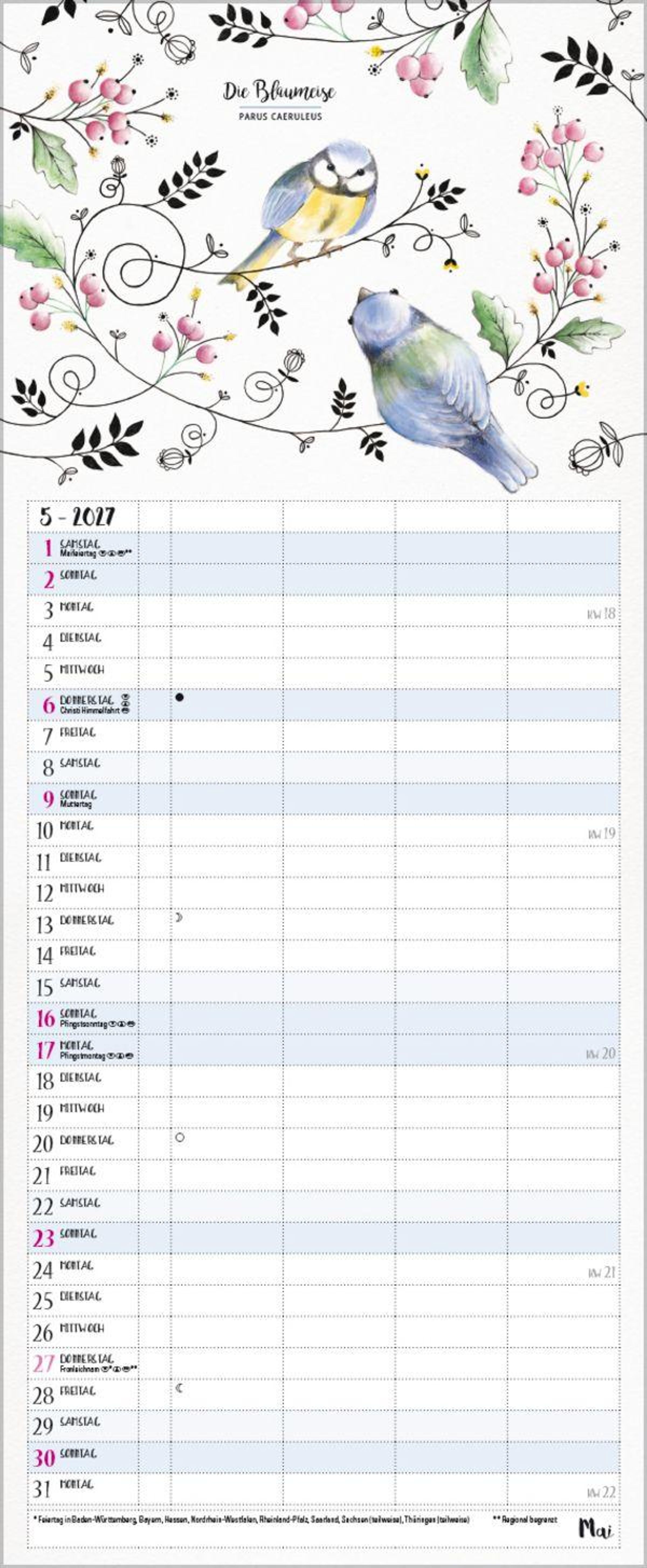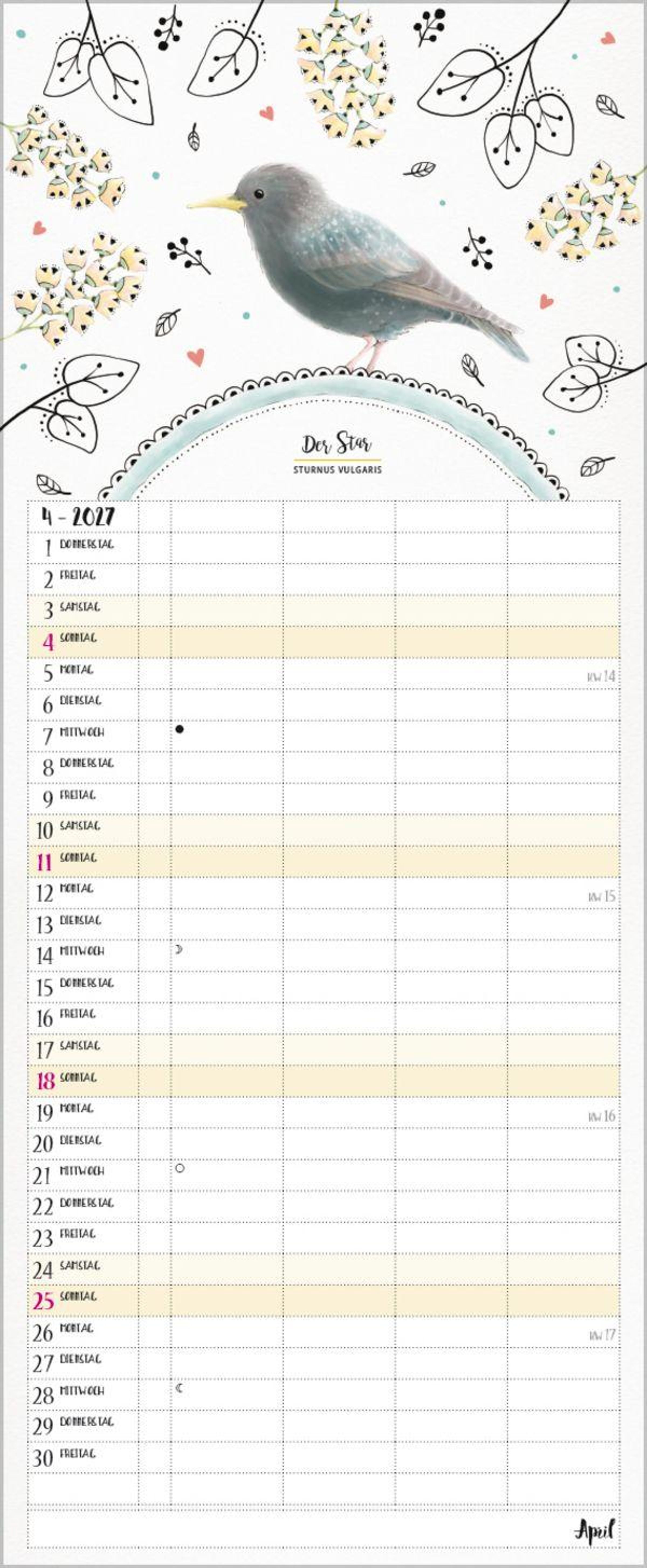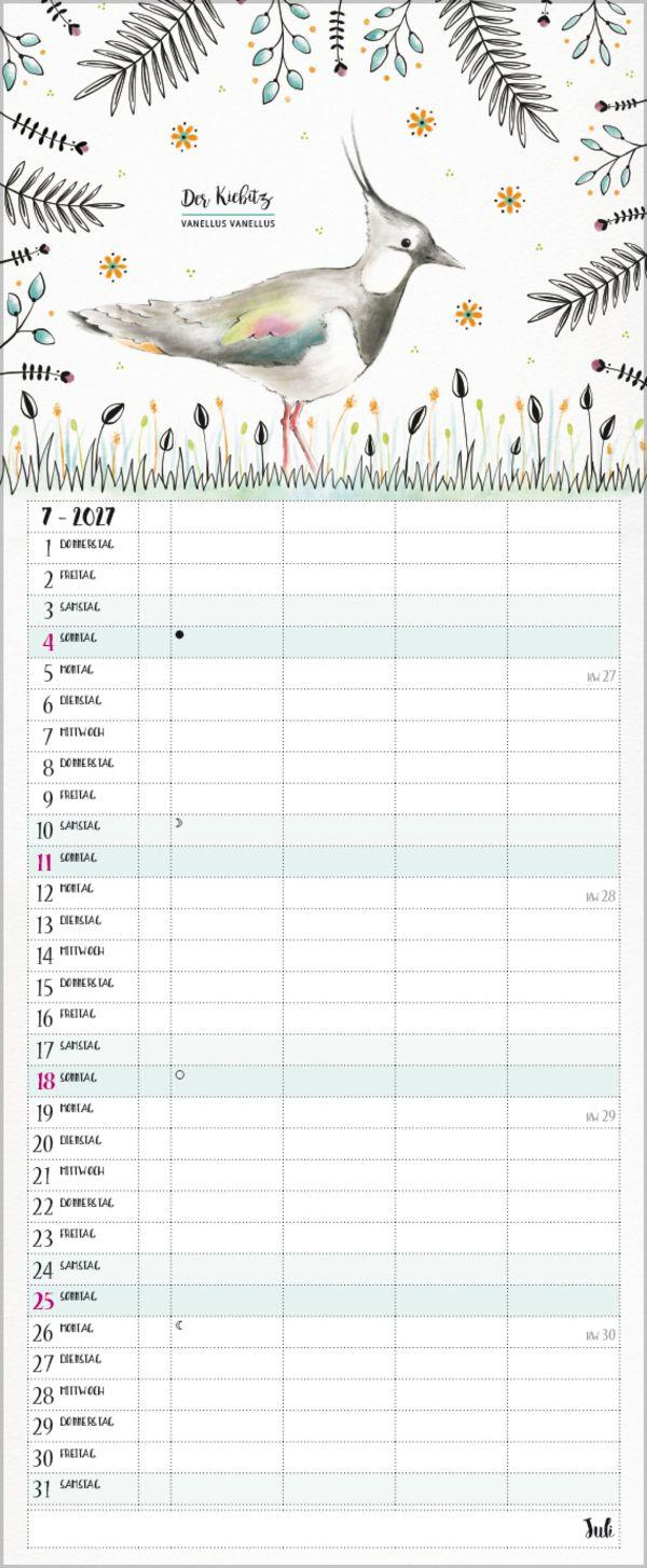 Bezaubernde Vögelchen im Aquarell-Stil mit schwarzen Fineliner-Konturen tummeln sich auf jeder Kalenderseite und begleiten die Familie durchs Jahr. Komplettiert wird jedes Motiv durch den gebräuchlichen sowie den lateinischen Namen jedes Vogels. Ein wunderschöner Planer für Groß und Klein, für Wissbegierige und Vogelliebhaber. 4 Spalten plus Müllspalte, Ferientermine und Vorschau bis März des Folgejahres. Exklusiv entworfen für Korsch.
