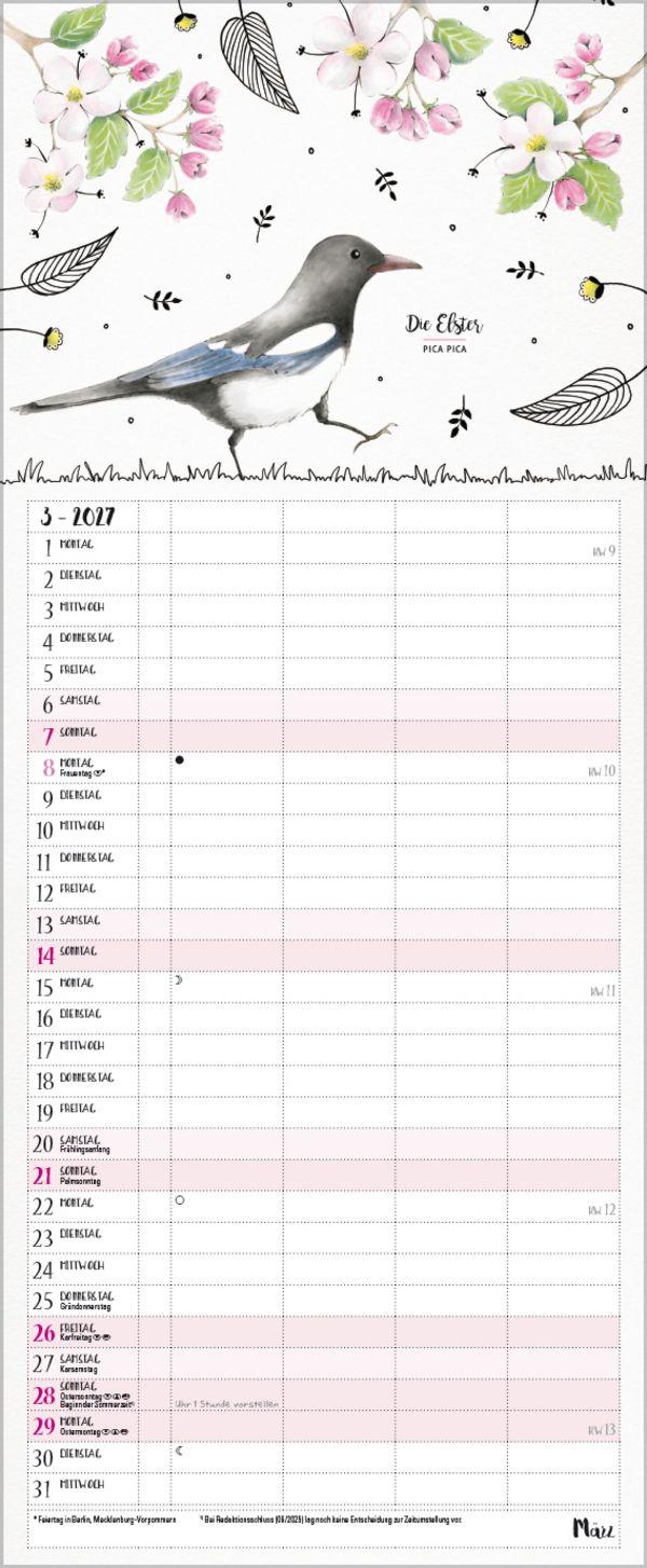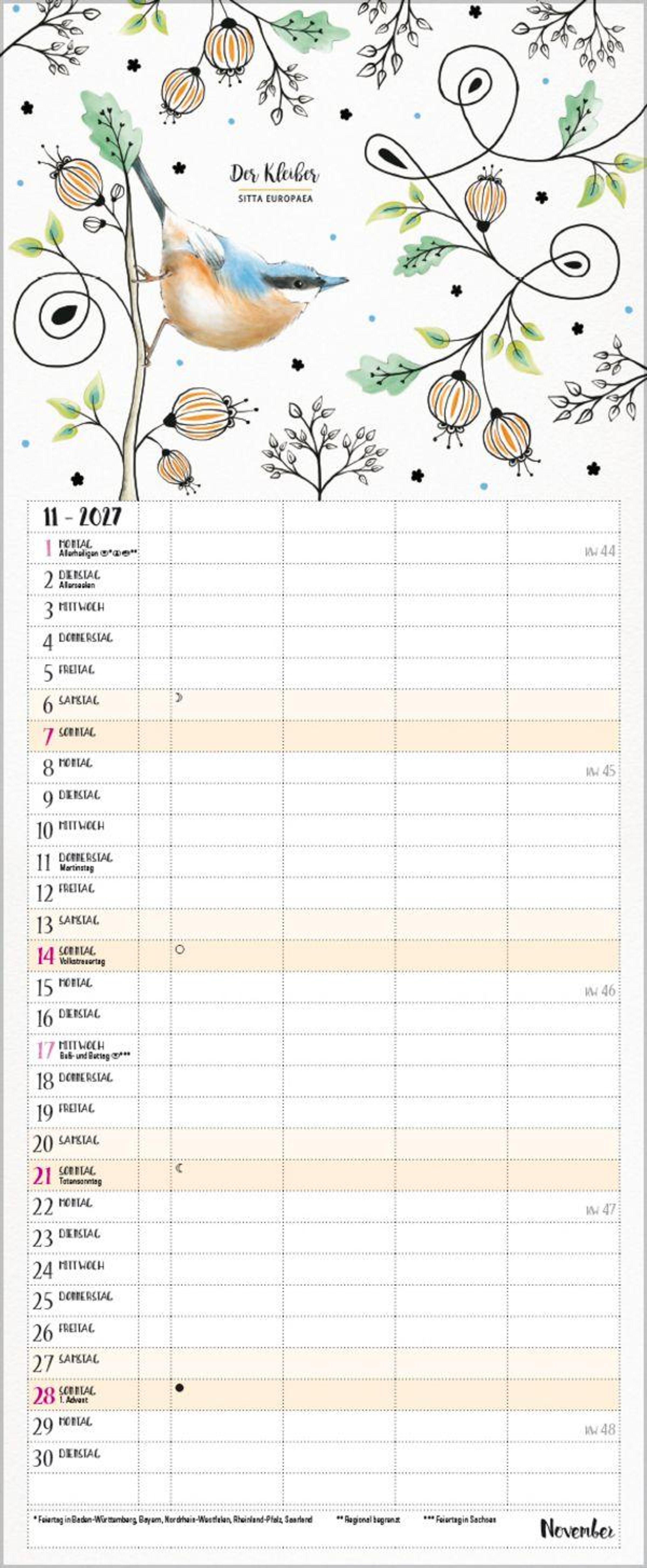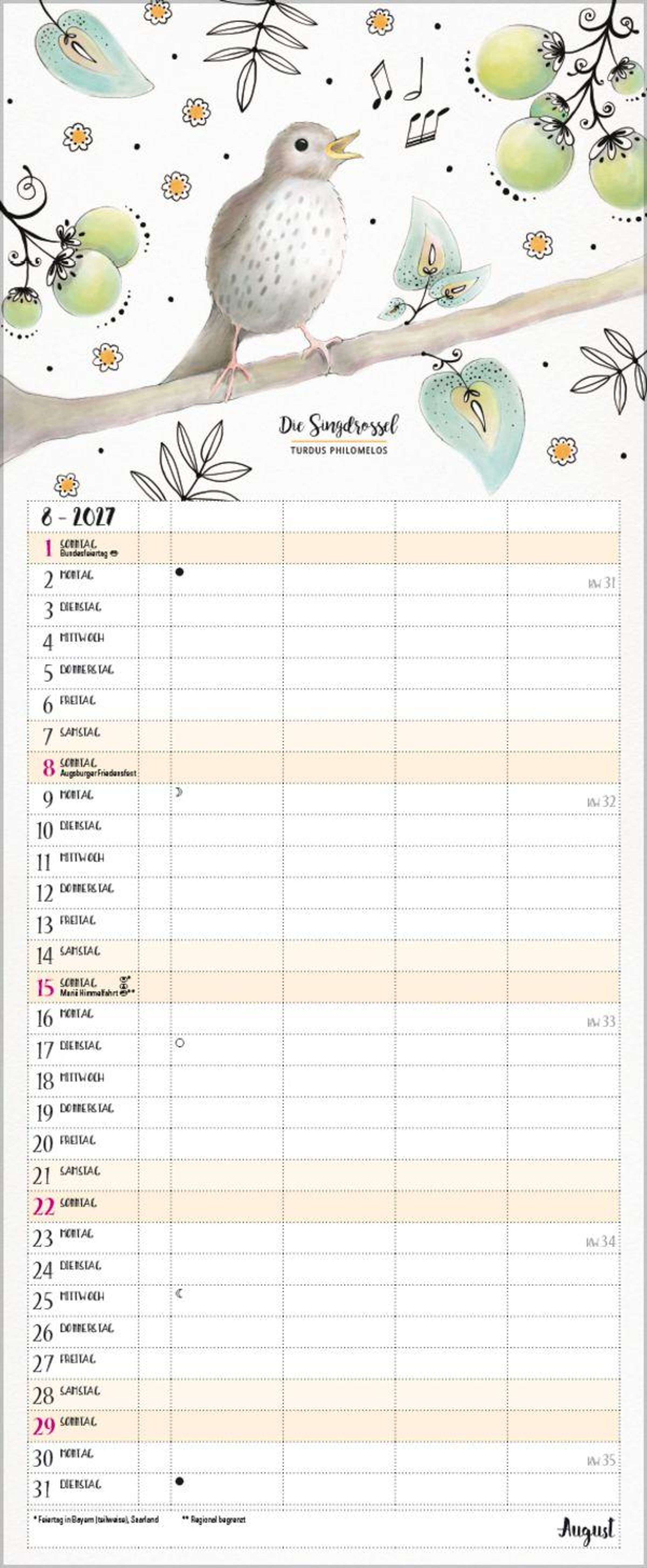 Bezaubernde Vögelchen im Aquarell-Stil mit schwarzen Fineliner-Konturen tummeln sich auf jeder Kalenderseite und begleiten die Familie durchs Jahr. Komplettiert wird jedes Motiv durch den gebräuchlichen sowie den lateinischen Namen jedes Vogels. Ein wunderschöner Planer für Groß und Klein, für Wissbegierige und Vogelliebhaber. 4 Spalten plus Müllspalte, Ferientermine und Vorschau bis März des Folgejahres. Exklusiv entworfen für Korsch.