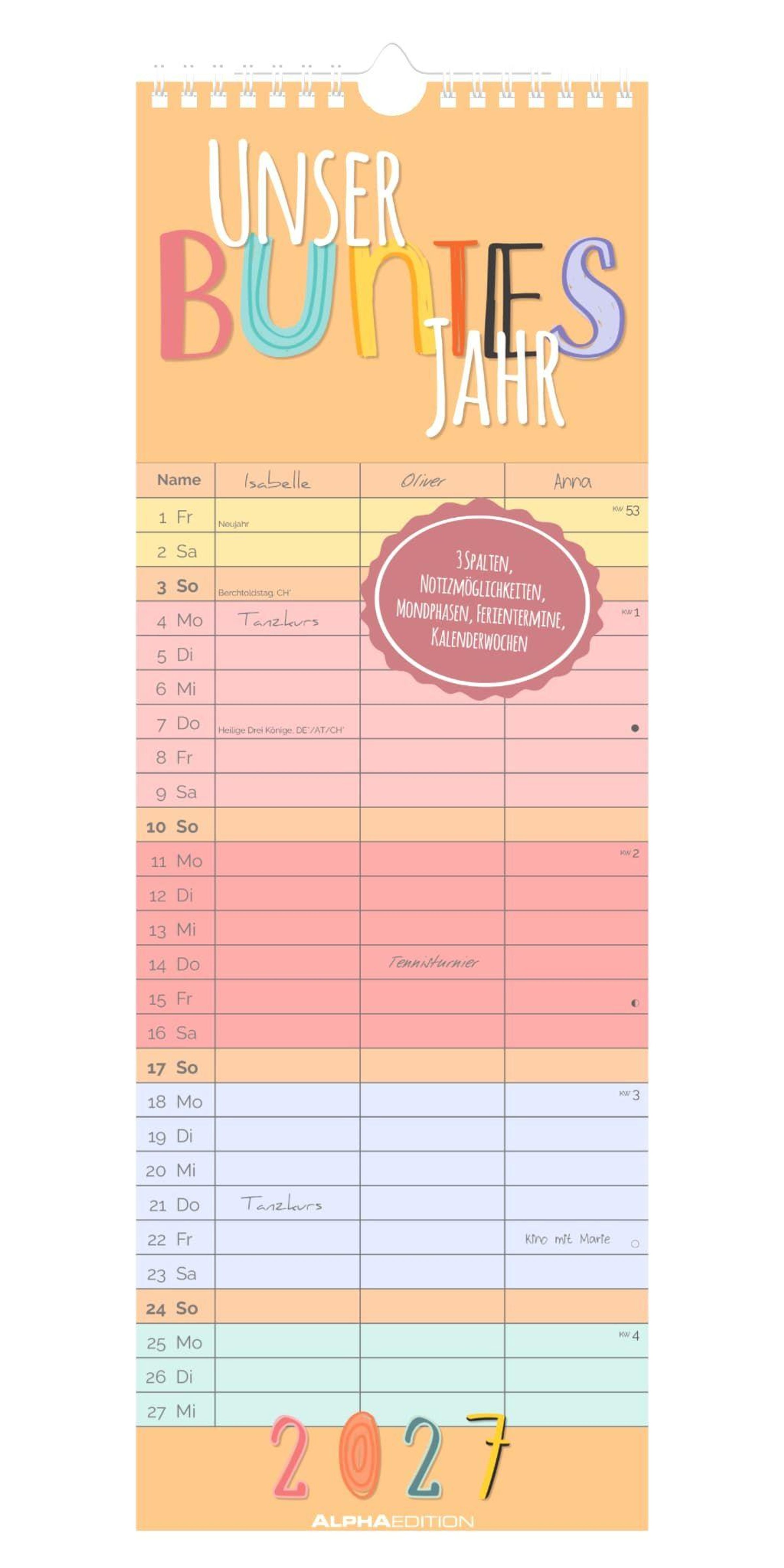Bringen Sie Farbe und Ordnung in Ihren Alltag -- mit dem Alpha Edition -- Unser buntes Jahr 2027. Der schlanke Streifenkalender im praktischen Slim-Notes-Format bietet mit drei Spalten viel Platz für Termine, Aufgaben und Notizen und passt dabei perfekt an jede Wand.