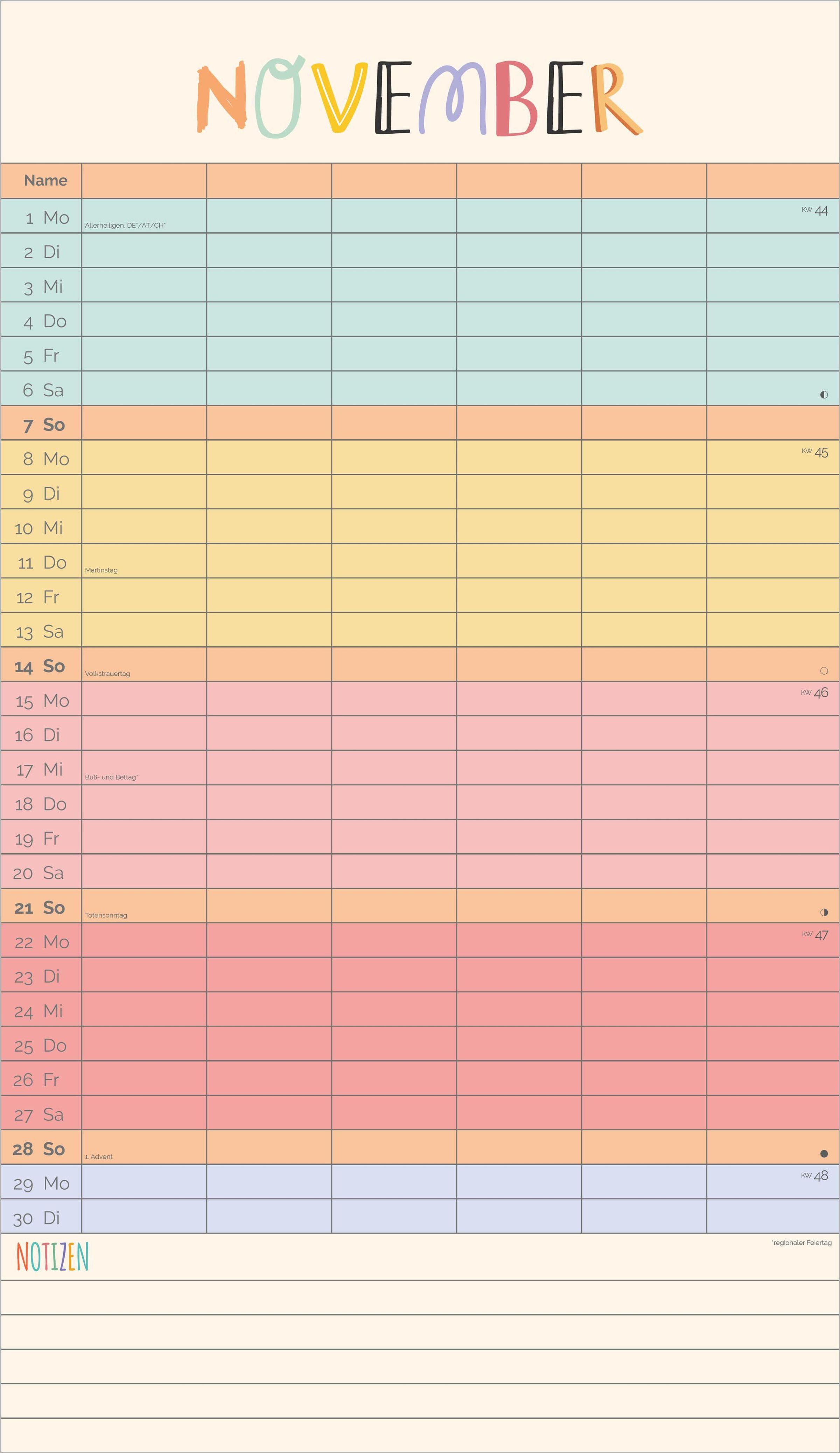 6 Spalten für die ganze Familie: Übersichtliche Eintragung von Terminen, Geburtstagen und Aktivitäten.