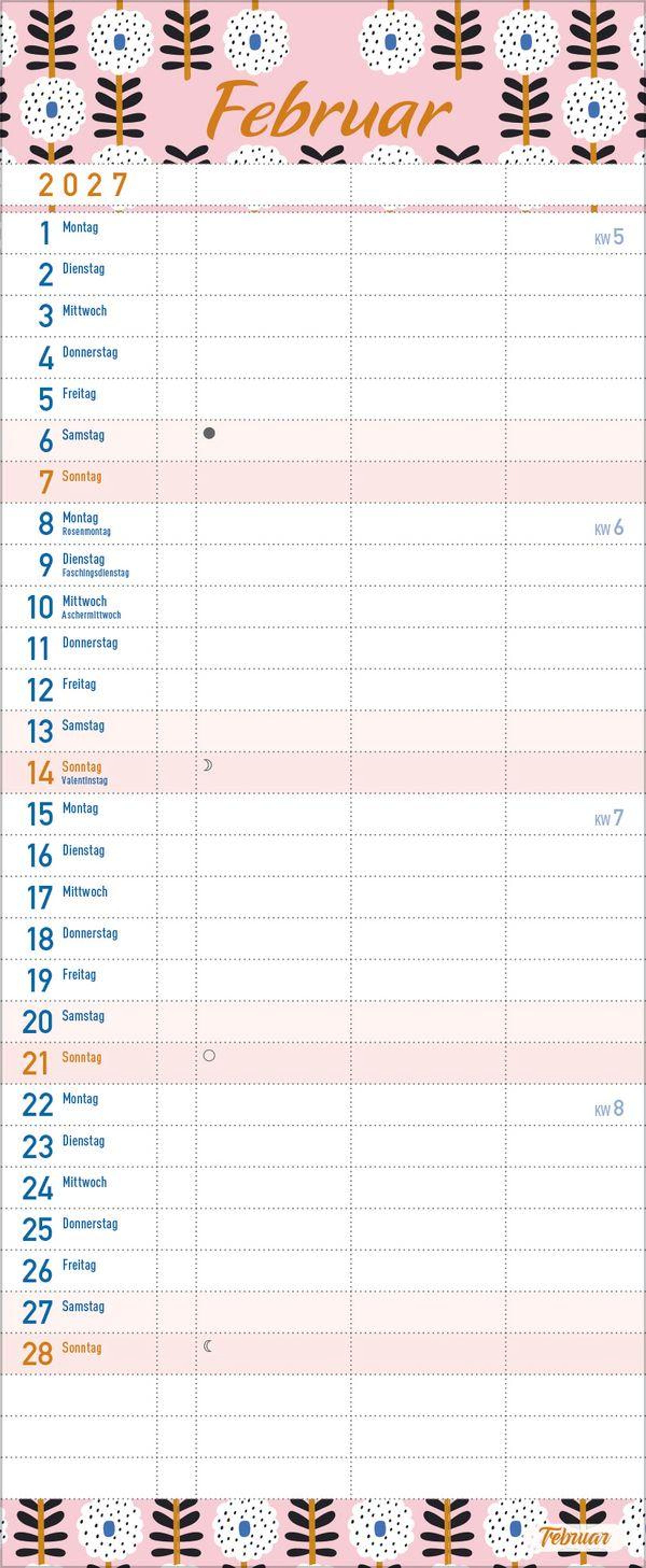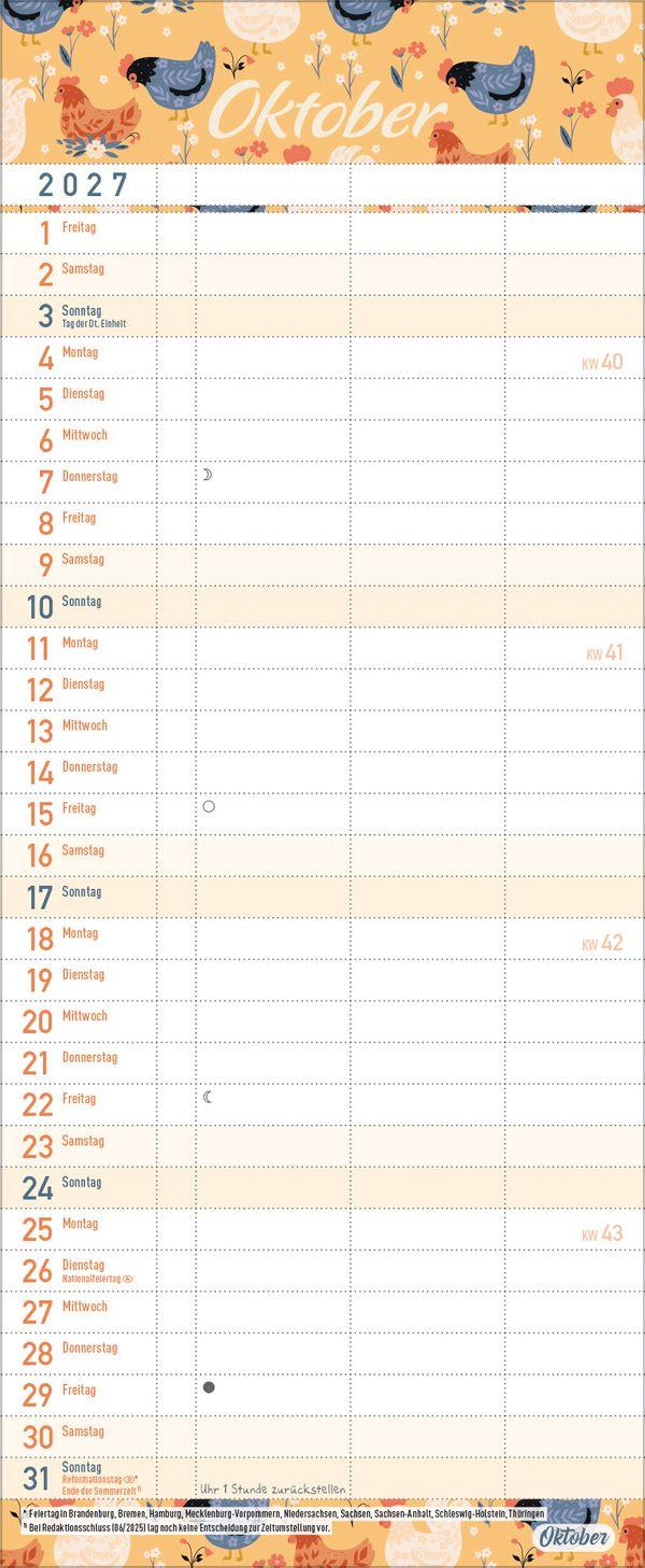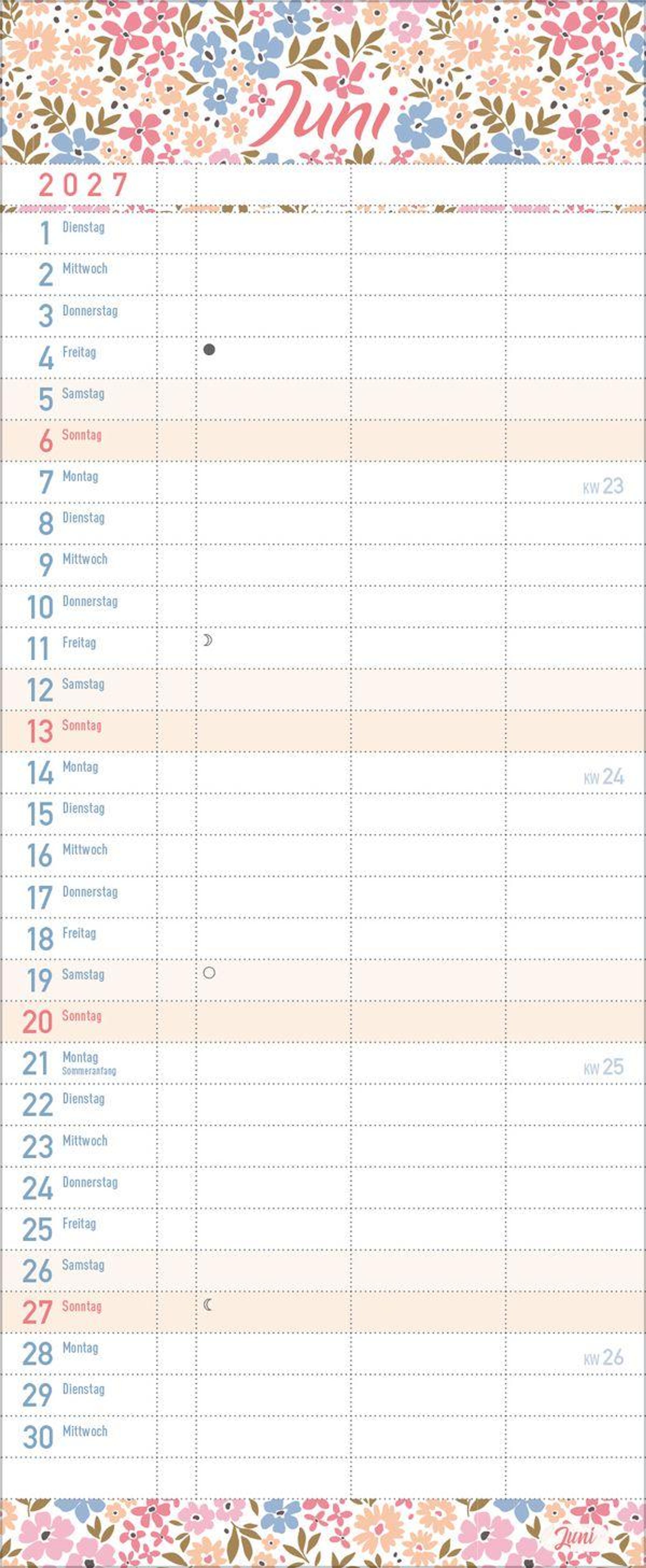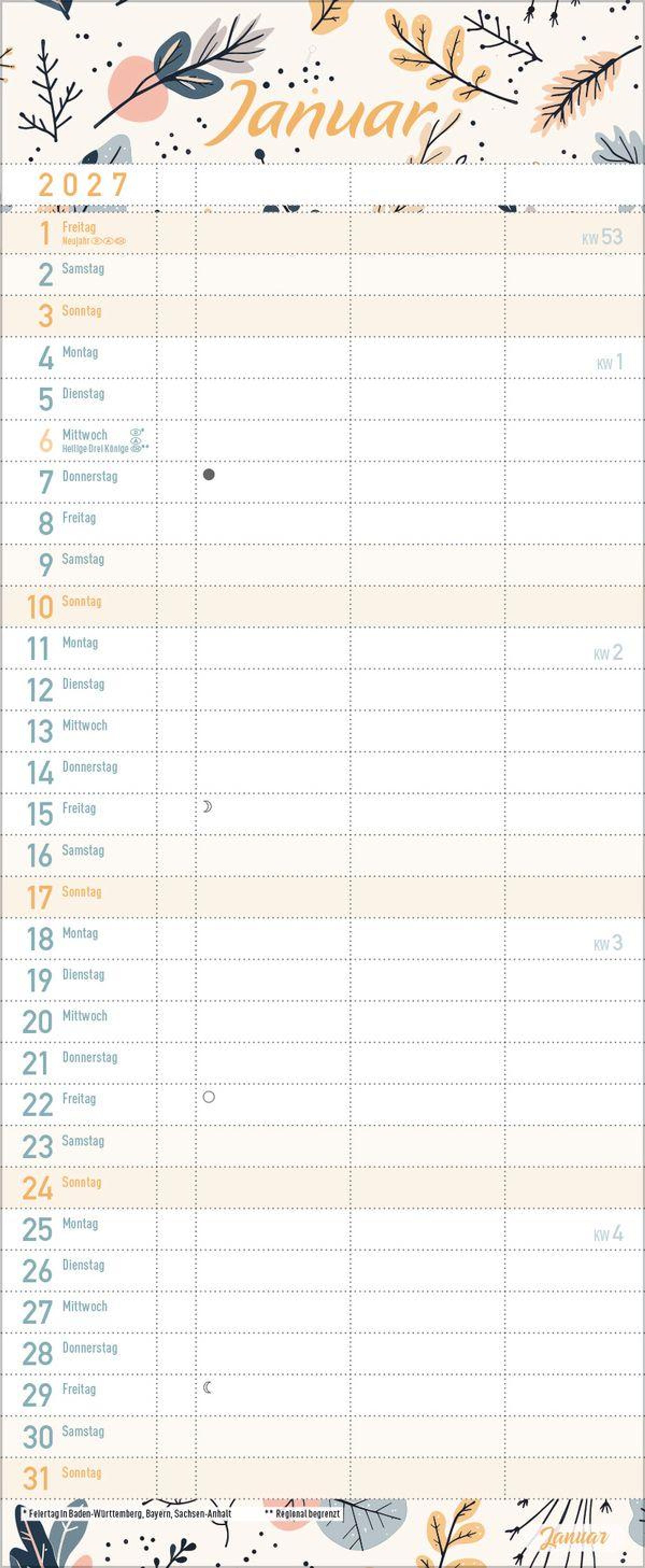 - Familienkalender, 3 Spalten. Familientimer mit Ferienterminen, extra Spalte und Vorschau bis März 2027. Kleines Format: 14 x 34 cm