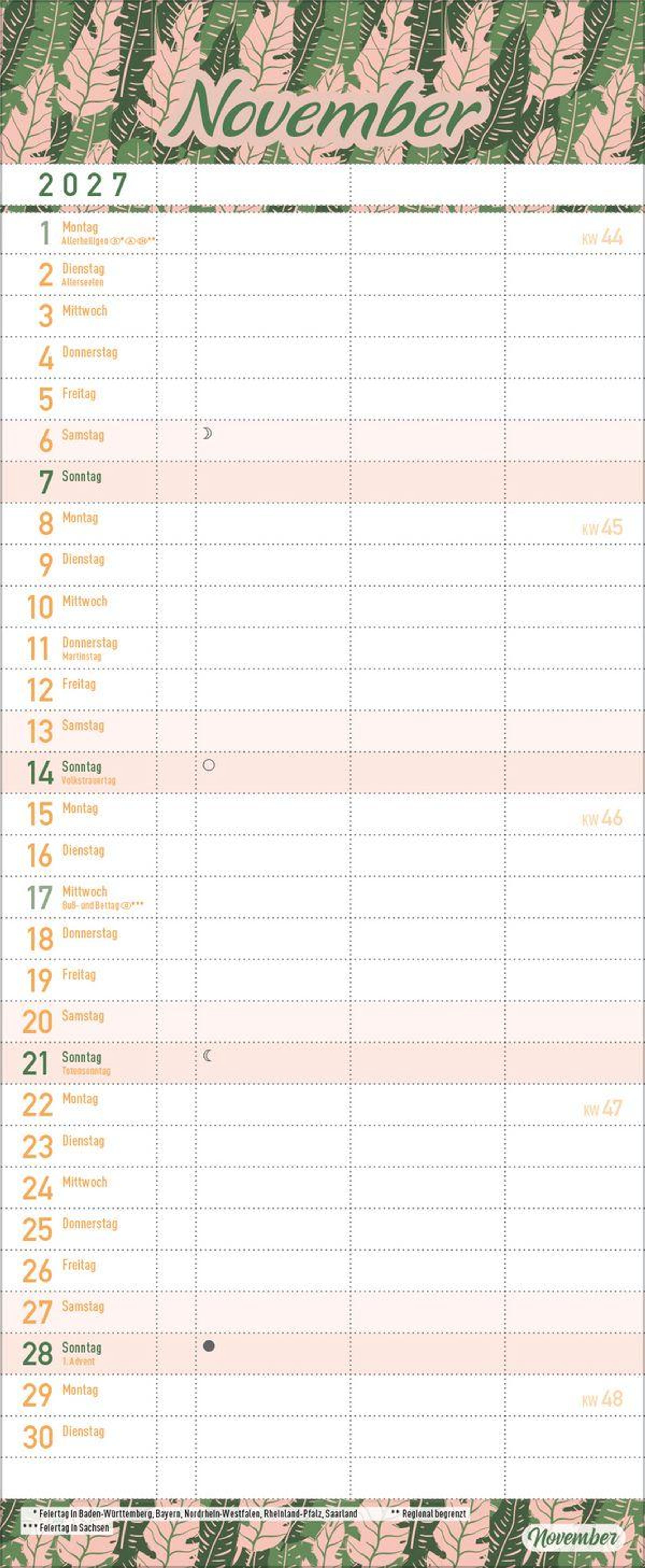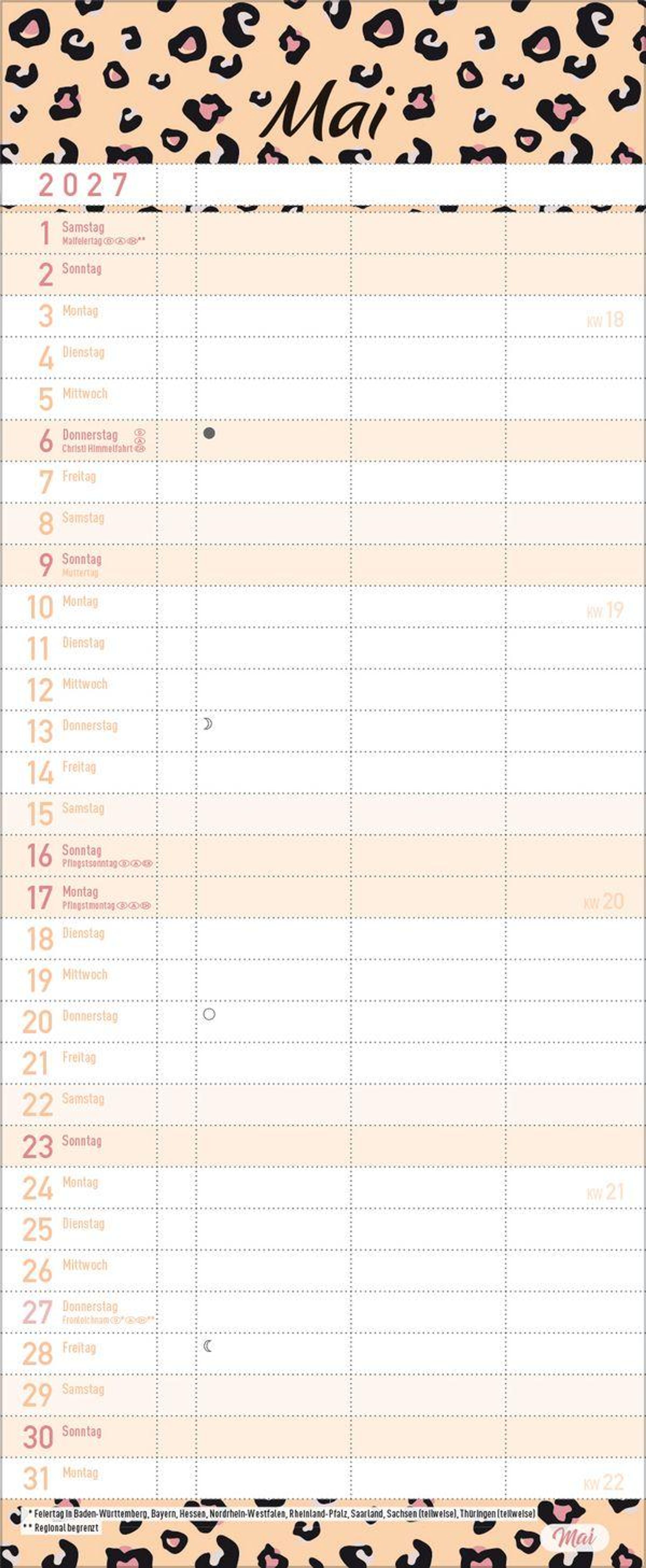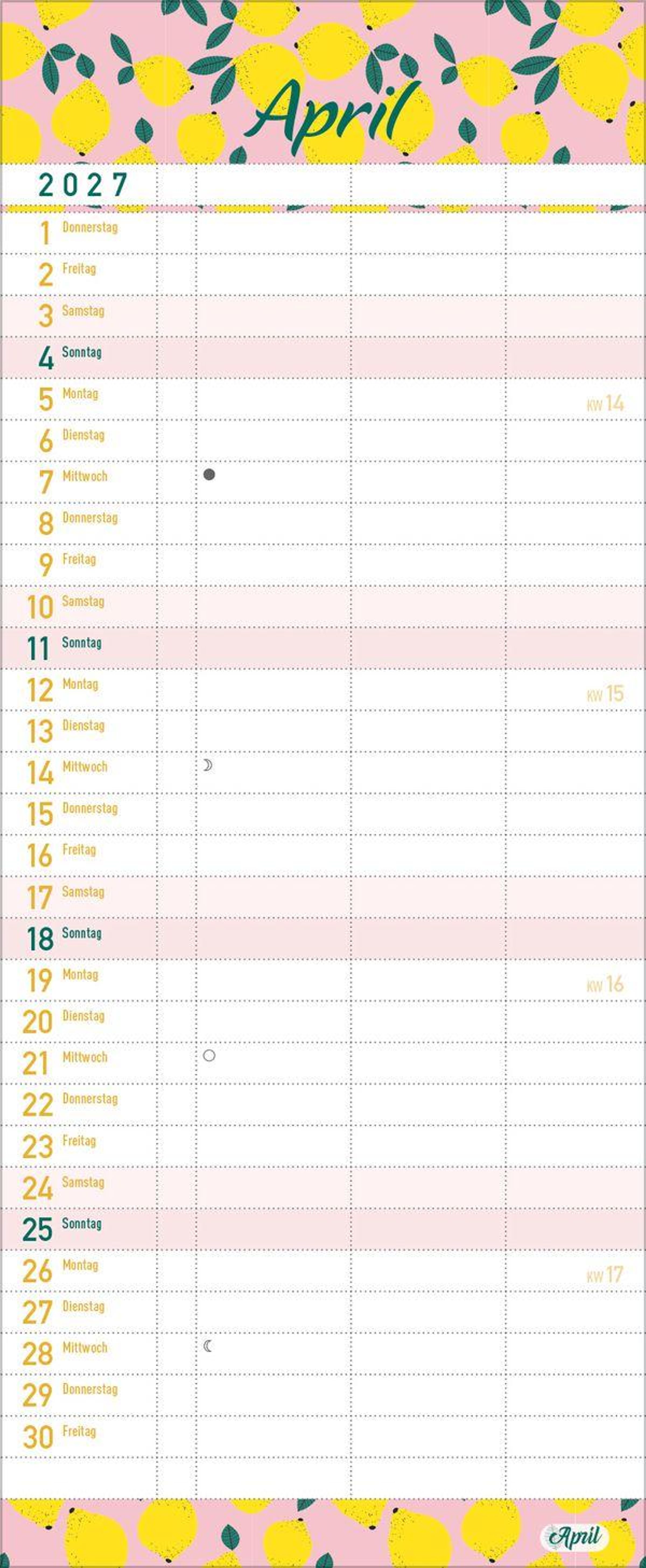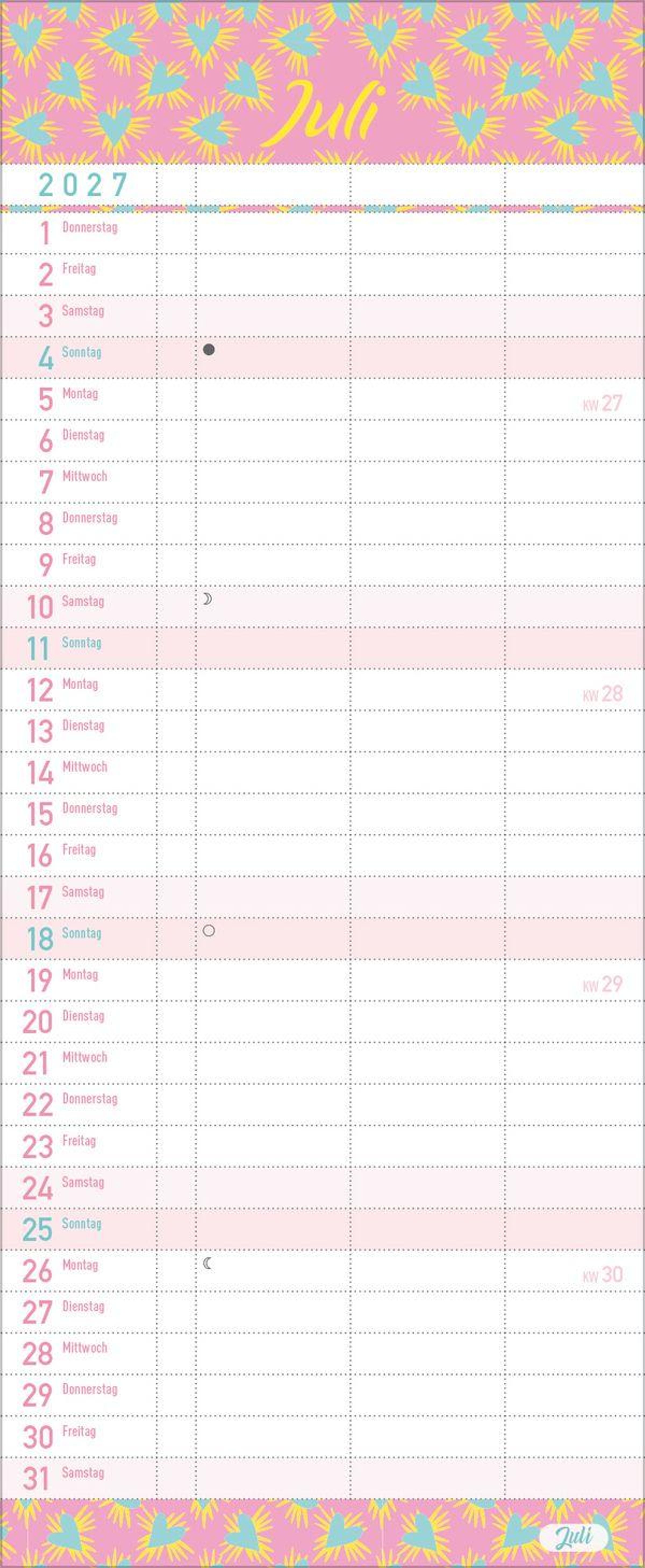 - Familienkalender, 3 Spalten. Familientimer mit Ferienterminen, extra Spalte und Vorschau bis März 2027. Kleines Format: 14 x 34 cm