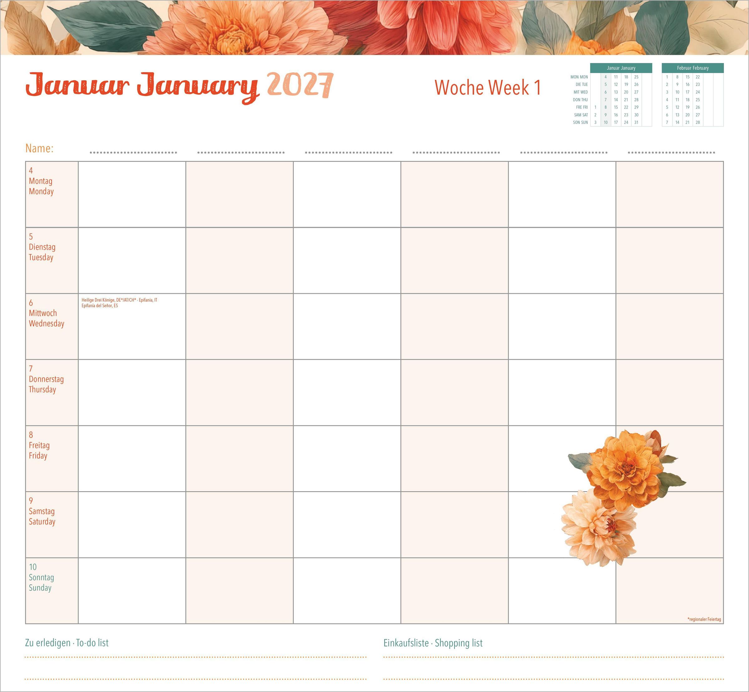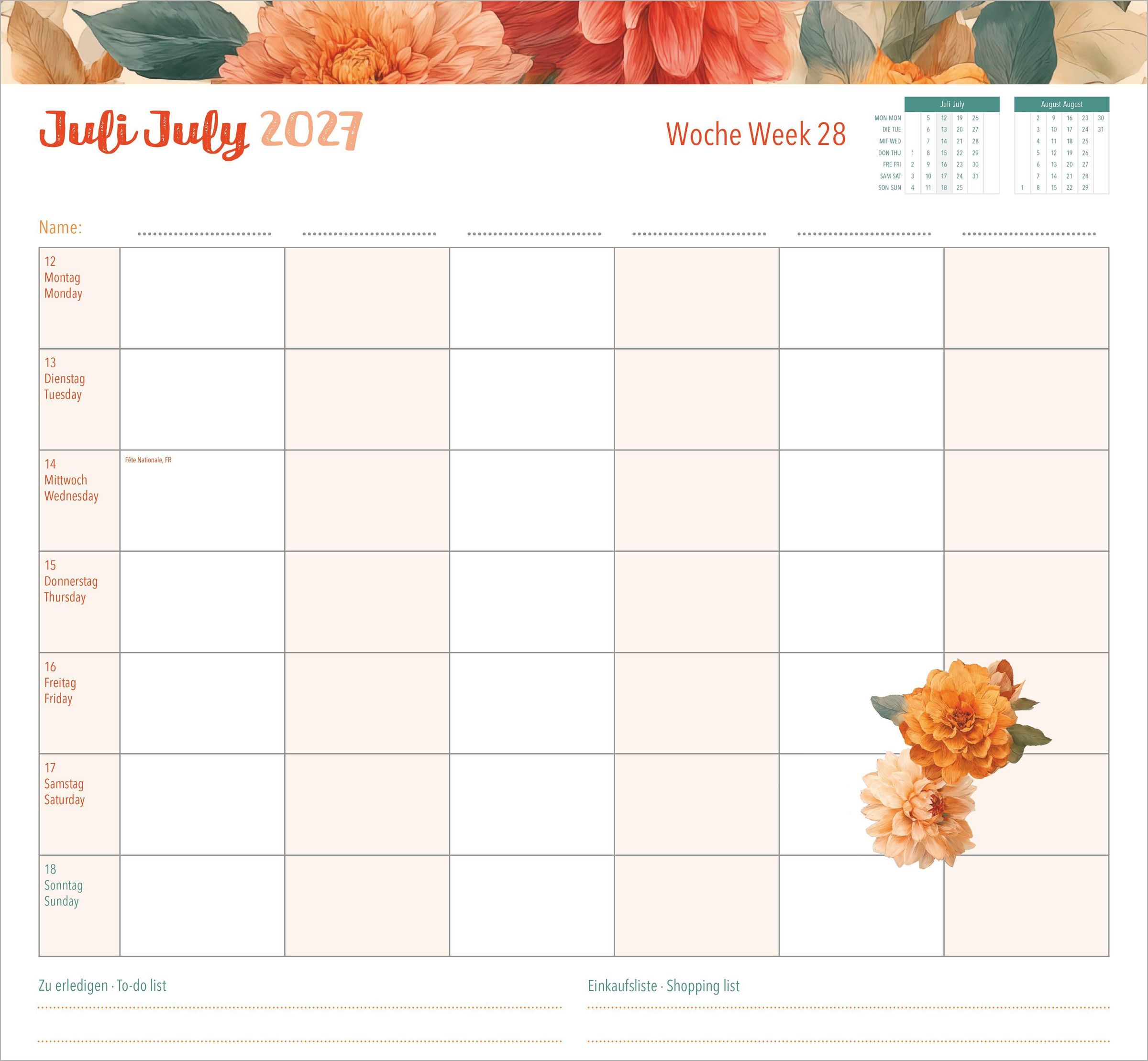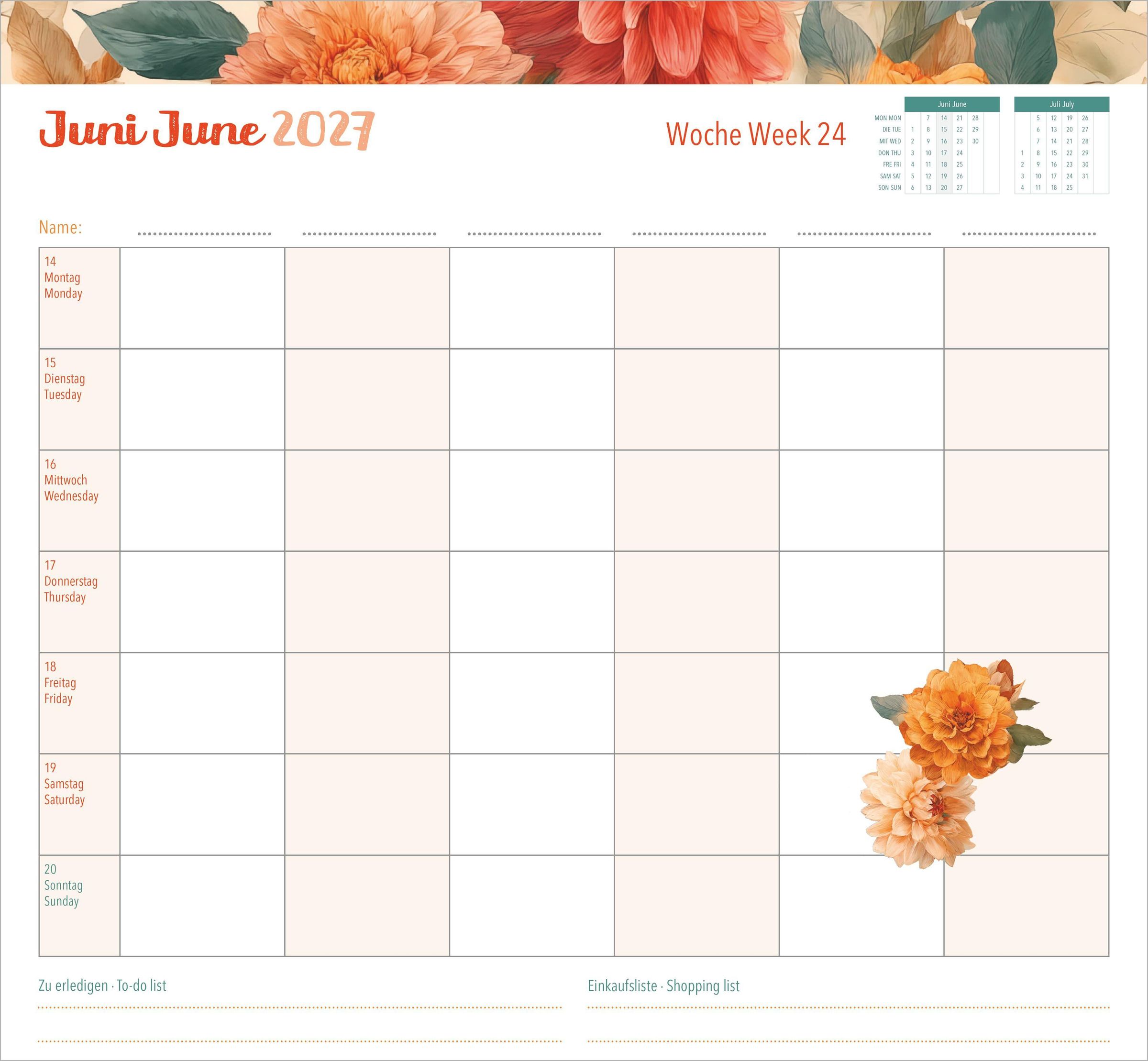 Ein praktischer und zugleich stilvoller Wochenkalender, der Organisation leicht macht und den Familienalltag mit frischem Blumen-Charme begleitet.