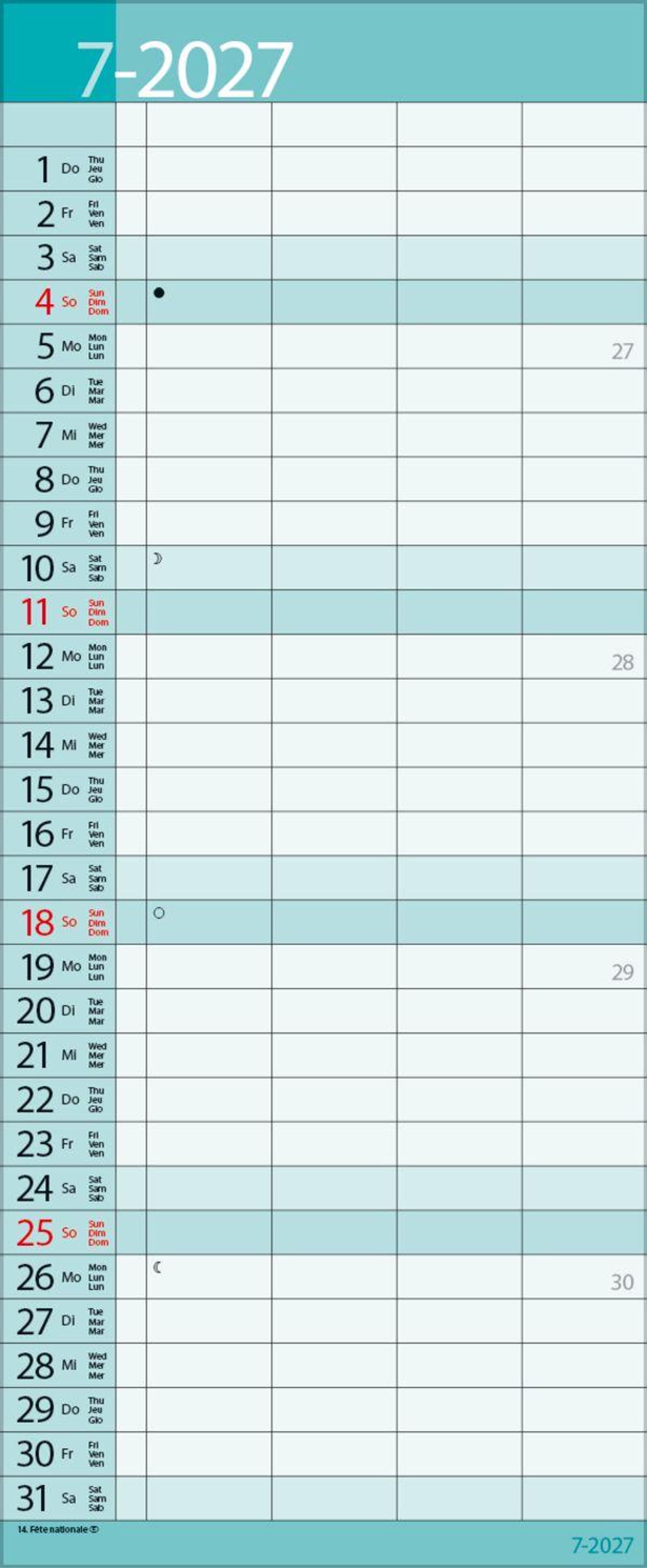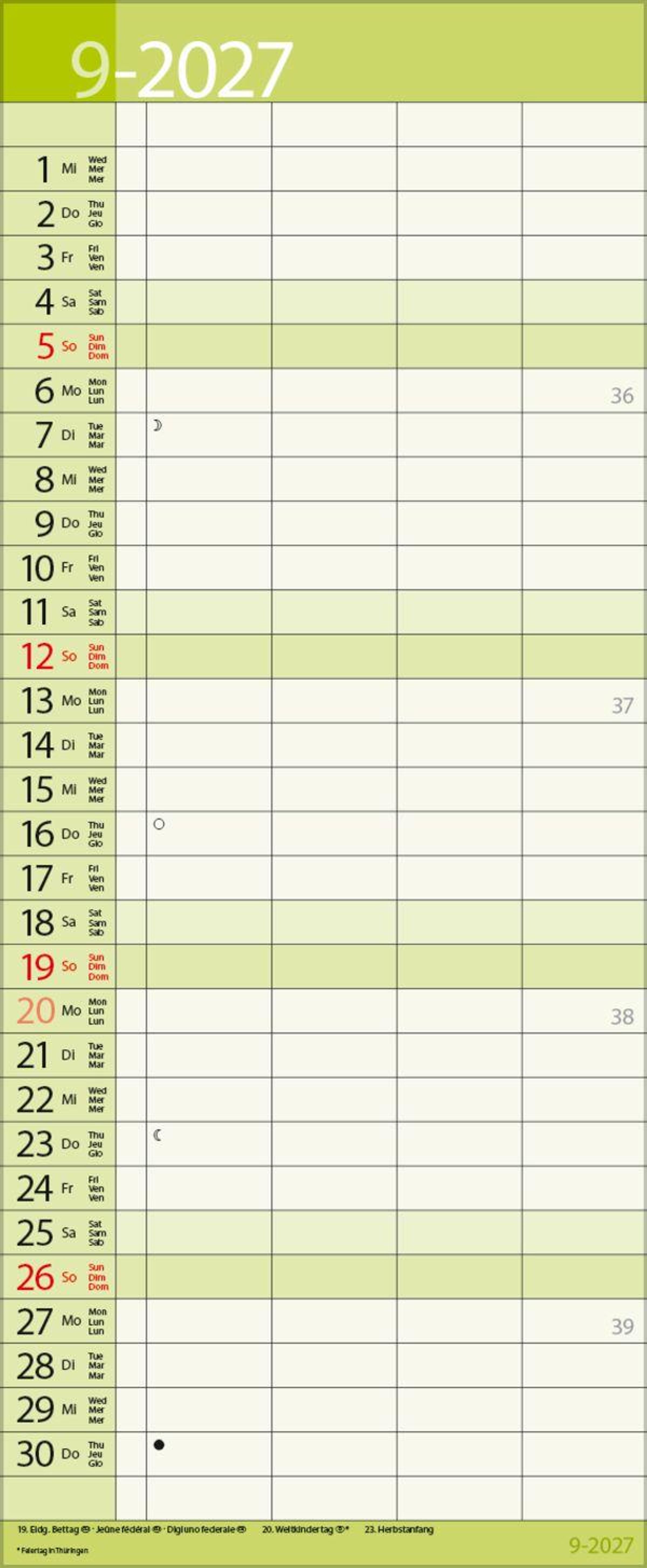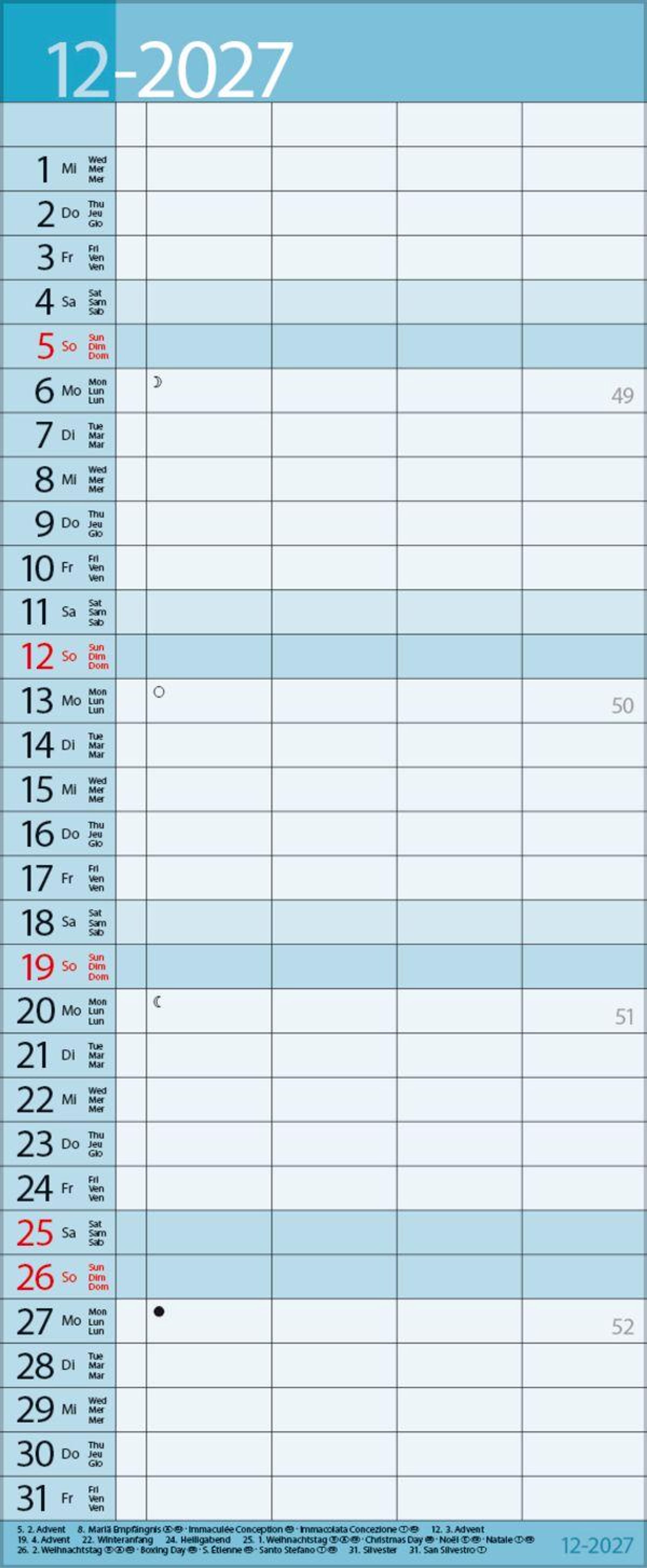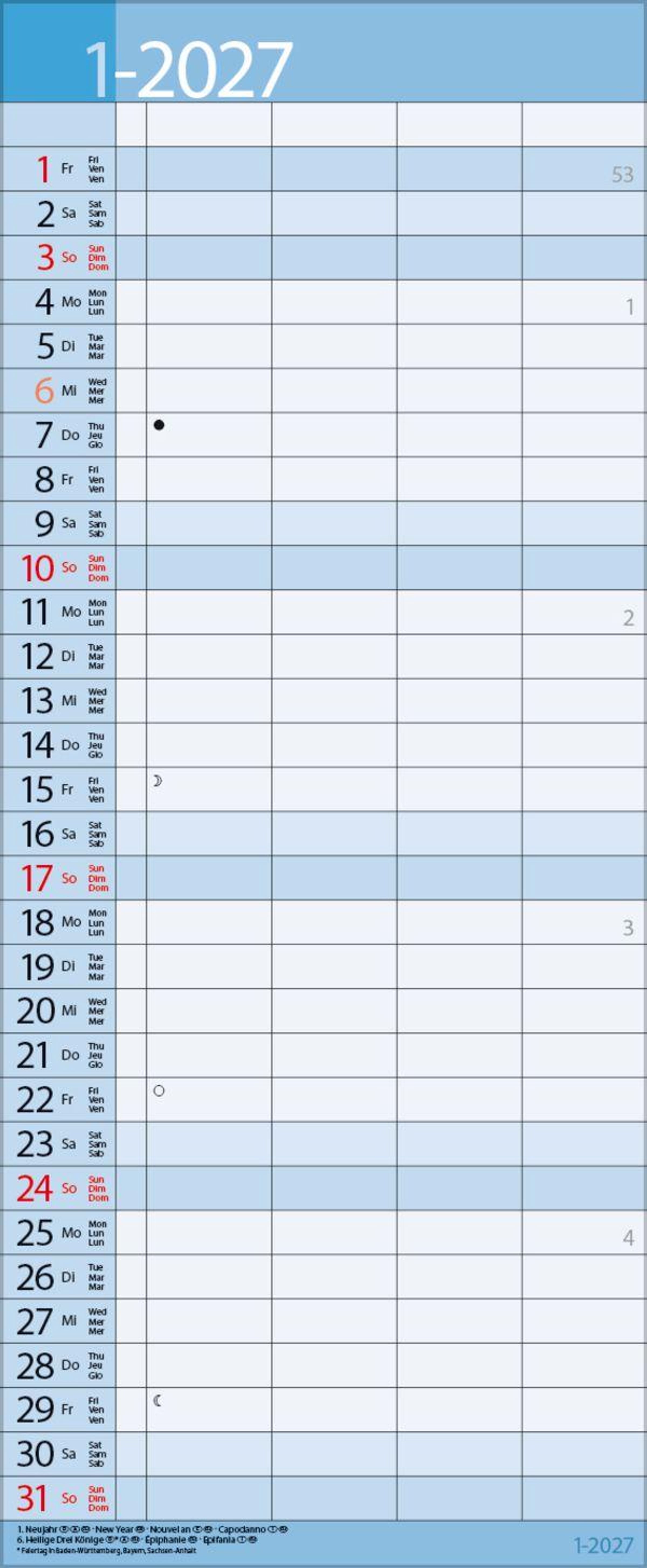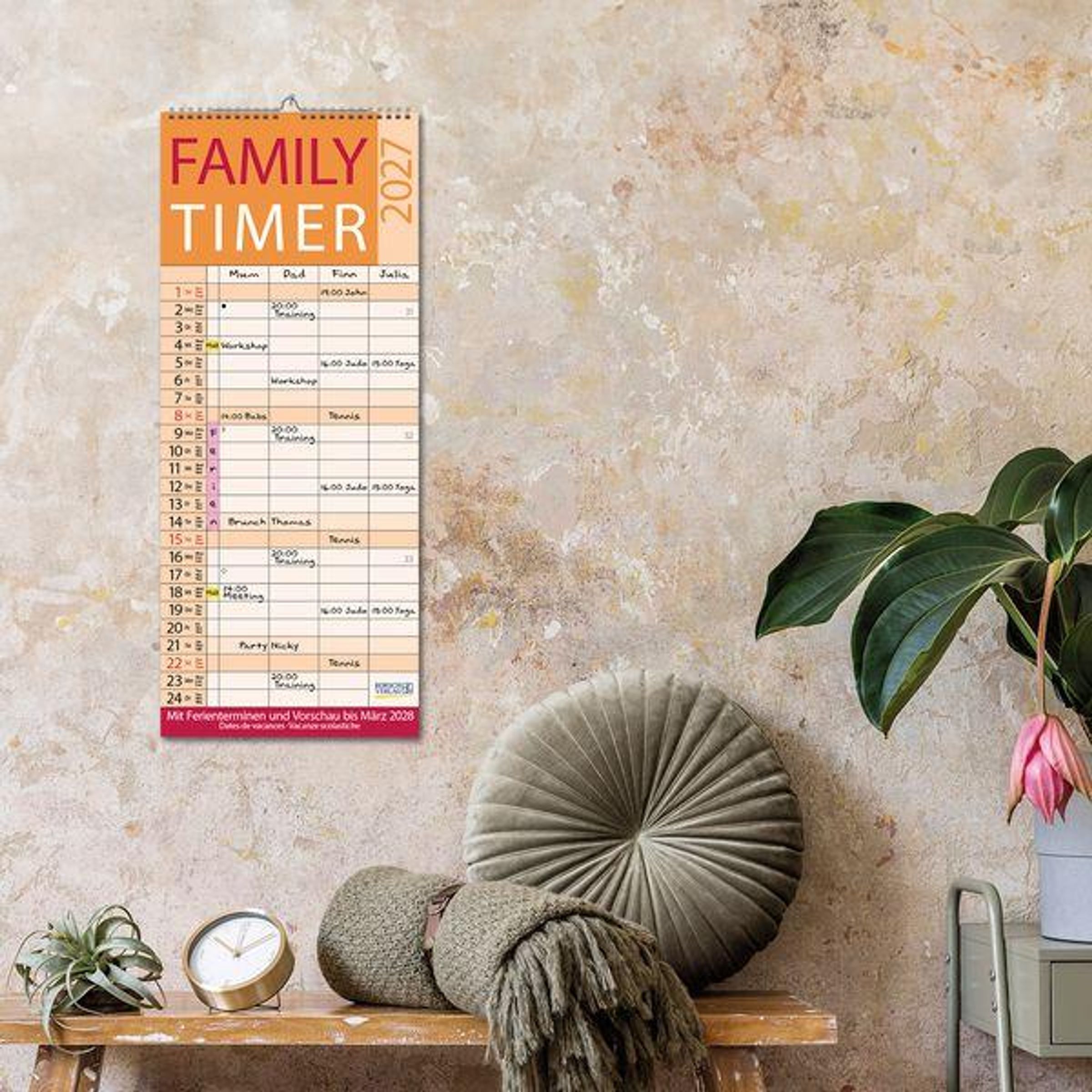 - Familienplaner mit 4 breiten Spalten. Hochwertiger Familienkalender mit Ferienterminen, Vorschau bis März 2027 und nützlichen Zusatzinformationen.