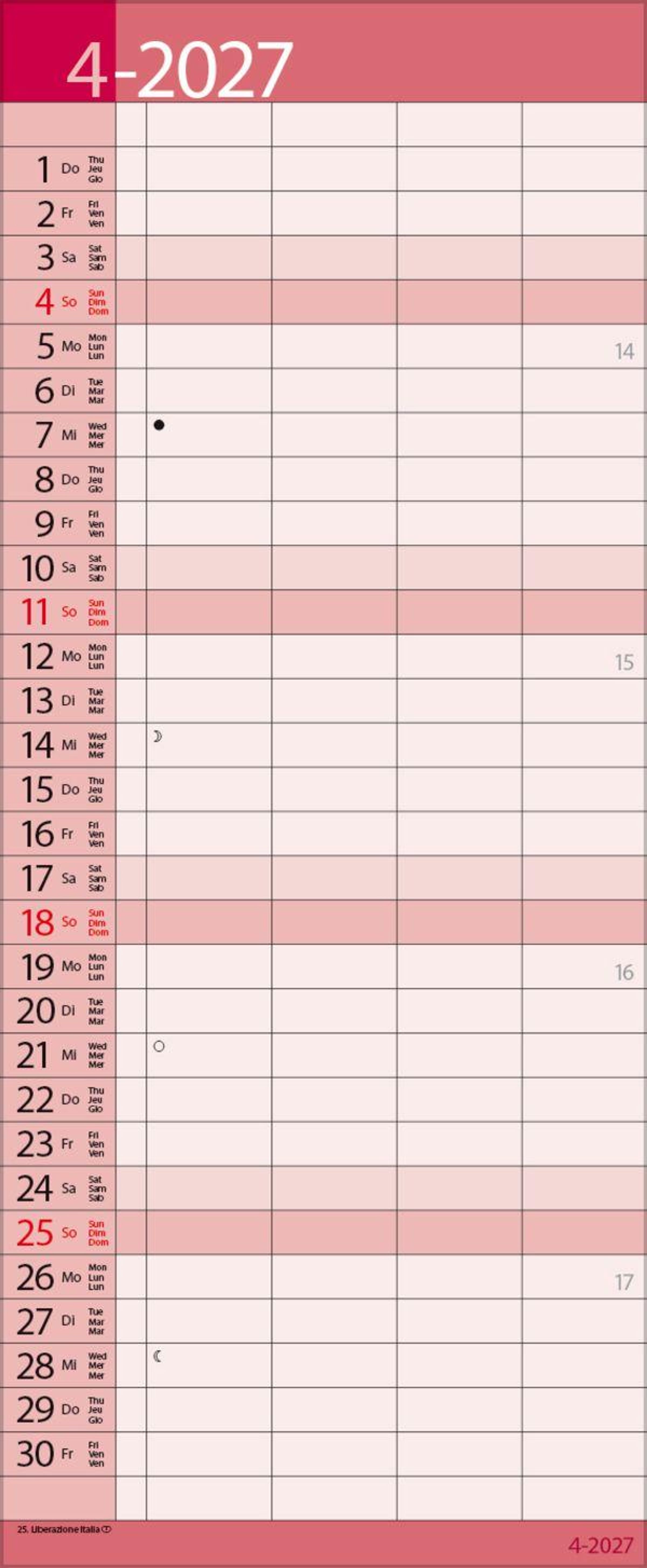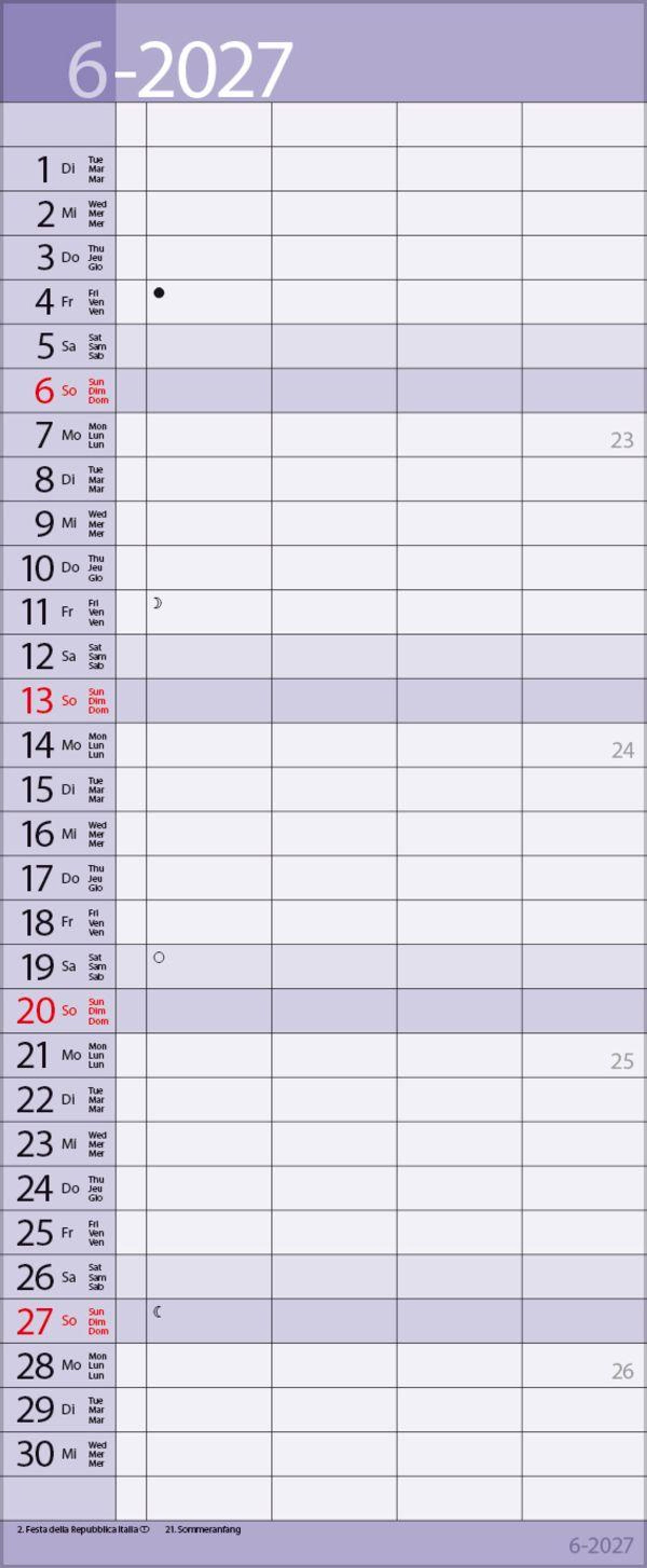 - Mehrsprachiges Kalendarium (d, e,f, i) mit regionalen Feiertagen für Deutschland, Österreich und Schweiz