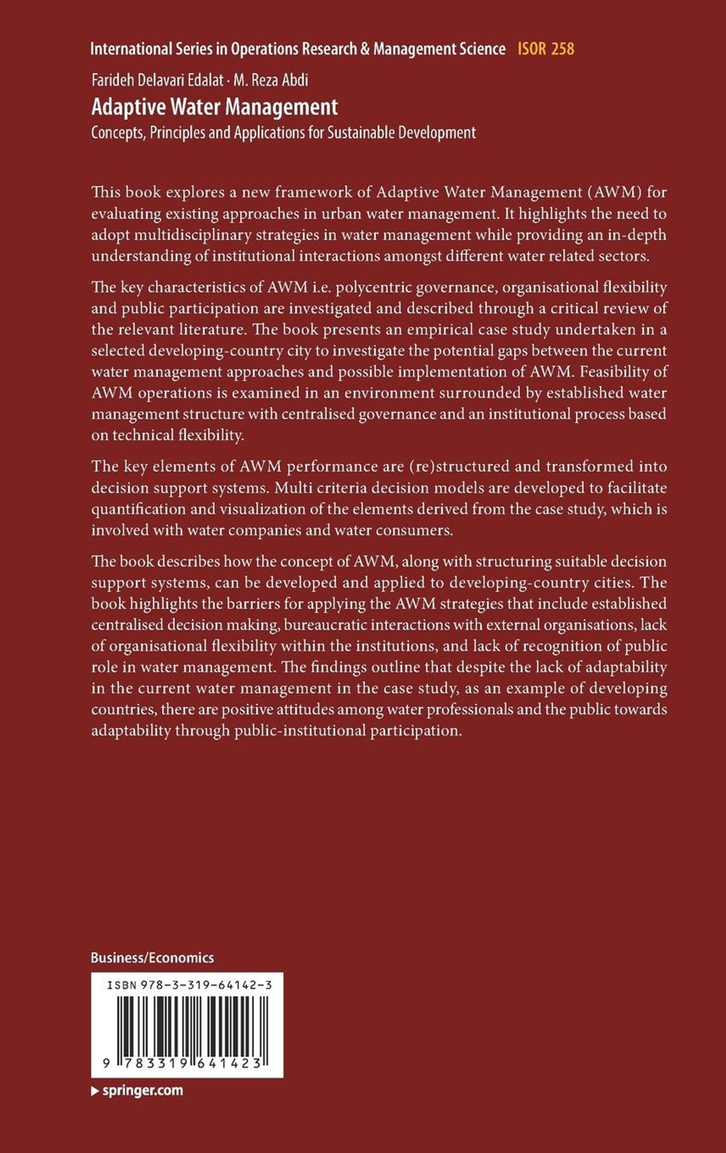 This book explores a new framework of Adaptive Water Management (AWM) for evaluating existing approaches in urban water management. It highlights the need to adopt multidisciplinary strategies in water management while providing an in-depth understanding of institutional interactions amongst different water related sectors. The key characteristics of AWM i. e. polycentric governance, organisational flexibility and public participation are investigated and described through a critical review of the relevant literature. The book presents an empirical case study undertaken in a selected developing-country city to investigate the potential gaps between the current water management approaches and possible implementation of AWM. Feasibility of AWM operations is examined in an environment surrounded by established water management structure with centralised governance and an institutional process based on technical flexibility. The key elements of AWM performance are (re)structured and transformed into decision support systems. Multi criteria decision models are developed to facilitate quantification and visualization of the elements derived from the case study, which is involved with water companies and water consumers. The book describes how the concept of AWM, along with structuring suitable decision support systems, can be developed and applied to developing-country cities. The book highlights the barriers for applying the AWM strategies that include established centralised decision making, bureaucratic interactions with external organisations, lack of organisational flexibility within the institutions, and lack of recognition of public role in water management. The findings outline that despite the lack of adaptability in the current water management in the case study, as an example of developing countries, there are positive attitudes among water professionals and the public towards adaptability through public-institutional participation.