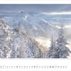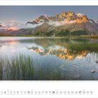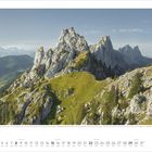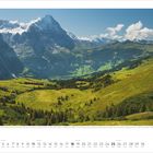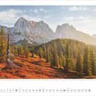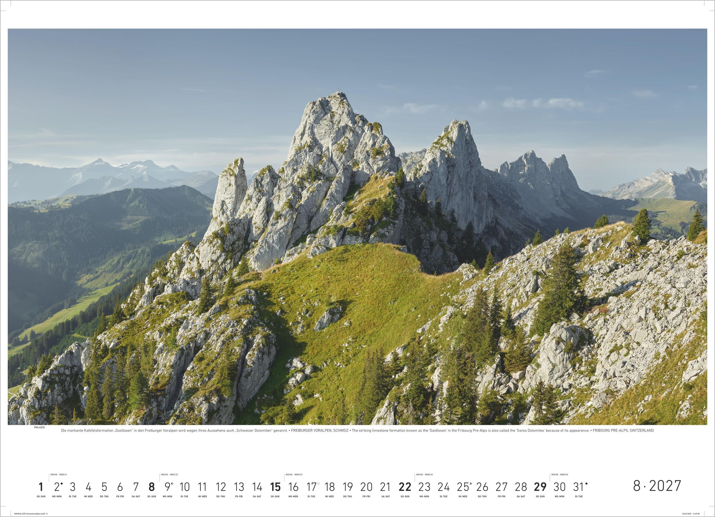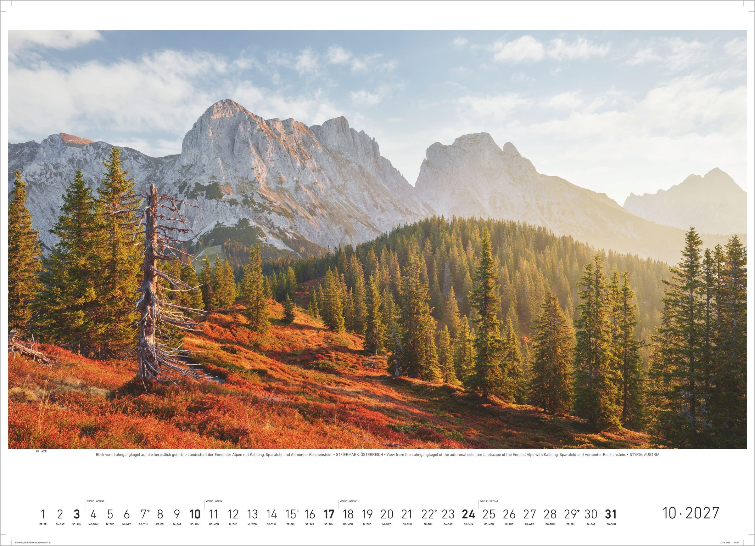 "Vorjahresabbildung" in großen Buchstaben, Alpenlandschaft mit Bäumen und massiven Felsen unter blauem Himmel., Kalender