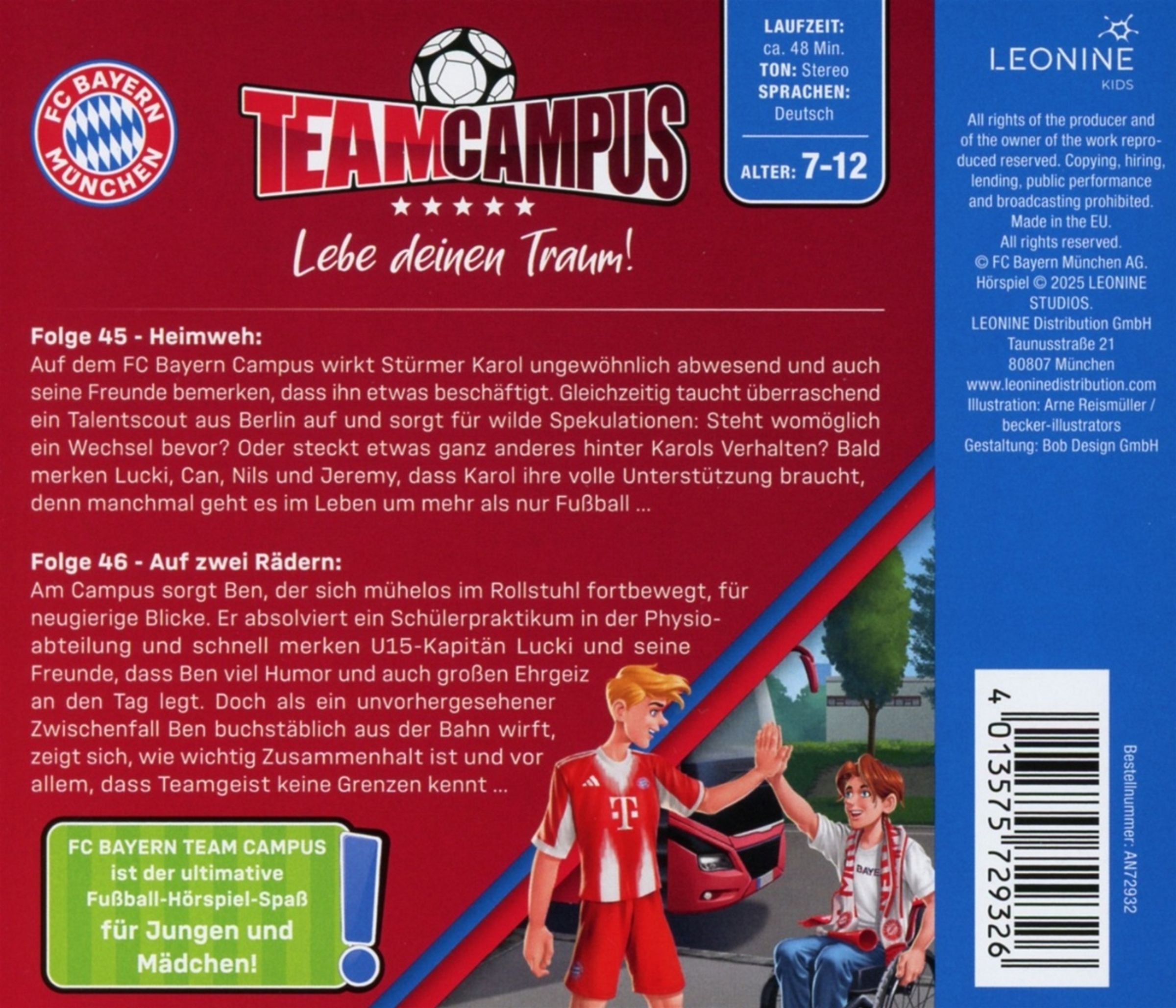 Logo: FC Bayern München. Text: TEAMCAMPUS, Folge 45 Heimweh, Folge 46 Auf zwei Rädern. Illustration: Spieler begrüßen sich., CD