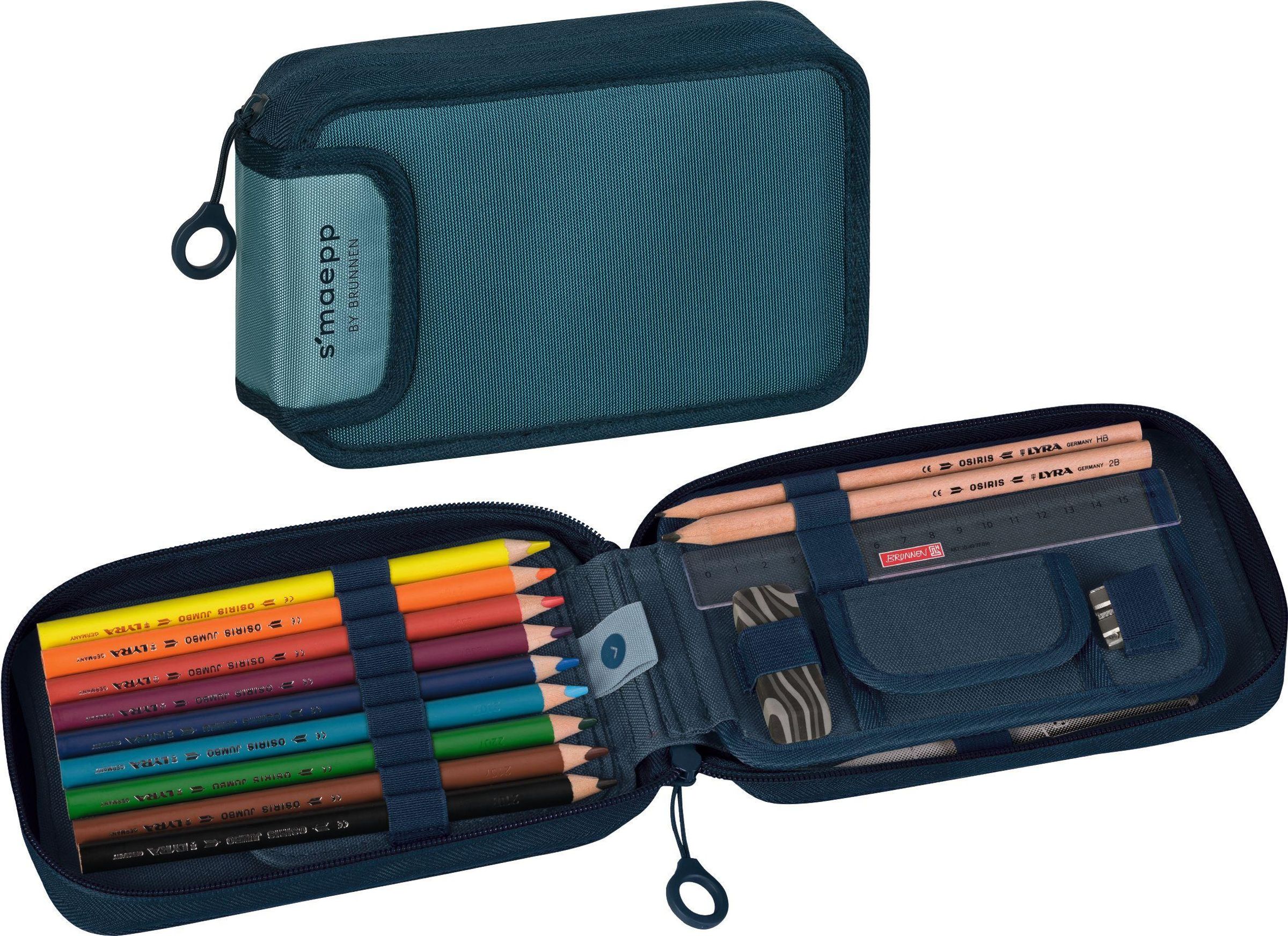 B/H/T: 200×125×45 mm ? Kunstfaser, Farbe: denim ? Inhalt: 9 dicke Markenbuntstifte, 2 Markenbleistifte, Lineal 16 cm, Metalldoppelspitzer, Radiergummi, Geldfach mit Klettverschluss, Stundenplan, Zeichenschablone ? innovative Stifterampe für leichteres Entnehmen, horizontales Öffnen spart Platz auf dem Schreibtisch, mit ergonomischem Zipper für müheloses Öffnen und Schließen