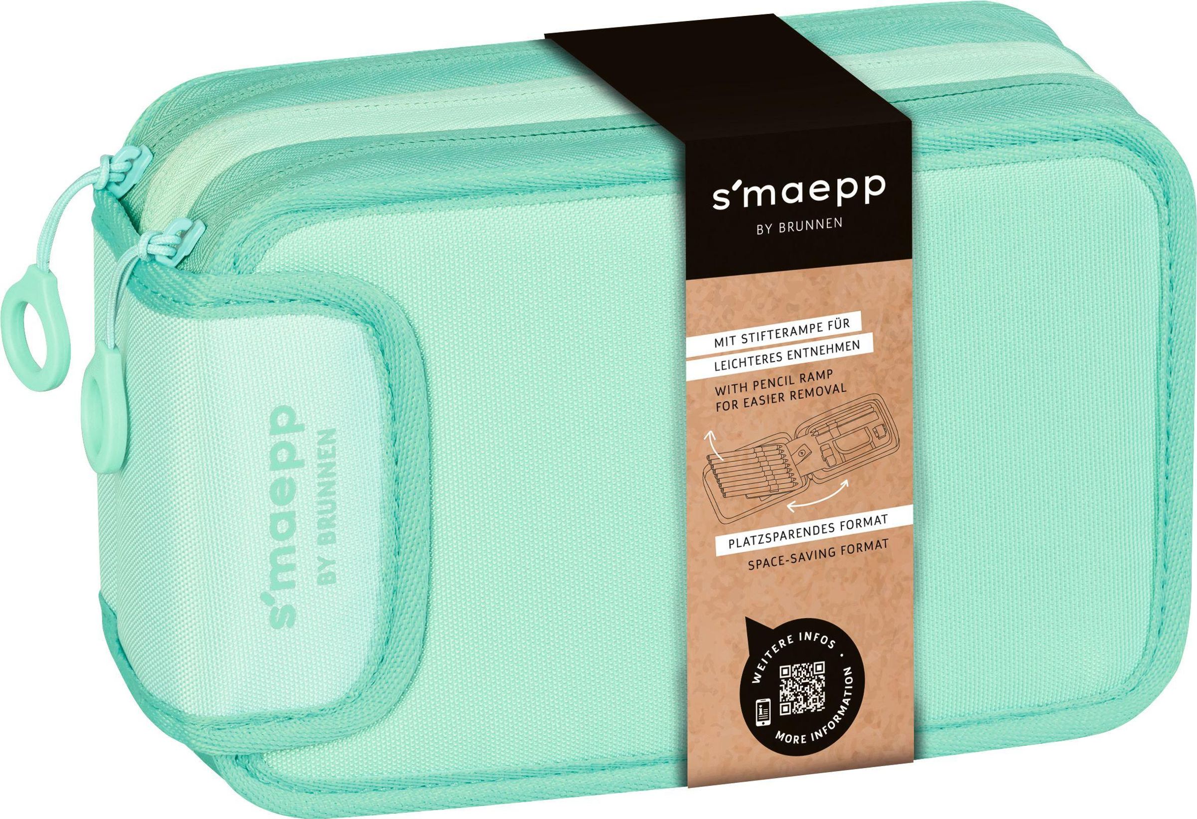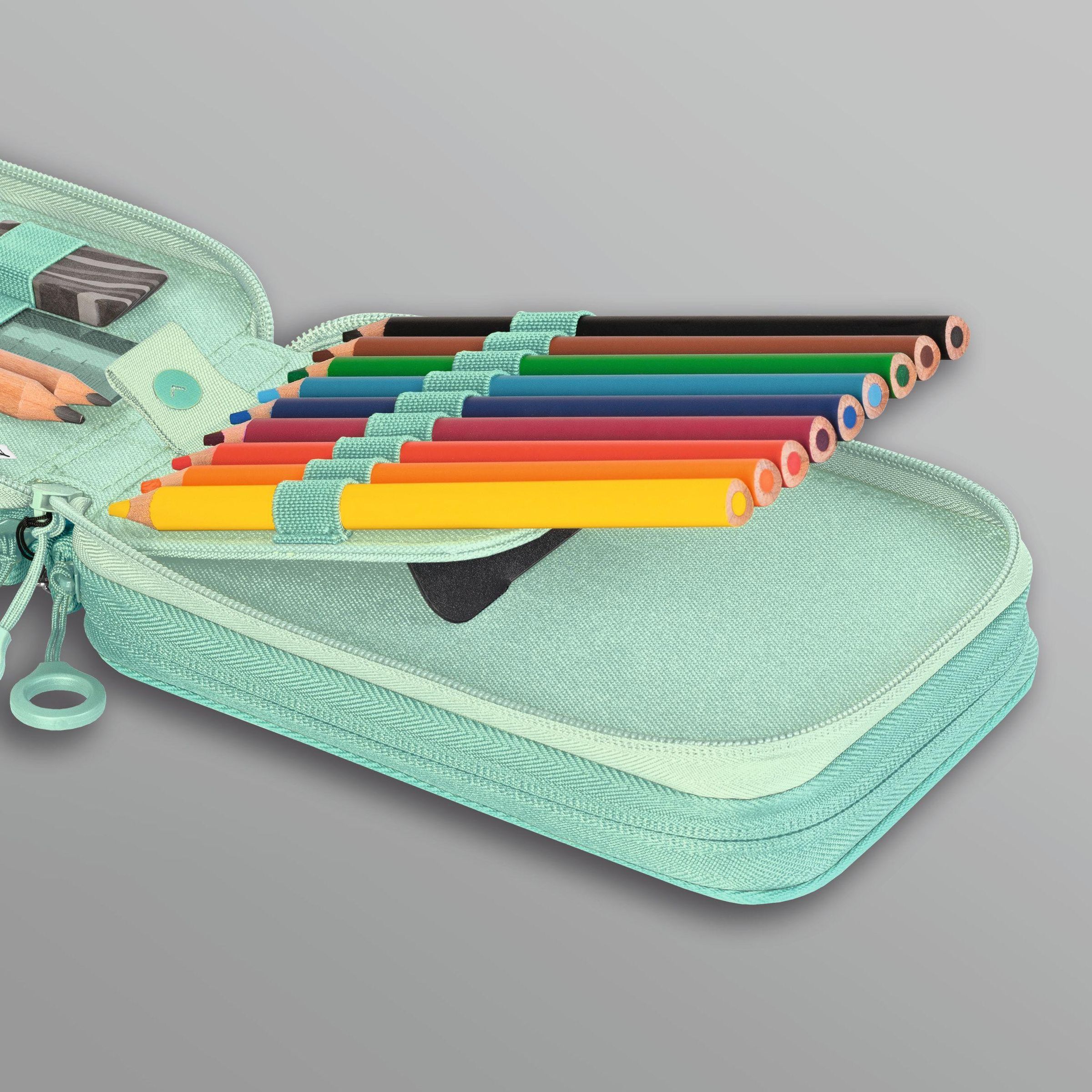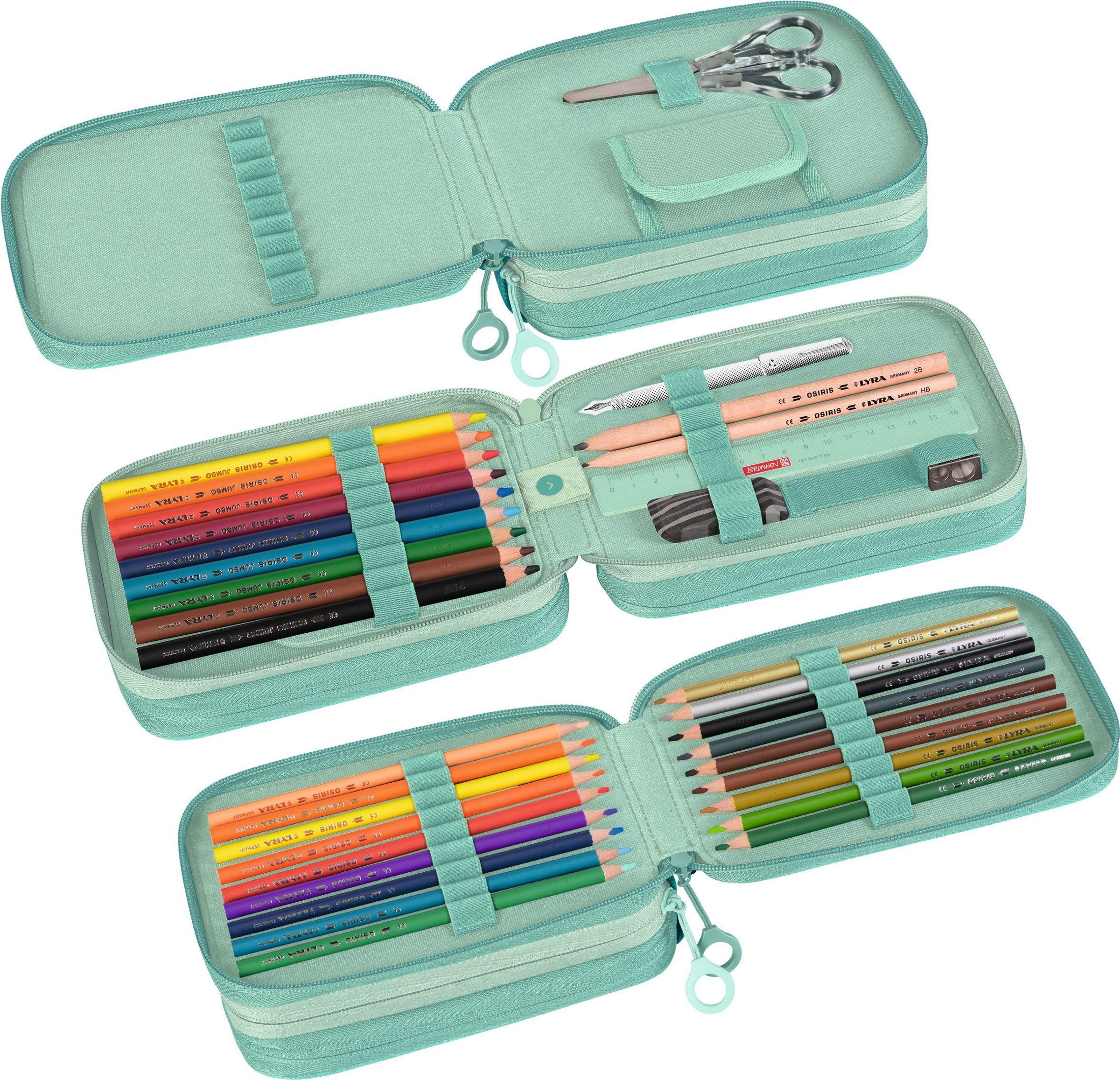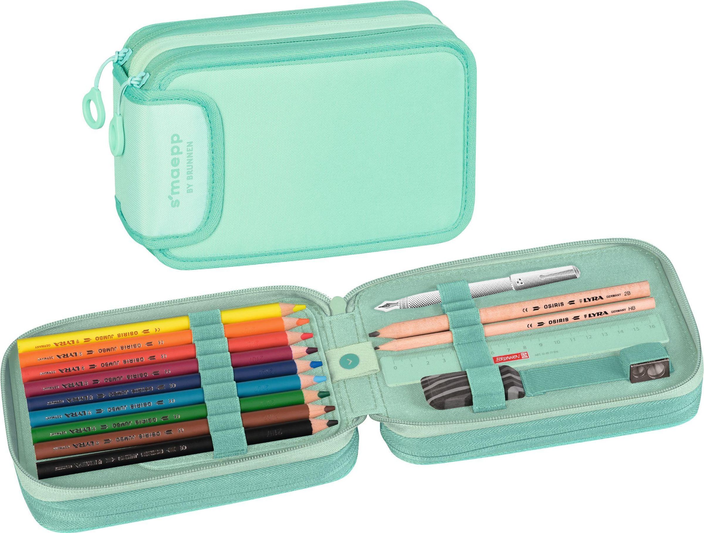 B/H/T: 200×125×75 mm ? Kunstfaser, Farbe: mint ? 3 Reißverschlüsse ? Inhalt: 18 dünne Markenbuntstifte, 9 dicke Markenbuntstifte, 2 Markenbleistifte, Lineal 16 cm, Metalldoppelspitzer, Radiergummi, Kinderschere, Geldfach mit Klettverschluss ? innovative Stifterampe für leichteres Entnehmen, horizontales Öffnen spart Platz auf dem Schreibtisch, mit ergonomischem Zipper für müheloses Öffnen und Schließen