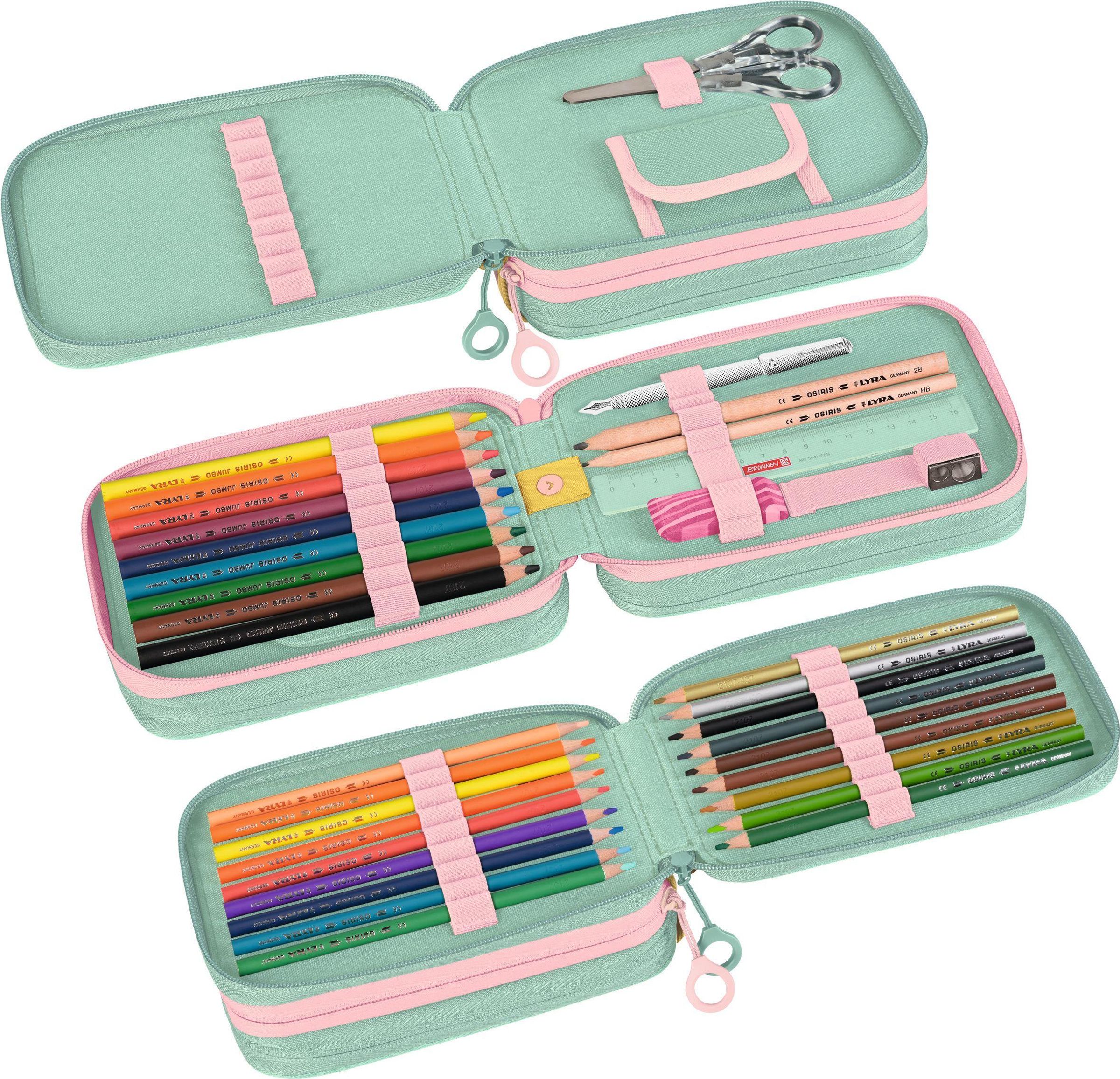 B/H/T: 200×125×75 mm ? Kunstfaser, Farbe: mehrfarbig, pastell ? mit Anhänger ? 3 Reißverschlüsse ? Inhalt: 18 dünne Markenbuntstifte, 9 dicke Markenbuntstifte, 2 Markenbleistifte, Lineal 16 cm, Metalldoppelspitzer, Radiergummi, Kinderschere, Geldfach mit Klettverschluss ? innovative Stifterampe für leichteres Entnehmen, horizontales Öffnen spart Platz auf dem Schreibtisch, mit ergonomischem Zipper für müheloses Öffnen und Schließen