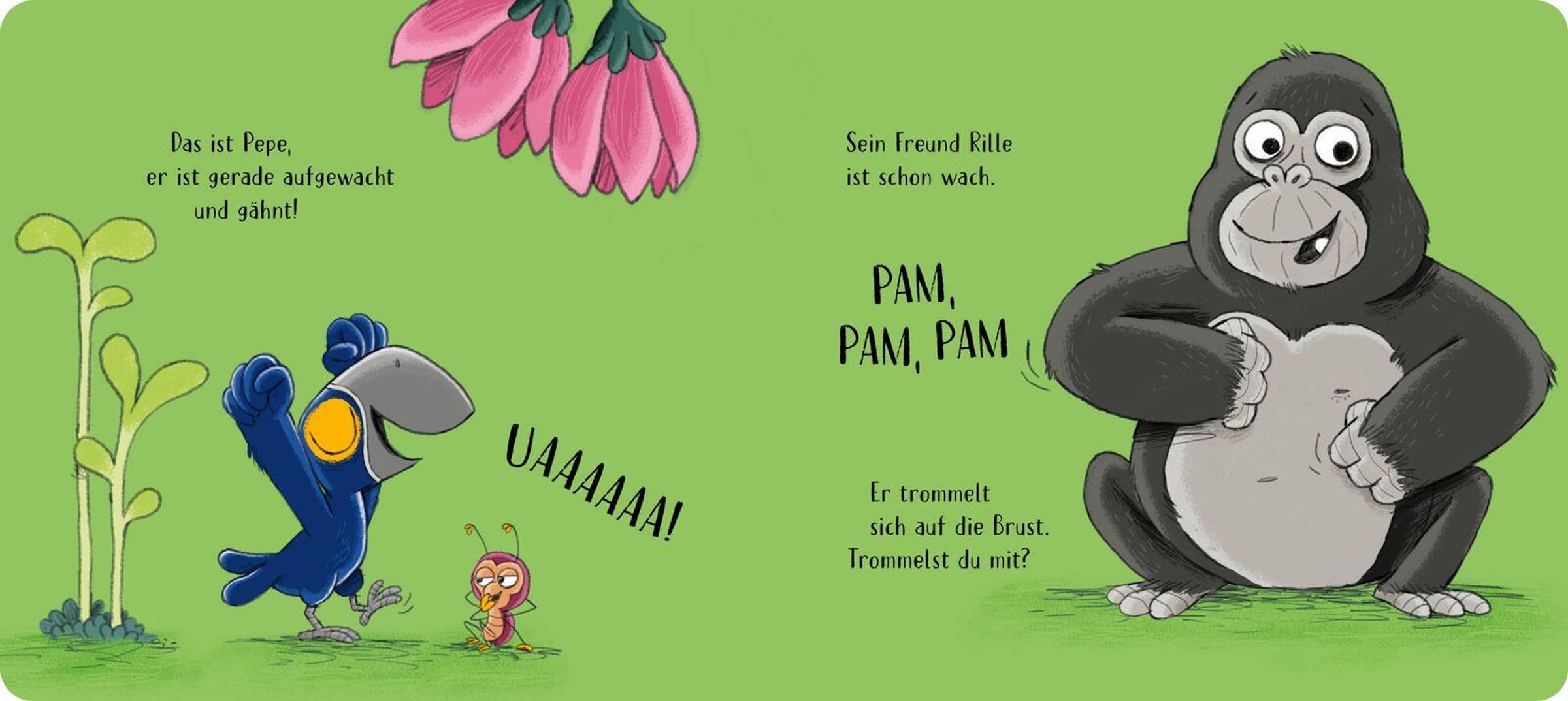 Mit Rille und Papagei Pepe macht schon das Aufstehen großen Spaß! Denn die Allerkleinsten dürfen überall mithelfen: sich auf die Brust trommeln wie ein kleiner Gorilla, volle Frühstücksbäuchlein streicheln, die Lianenschaukel anschubsen oder den Regen mit Klopfgeräuschen auf den Dschungelboden prasseln lassen. Dabei erleben sie vertraute Rituale auf spielerische Weise neu - bis der Tag sanft ausklingt und ein leises Gute Nacht durch die Bananenblätter weht.