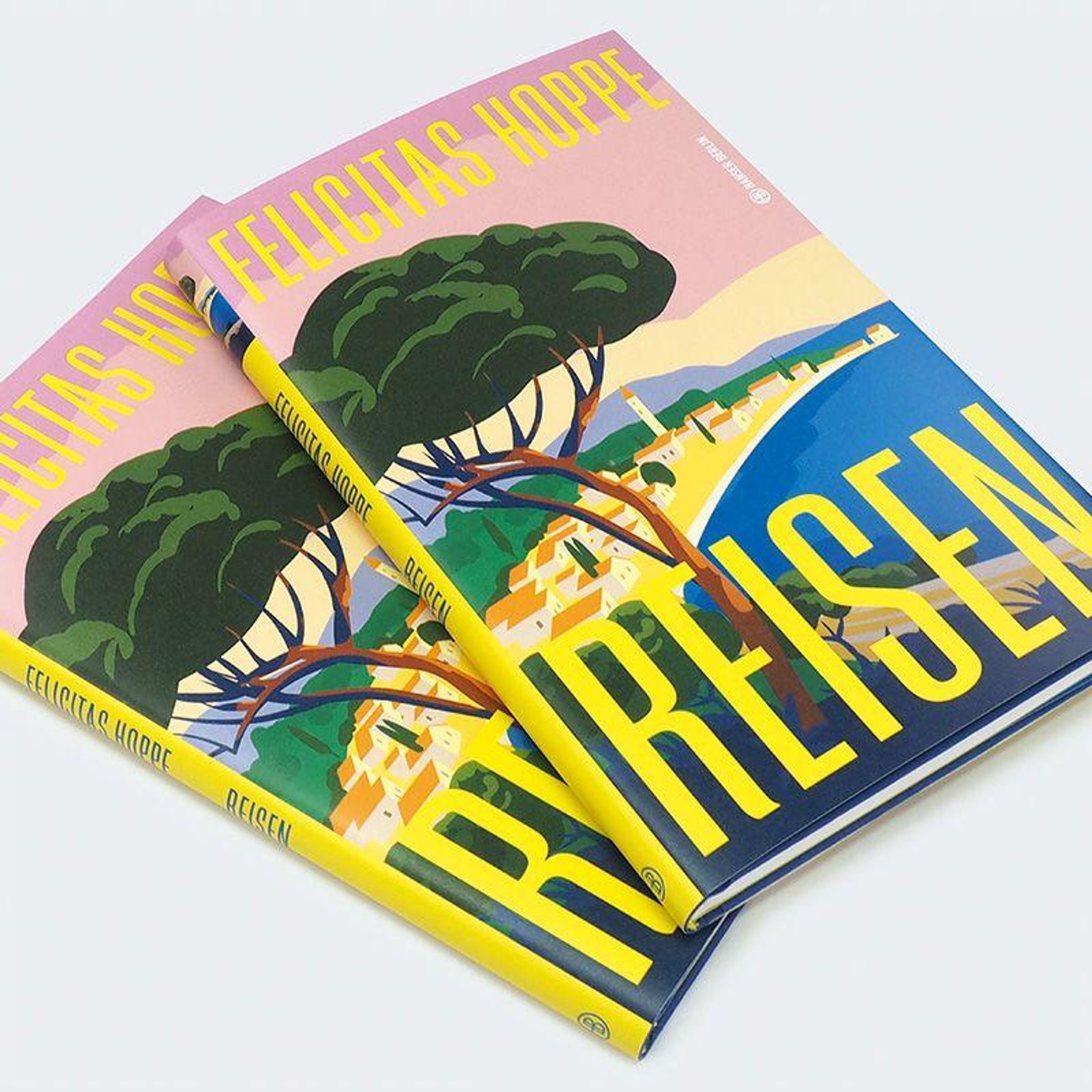 "Felicitas Hoppe Reisen" in großen gelben Buchstaben. Illustration: Küstenlandschaft mit Baum, Häusern und Wasser., Buch