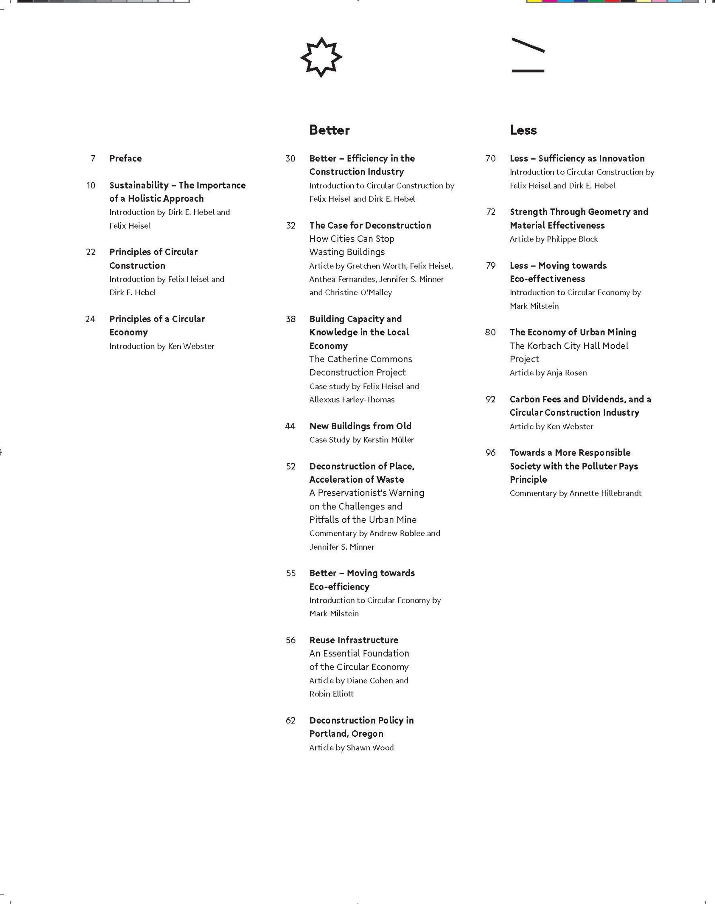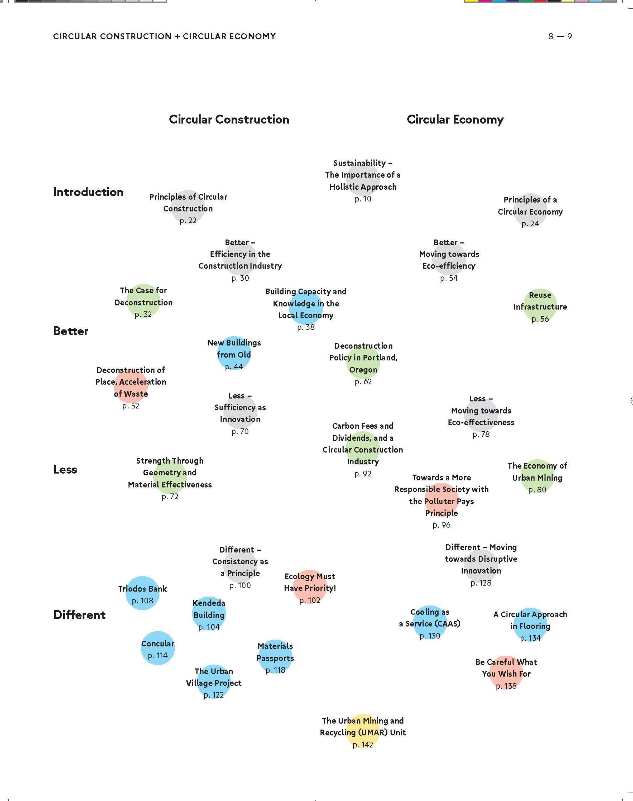 The first volume presents concepts, methods and examples of circularity in construction and the economy. Urban mining and circular construction are two approaches to the challenges that architecture and urban design are facing, using techniques such as mono-material construction and design for disassembly, and tools such as materials passports and databases. The circular economy is not solely about recycling but encompasses a wide range of strategies from local community projects to new ownership and service models and steering mechanisms such as carbon fees and dividends.