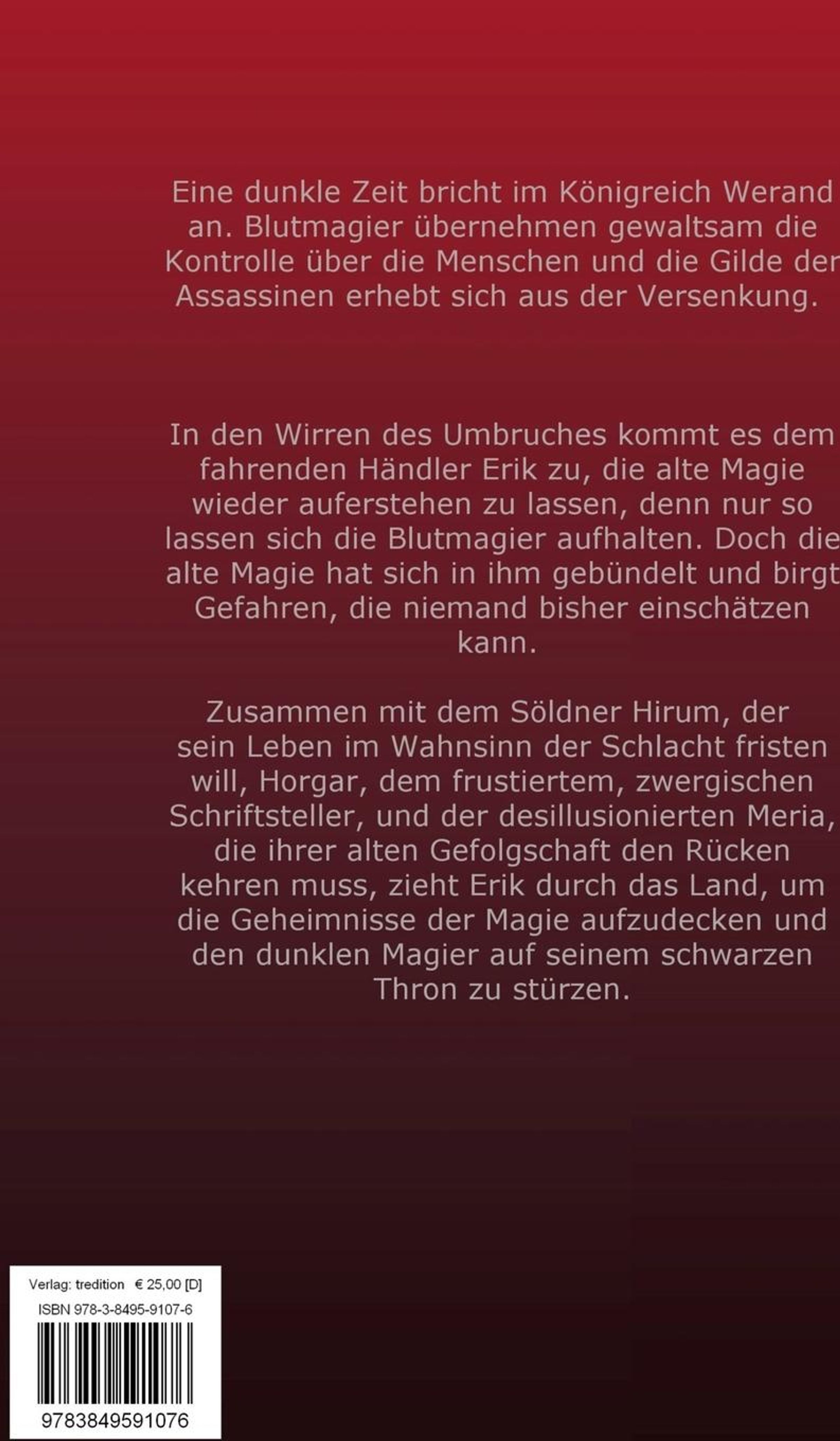 Eine dunkle Zeit bricht im Königreich Werand an. Blutmagier übernehmen gewaltsam die Kontrolle über die Menschen und die Gilde der Assassinen erhebt sich aus der Versenkung. In den Wirren des Umbruches kommt es dem fahrenden Händler Erik zu, die alte Magie wieder auferstehen zu lassen, denn nur so lassen sich die Blutmagier aufhalten. Doch die alte Magie hat sich in ihm gebündelt und birgt Gefahren, die niemand bisher einschätzen kann. Zusammen mit dem Söldner Hirum, der sein Leben im Wahnsinn der Schlacht fristen will, Horgar, dem frustiertem, zwergischen Schriftsteller, und der desillusionierten Meria, die ihrer alten Gefolgschaft den Rücken kehren muss, zieht Erik durch das Land, um die Geheimnisse der Magie aufzudecken und den dunklen Magier auf seinem schwarzen Thron zu stürzen.