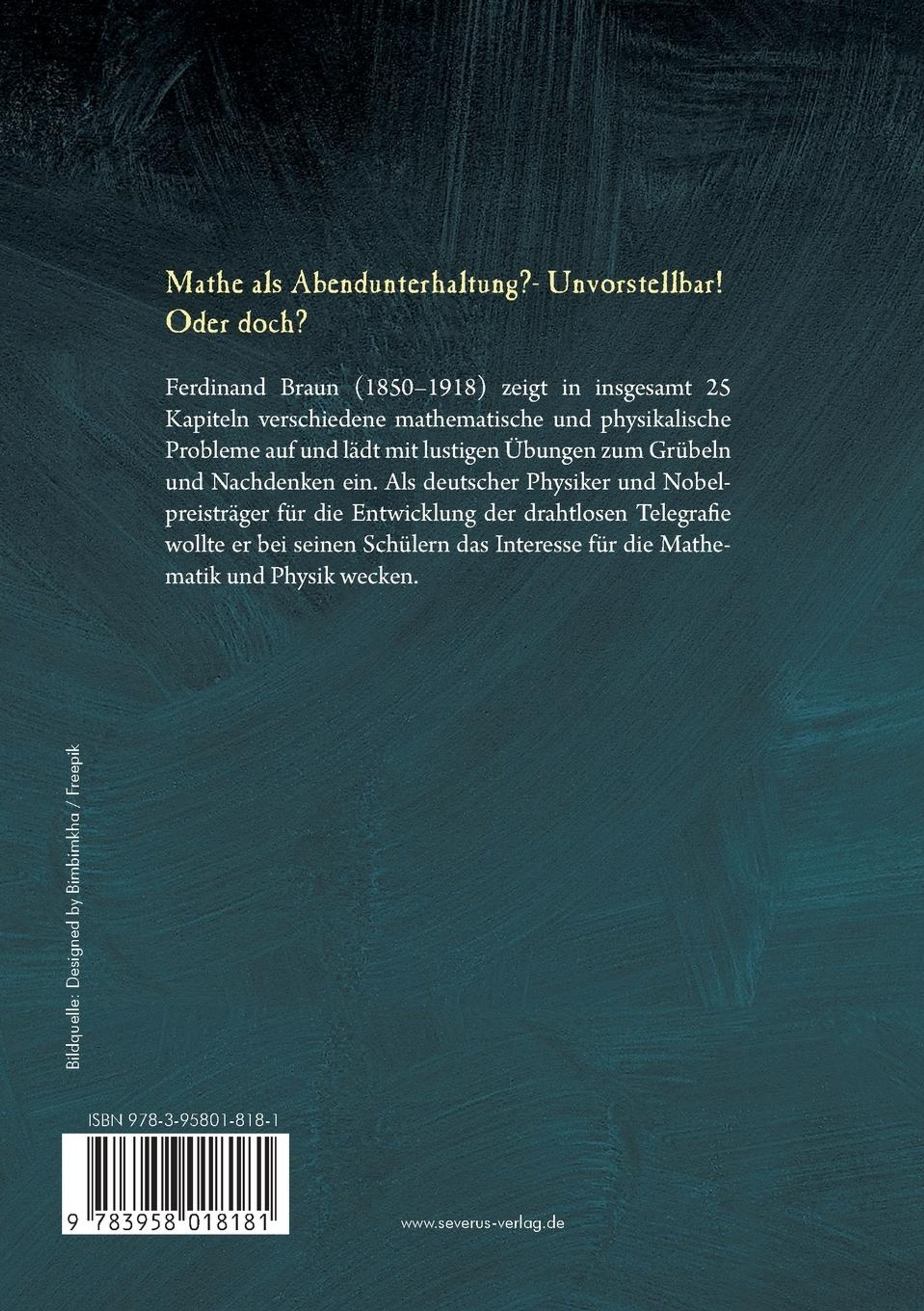 Mathe als Abendunterhaltung?- Unvorstellbar! Oder doch? Ferdinand Braun (1850¿1918) zeigt in insgesamt 25 Kapiteln verschiedene mathematische und physikalische Probleme auf und lädt mit lustigen Übungen zum Grübeln und Nachdenken ein. Als deutscher Physiker und Nobelpreisträger für die Entwicklung der drahtlosen Telegrafie wollte er bei seinen Schülern das Interesse für die Mathematik und Physik wecken.