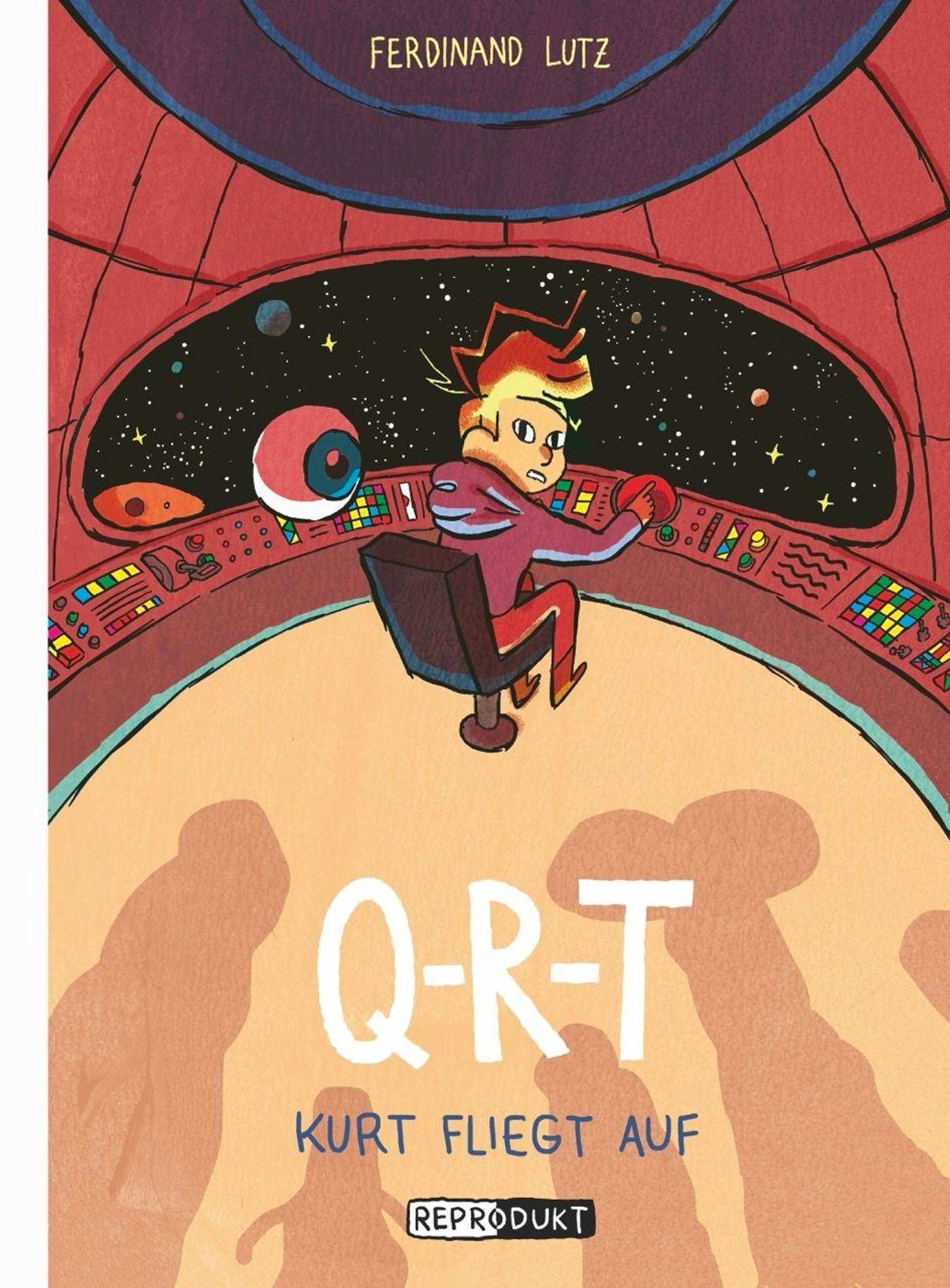 "Q-R-T Kurt fliegt auf." Ein Junge steuert ein Raumschiff, während er umgeben von Planeten und einem größen Auge ist., Buch