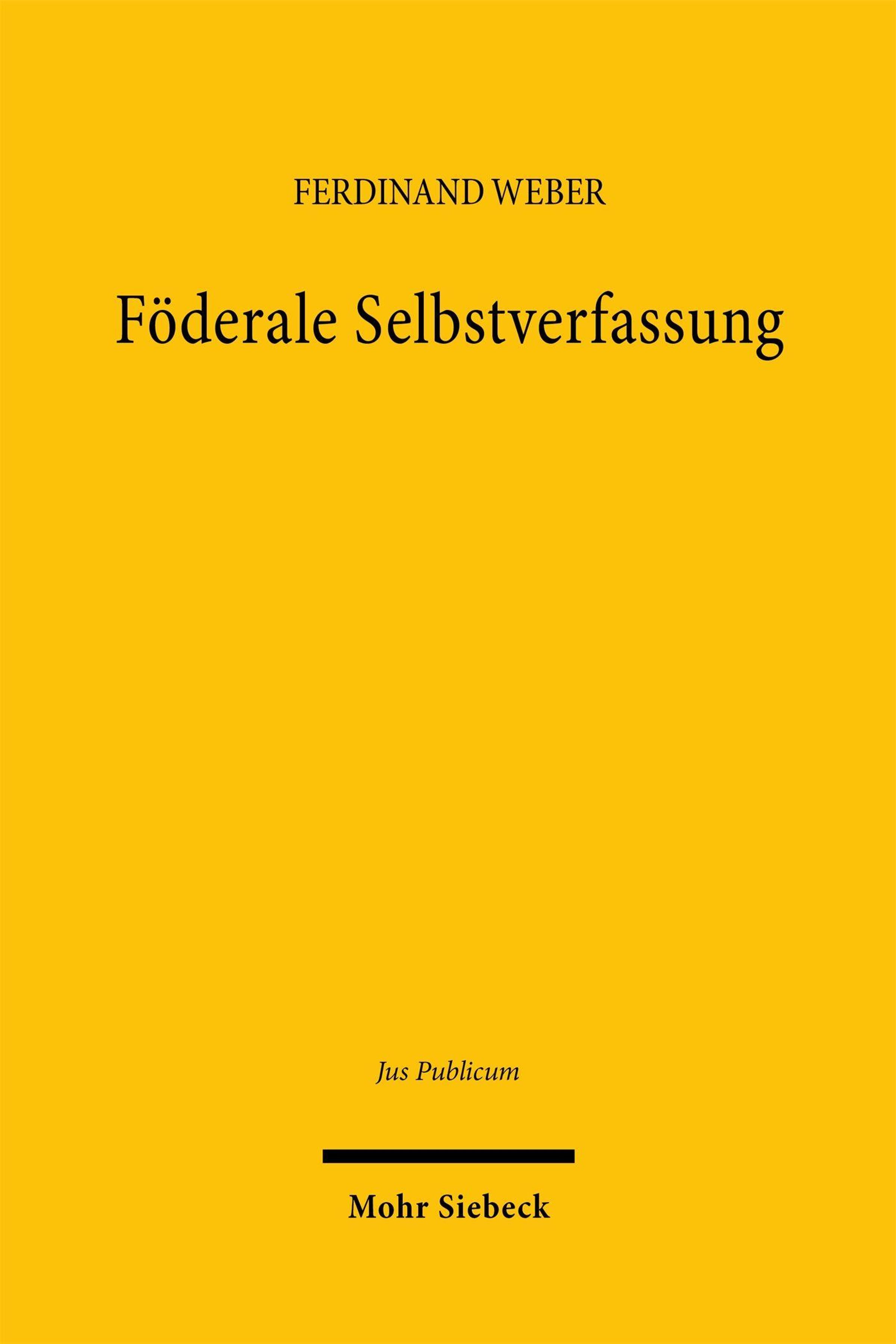 Text: "Ferdinand Weber, Föderale Selbstverfassung, Jus Publicum, Mohr Siebeck." Gelber Hintergrund, keine Bilder oder Grafiken., Buch