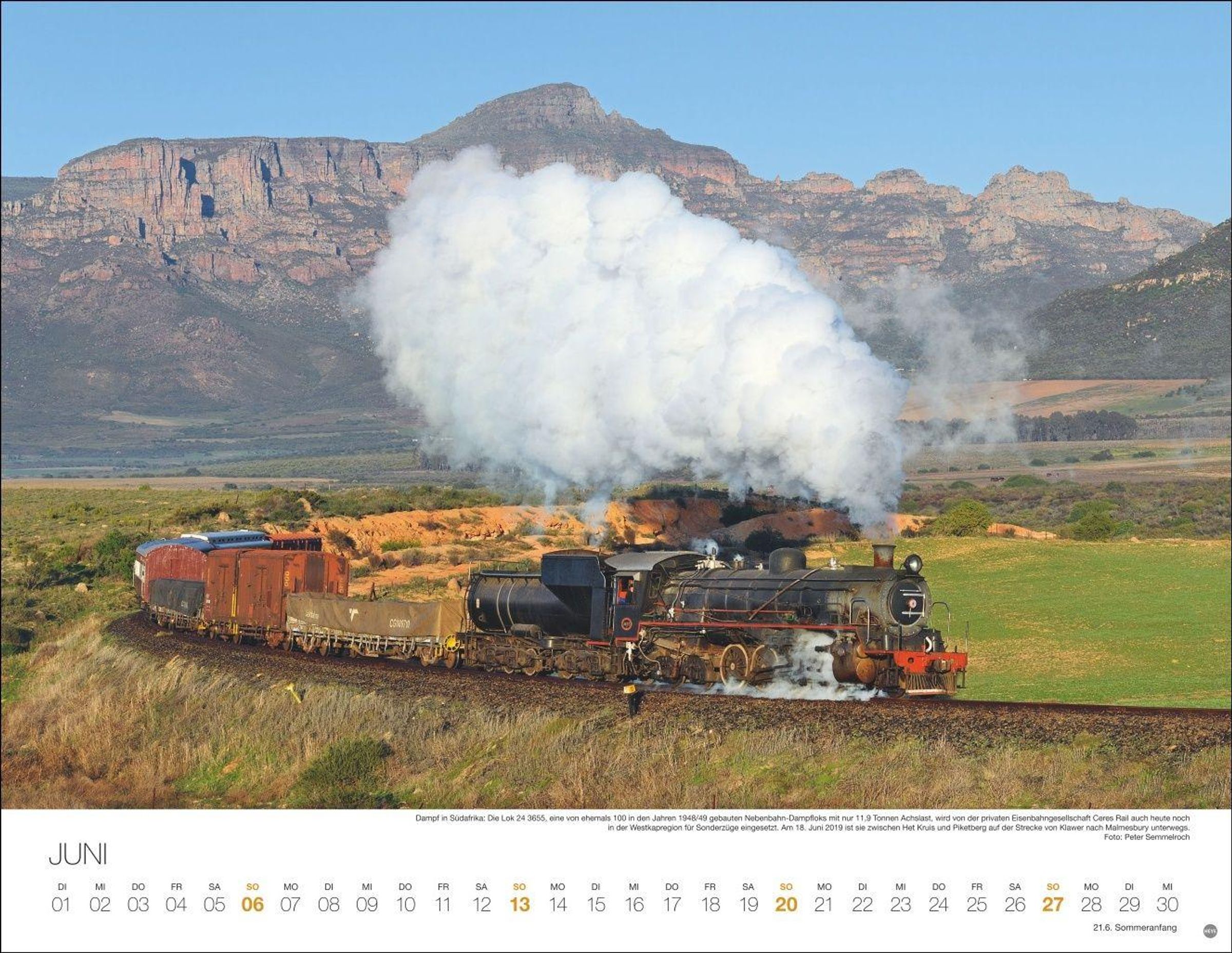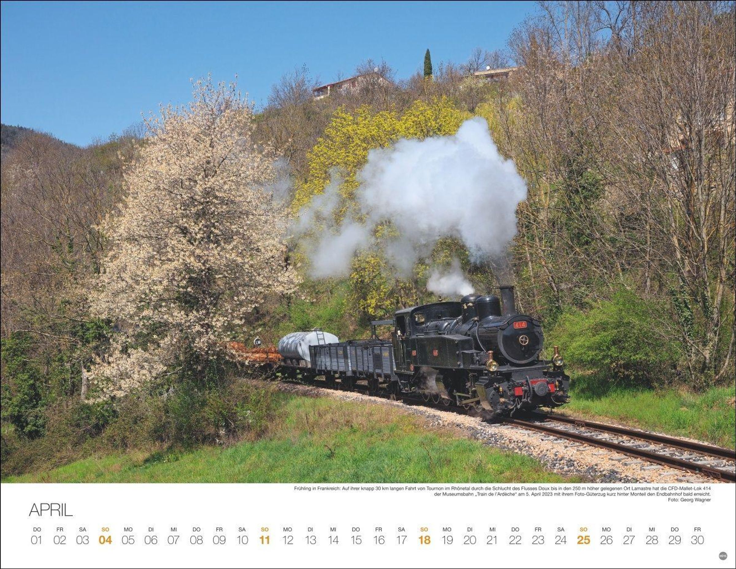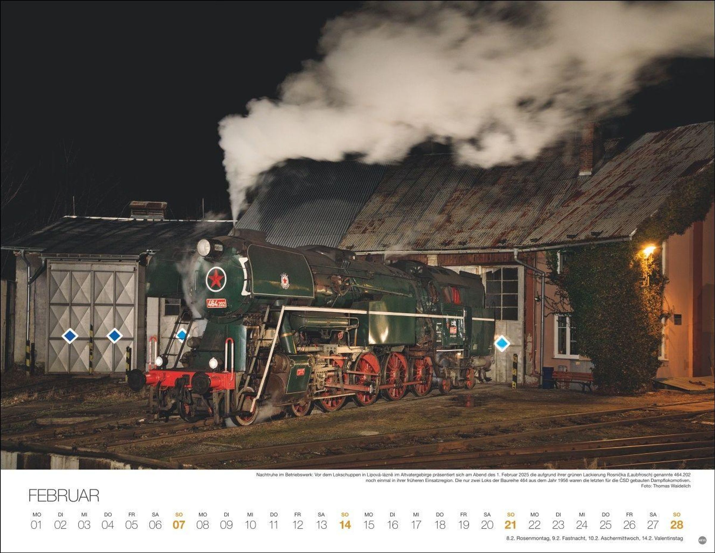 "FEURIGE DAMPFLOKS 2027" steht vor einer schwarzen Dampflok mit rotem Fahrgestell, die durch eine grüne Landschaft fährt., Kalender