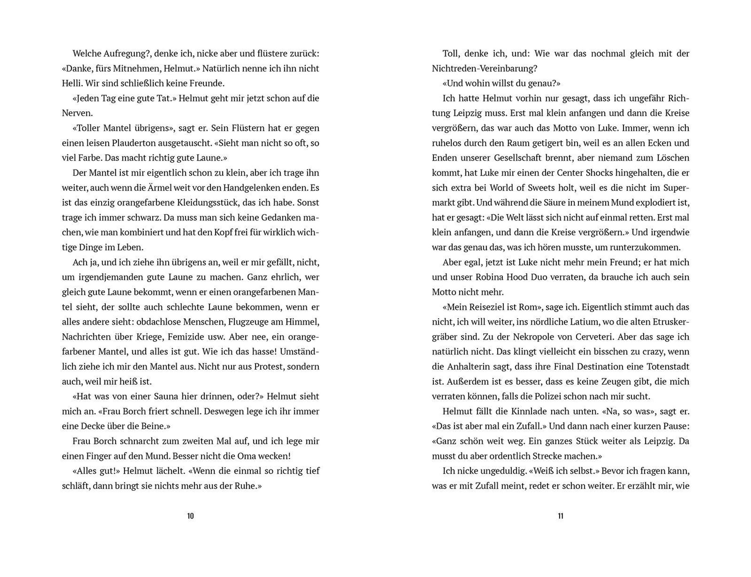 Eni (die auf keinen Fall mit ihrem echten Namen Clementina angesprochen werden will, weil der sanftmütig und mild bedeutet) hat die Schnauze voll: Ihr bester Freund Luke fliegt mit seiner neuen Flamme in den Urlaub, dabei wollten sie doch gemeinsam für eine gerechtere Zukunft kämpfen! Das muss Eni dann wohl allein tun. Und so klaut sie Lukes reichem Onkel eine antike Figur, um sie dahin zurückzubringen, wo sie hingehört: ins Etruskergrab in Süditalien. Welches genau, weiß Eni nicht, aber darum geht es auch gar nicht. An einer Tankstelle in Brandenburg trifft Eni auf die 96-jährige Wilhelmina, die ebenfalls eine Mission hat: noch ein letztes Mal nach Capri reisen und den Sonnenuntergang sehen. Seit dem Tod ihres Mannes fährt sie jedes Jahr mit dem Taxi in den Süden, mit Helmut, dem Taxifahrer ihres Vertrauens. Sanftmütig und mild, das ist Wilhelmina ganz bestimmt auch nicht, und eigentlich wäre sie die Letzte auf Erden, die eine Anhalterin mitnehmen würde ... wäre da nicht Enis orangefarbener Mantel, der Wilhelmina an ein düsteres Kapitel ihres Lebens erinnert: an ihre beste Freundin Leni, die Tochter eines jüdischen Textilherstellers, die sie damals in den 30er Jahren verraten hat.
