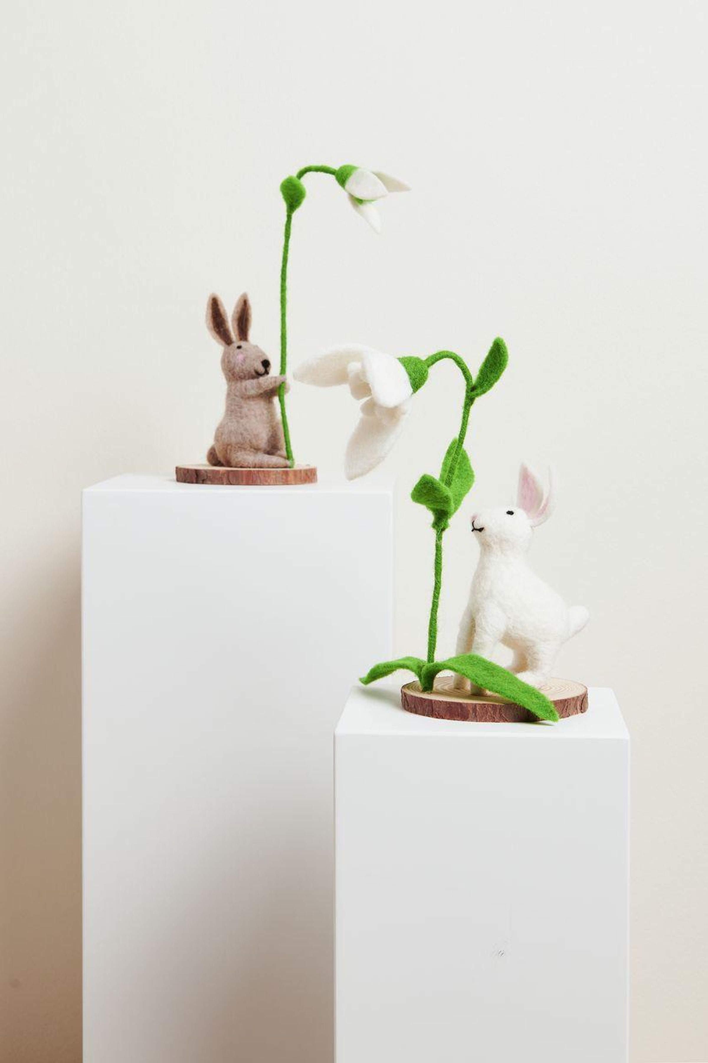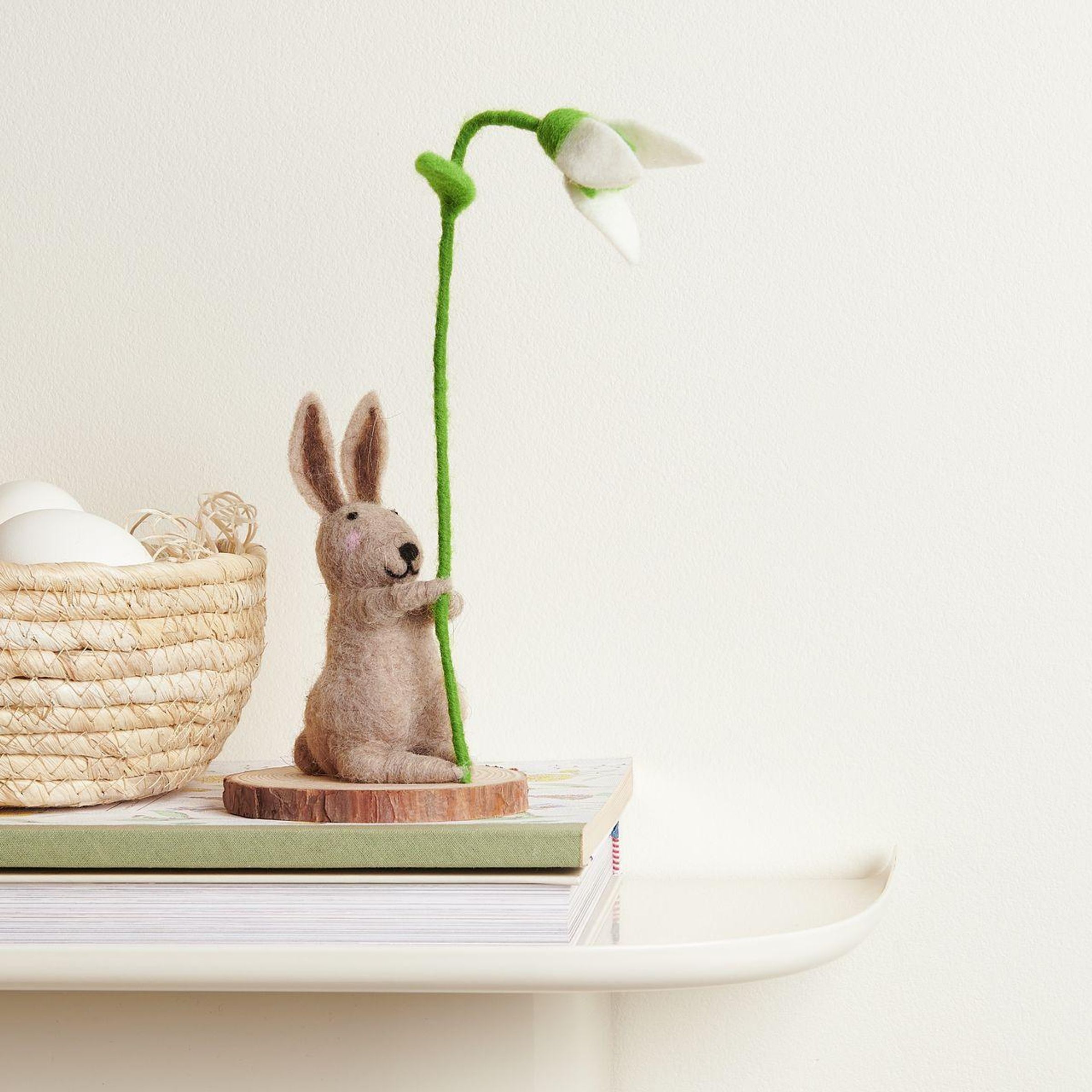 Filz-Hase mit Schneeglöckchen, Braun, auf Holzscheibe, 21 x 9,5 x 9,5cm (Sonstige Artikel)