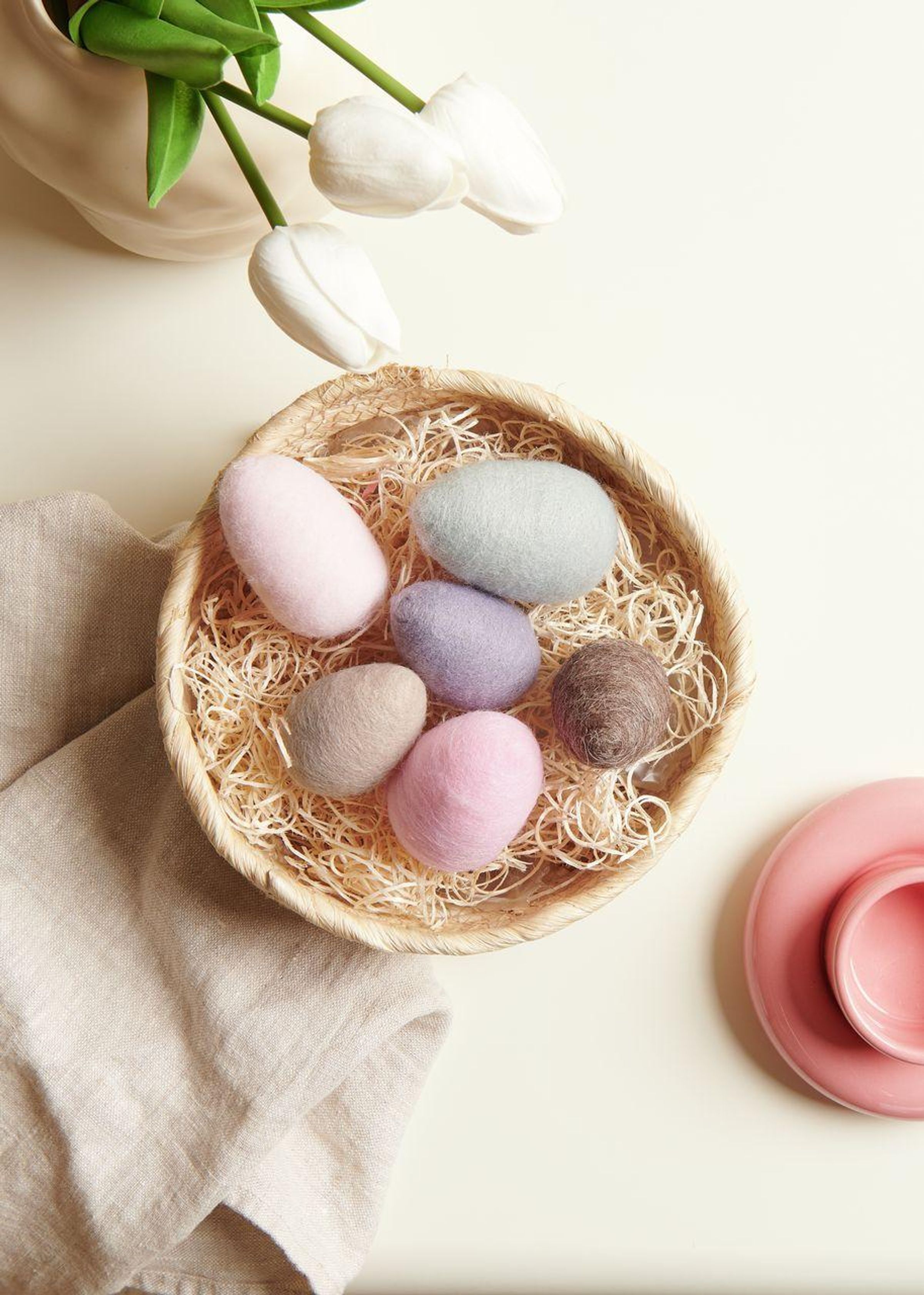 Das Set aus sechs dekorativen Filzeiern eignet sich ideal für Frühlings- und Osterdekorationen. Die Eier bestehen aus einer weichen Filzmischung aus 70 % Polyester und 30 % Wolle und überzeugen durch ihre angenehme Haptik und hochwertige Verarbeitung. Sie lassen sich vielseitig einsetzen - ob im Osterkorb, als Tischdekoration oder zum Aufhängen an Zweigen.