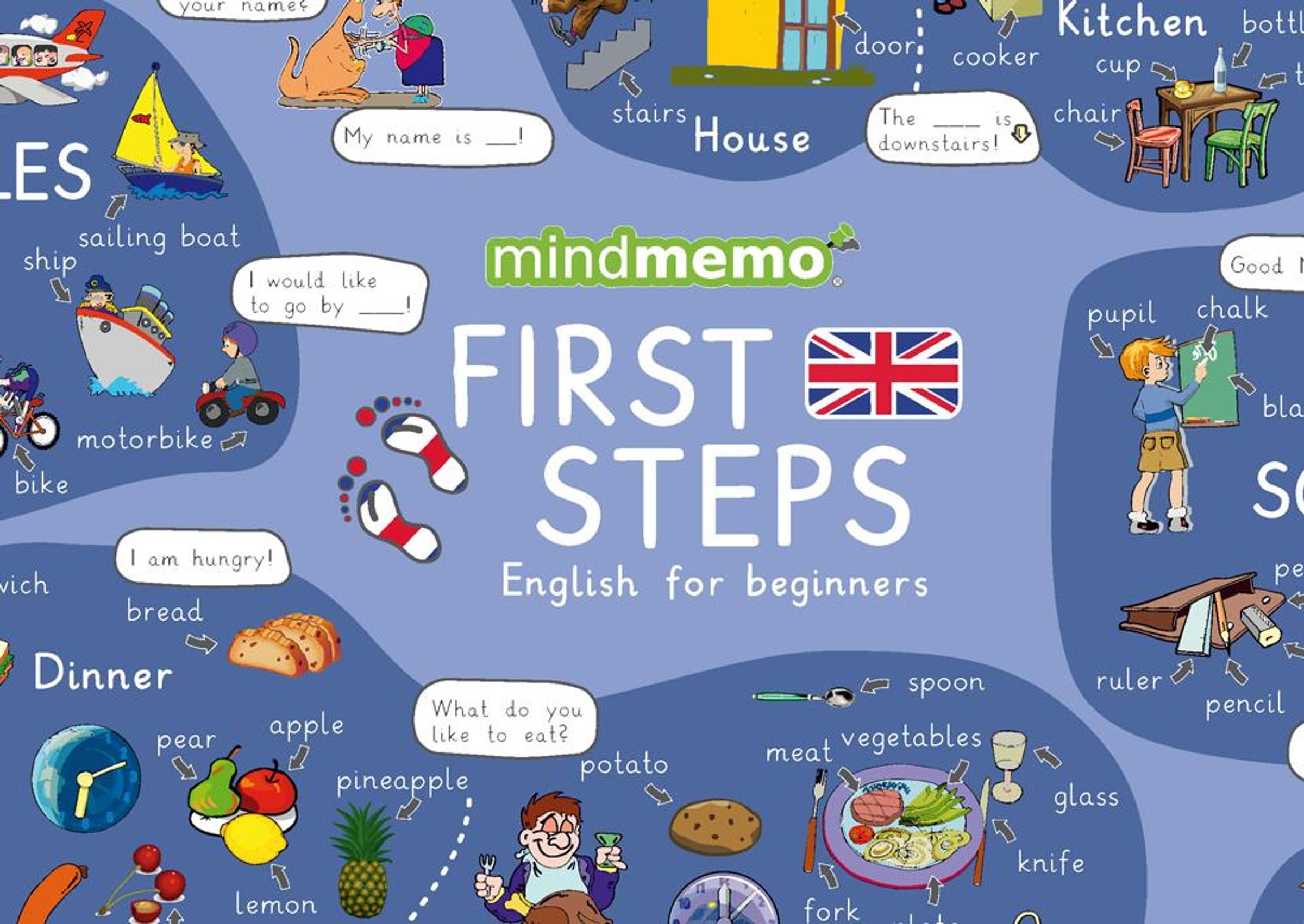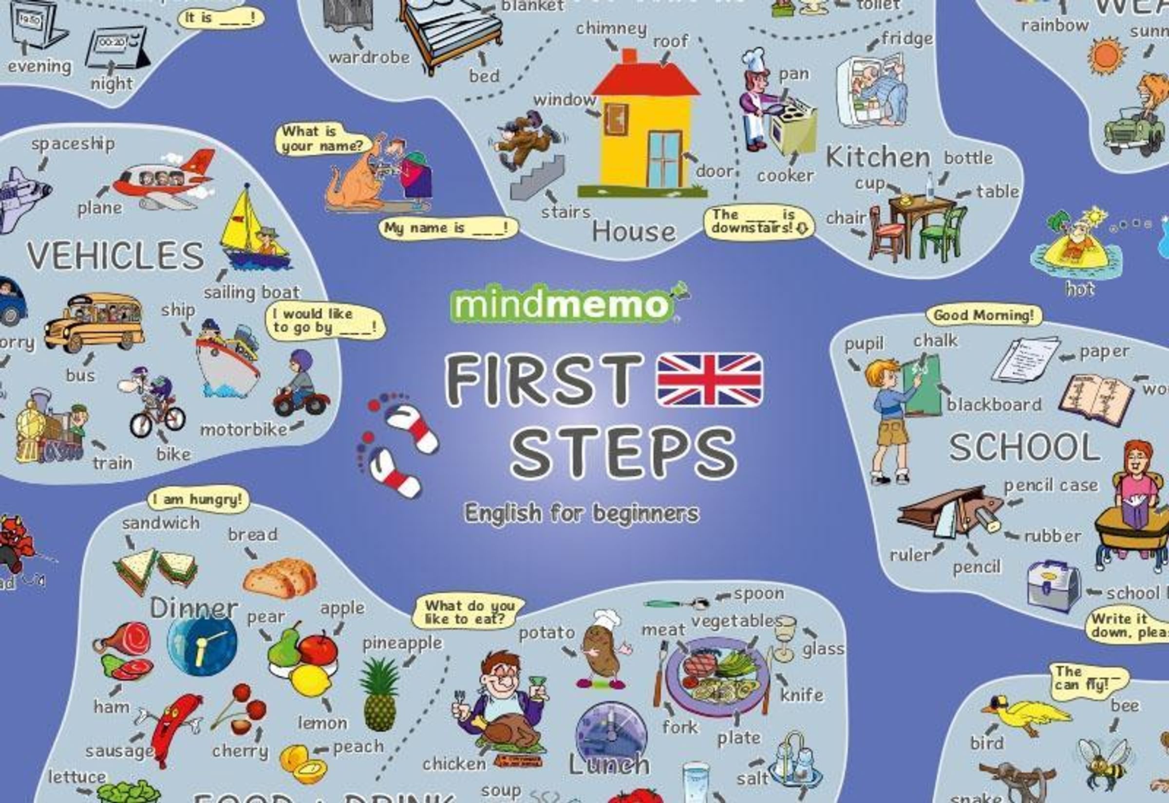 mindmemo Lernposter - First Steps - Englisch für Einsteiger - Vokabeln lernen mit Bildern - Zusammenfassung