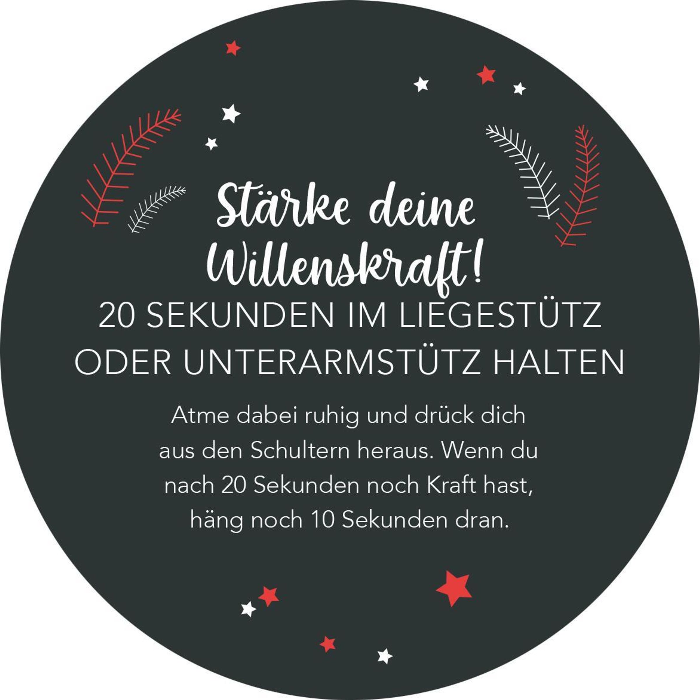 Voller Bauch vom Plätzchennaschen und der täglichen Schokolade aus den Adventskalender-Türchen? Diese Dose mit 24 Übungskarten holt das Beste aus dir heraus - mit alltagstauglichen, funktionalen Übungen, die deine Fitness spielerisch verbessern und dich Schritt für Schritt stolz und zufrieden machen. Zieh einfach an jedem Tag bis Weihnachten eine Karte und probiere die kleinen Workouts in deinem Zuhause aus.