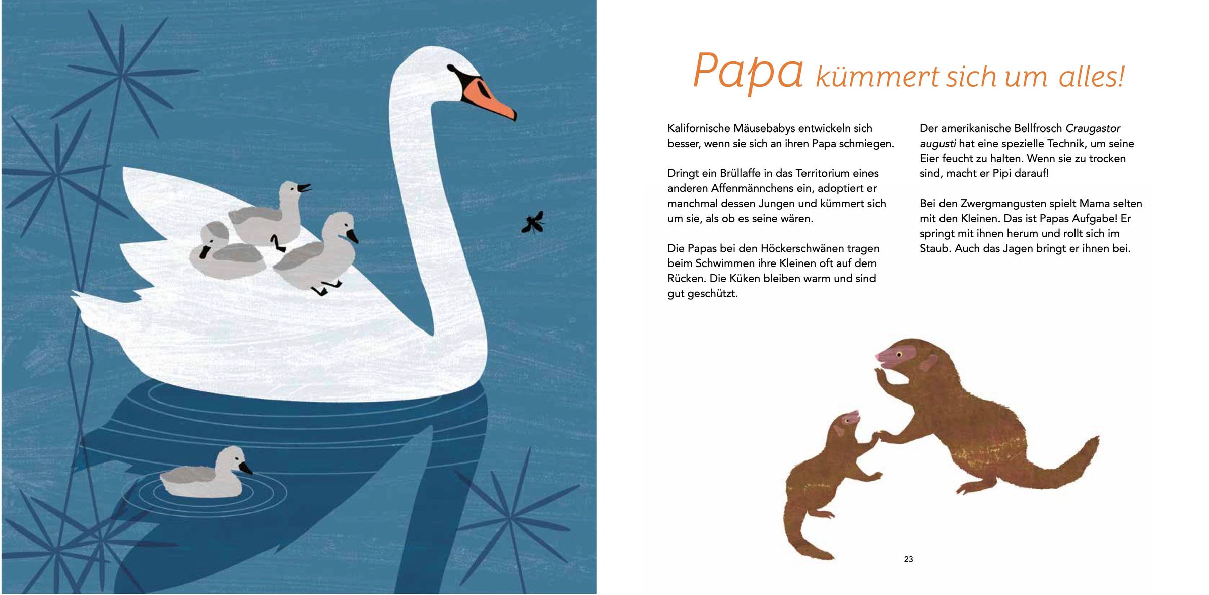 - Spannende Tierfakten zu verschiedenen Vaterrollen: vom Geburtshelfer über den Babysitter bis hin zum alleinerziehenden Papa