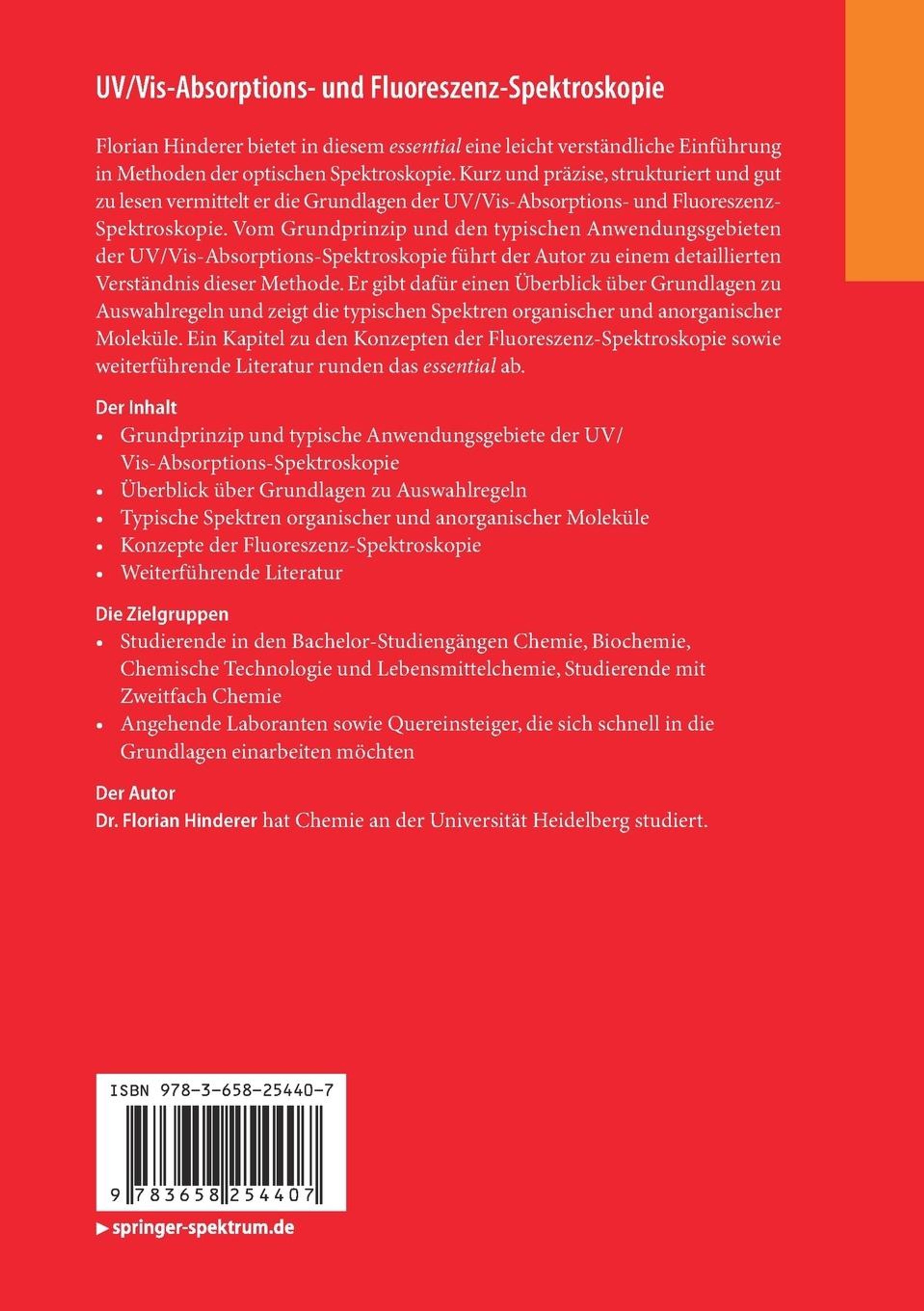 Florian Hinderer bietet in diesem essential eine leicht verständliche Einführung in Methoden der optischen Spektroskopie. Kurz und präzise, strukturiert und gut zu lesen vermittelt er die Grundlagen der UV/Vis-Absorptions- und Fluoreszenz-Spektroskopie. Vom Grundprinzip und den typischen Anwendungsgebieten der UV/Vis-Absorptions-Spektroskopie führt der Autor zu einem detaillierten Verständnis dieser Methode. Er gibt dafür einen Überblick über Grundlagen zu Auswahlregeln und zeigt die typischen Spektren organischer und anorganischer Moleküle. Ein Kapitel zu den Konzepten der Fluoreszenz-Spektroskopie sowie weiterführende Literatur runden das essential ab.