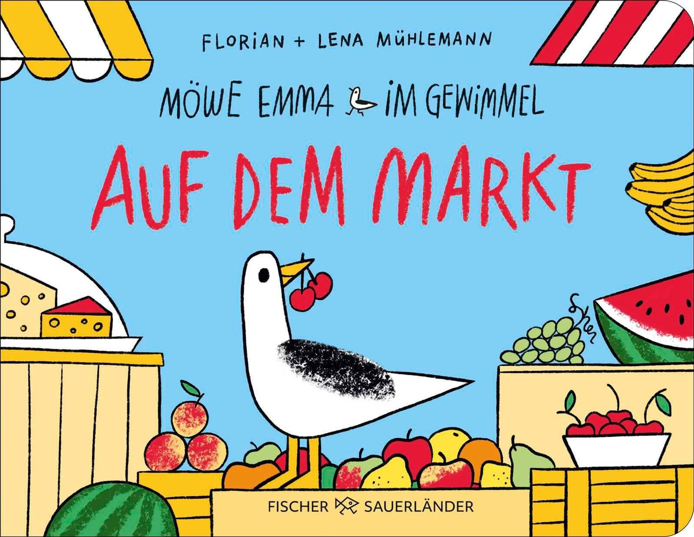 Möwe Emma ist auf dem Markt unterwegs. Und kleine Leser*innen sind überall dabei und betrachten die Welt von oben, unten, nah und fern. Was gibt es da alles zu sehen: Mäuse am Käsestand, Schmetterlinge zwischen bunten Blumen und viele Leckereien.