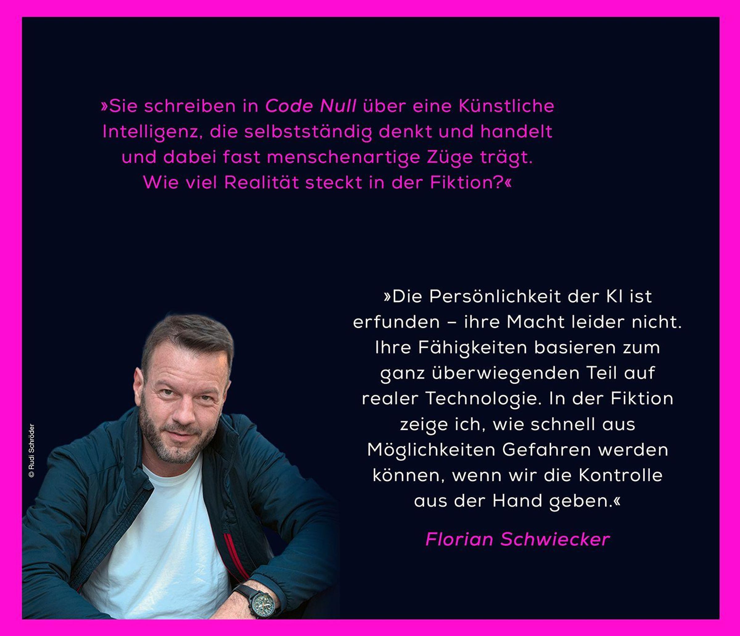 Florian Schwiecker ist Experte für Künstliche Intelligenz und SPIEGEL-Bestseller-Autor. Mit 'Code Null' entwirft er nicht nur ein äußerst beängstigendes und realitätsnahes What-if-Szenario , sondern liefert einen tempo- und wendungsreichen Pageturner, der einen beim Lesen nach Luft schnappen lässt.