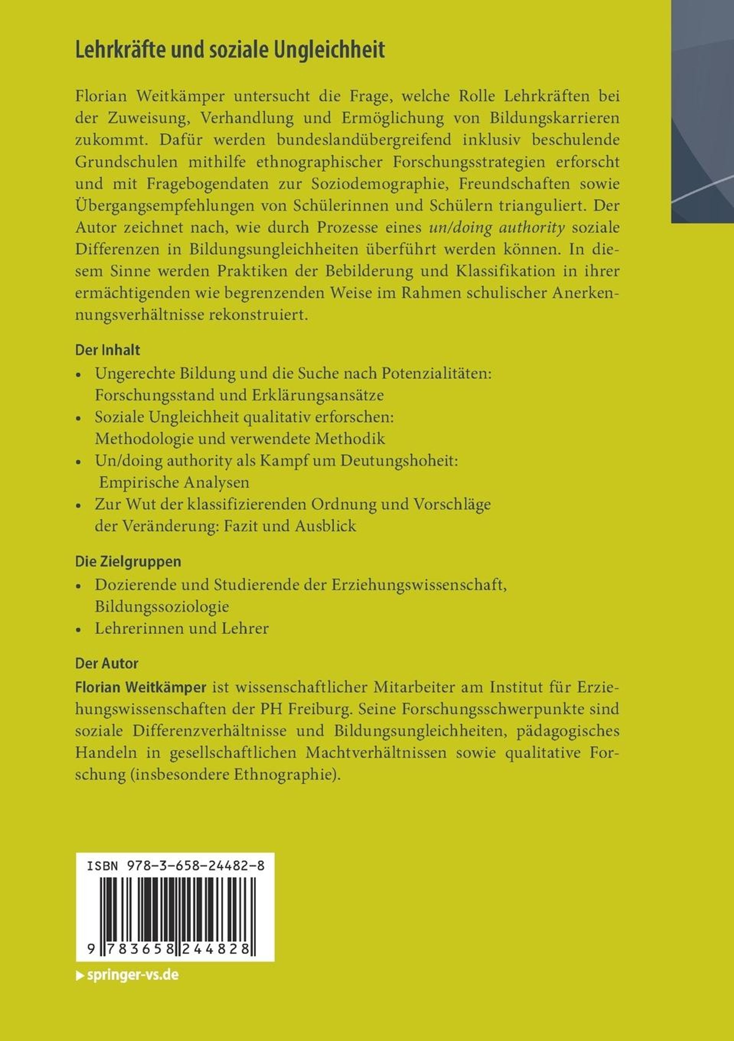 Florian Weitkämper untersucht die Frage, welche Rolle Lehrkräften bei der Zuweisung, Verhandlung und Ermöglichung von Bildungskarrieren zukommt. Dafür werden bundeslandübergreifend inklusiv beschulende Grundschulen mithilfe ethnographischer Forschungsstrategien erforscht und mit Fragebogendaten zur Soziodemographie, Freundschaften sowie Übergangsempfehlungen von Schülerinnen und Schülern trianguliert. Der Autor zeichnet nach, wie durch Prozesse eines un / doing authority soziale Differenzen in Bildungsungleichheiten überführt werden können. In diesem Sinne werden Praktiken der Bebilderung und Klassifikation in ihrer ermächtigenden wie begrenzenden Weise im Rahmen schulischer Anerkennungsverhältnisse rekonstruiert.