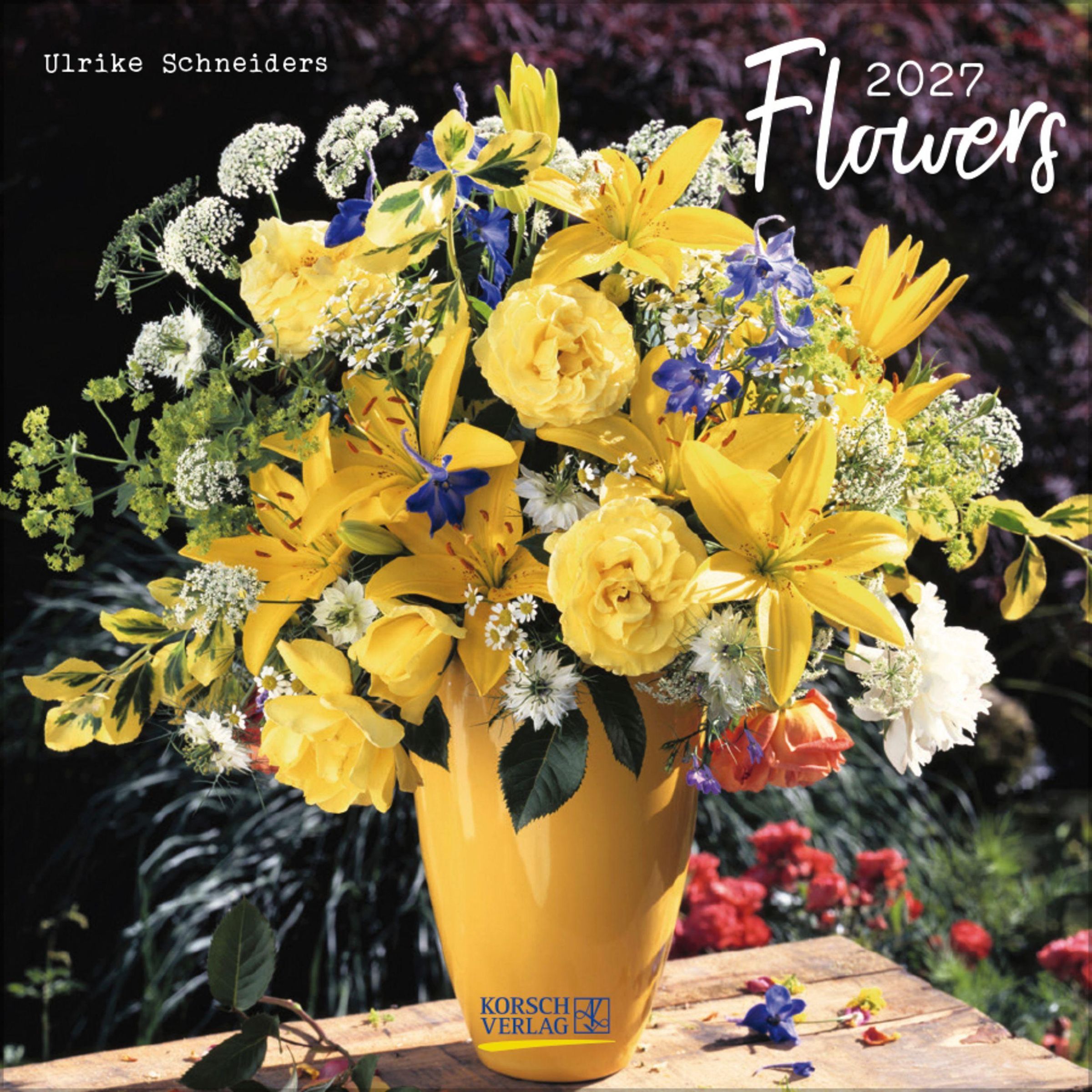 "Ulrike Schneiders" und "2027 Flowers". Ein bunter Blumenstrauß in einer gelben Vase auf einem Holztisch., Kalender