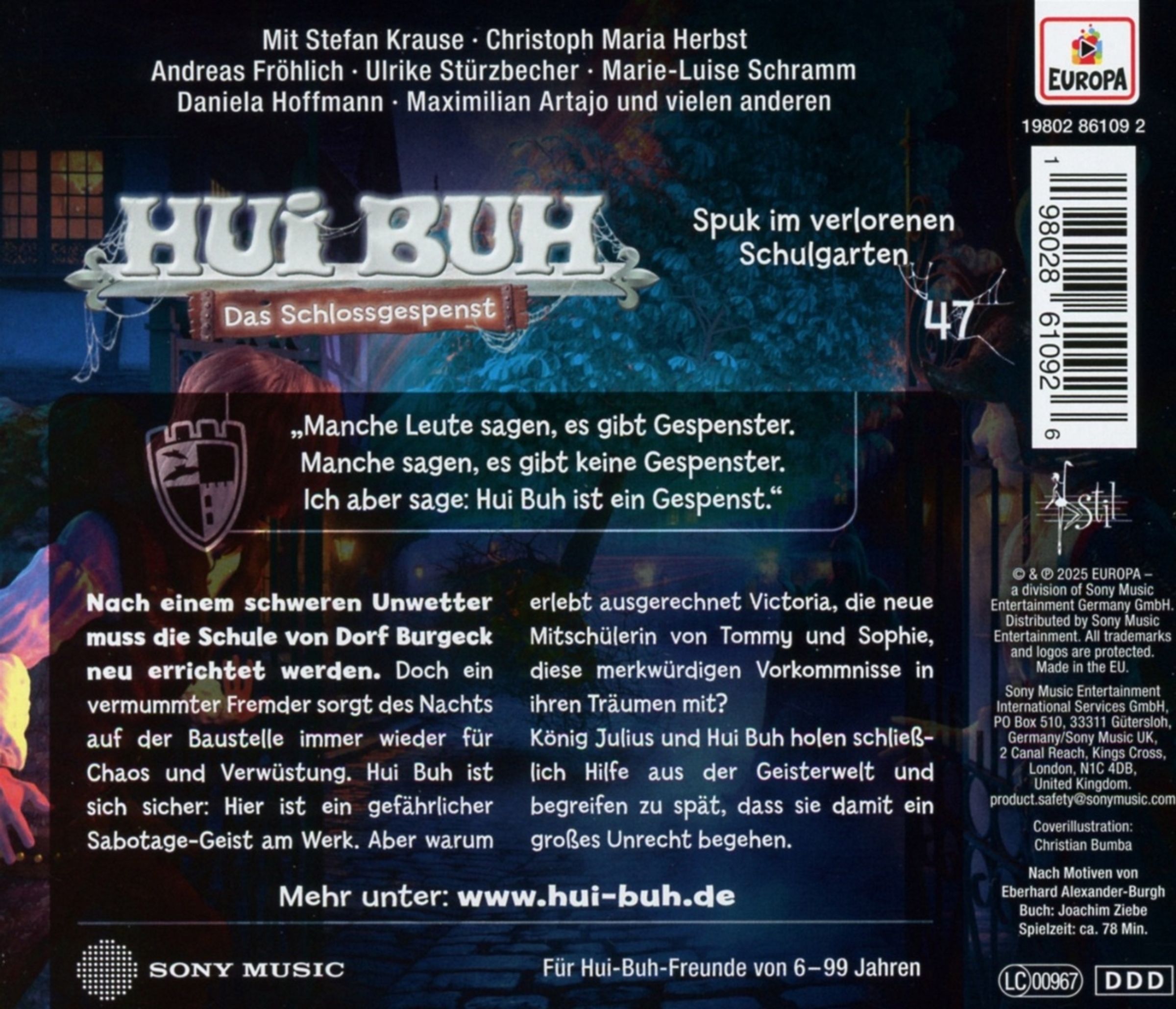 »Nach einem schweren Unwetter muss die Schule von Dorf Burgeck neu errichtet werden. Doch ein vermummter Fremder sorgt des nachts auf der Baustelle immer wieder für Chaos und Verwüstung. Hui Buh ist sich sicher: Hier ist ein gefährlicher Sabotage-Geist am Werk. Aber warum erlebt ausgerechnet Victoria, die neue Mitschülerin von Tommy und Sophie diese merkwürdigen Vorkommnisse in ihren Träumen mit?