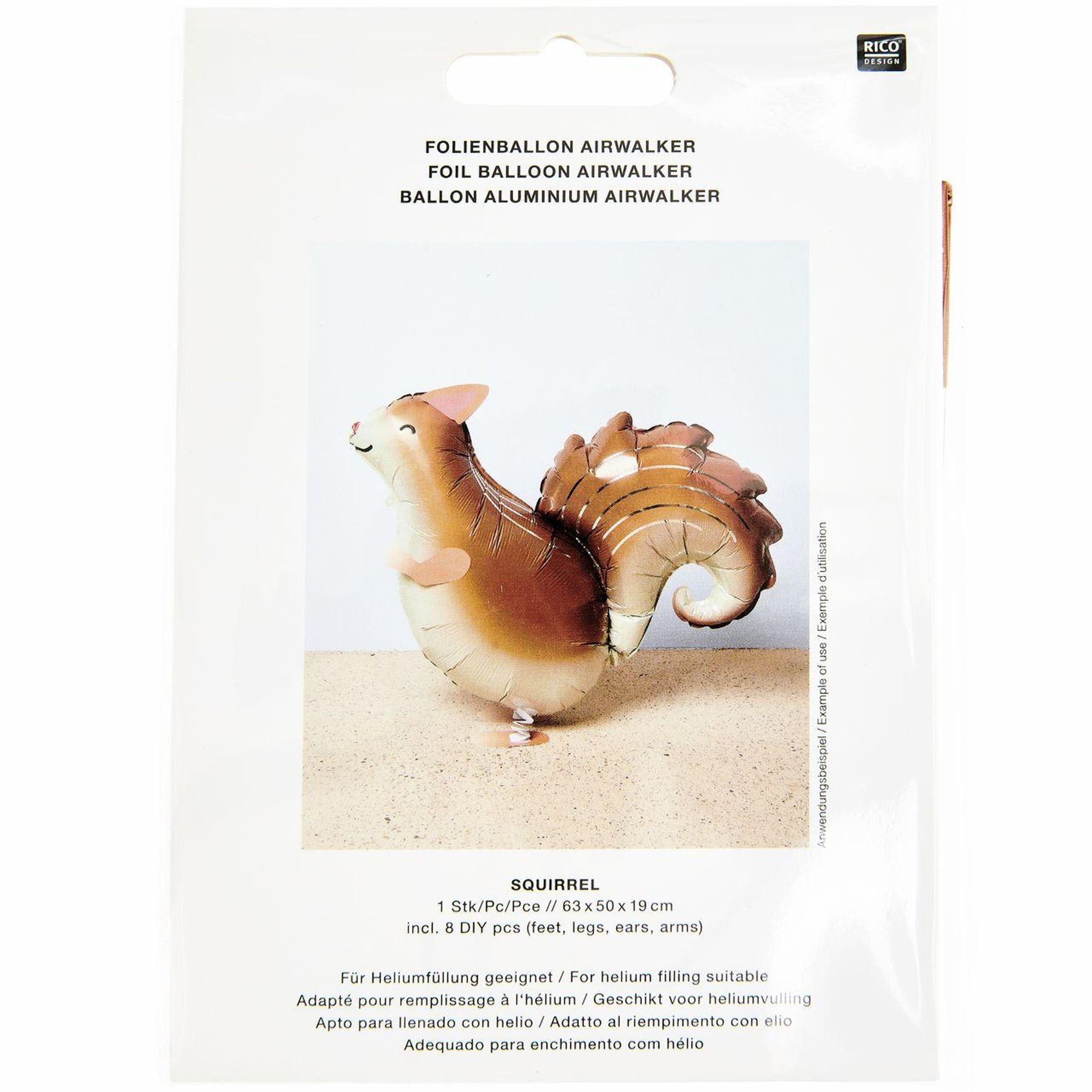 Der Folienballon "Airwalker Eichhörnchen" ist ausschließlich für die Befüllung mit Helium geeignet. Durch den speziellen Laufeffekt scheint der Ballon über dem Boden zu schweben und sorgt so für eine lebendige Darstellung. Das Modell ist wiederverwendbar und wird mit acht DIY-Teilen (Füße, Beine, Ohren und Arme) zur individuellen Gestaltung geliefert.