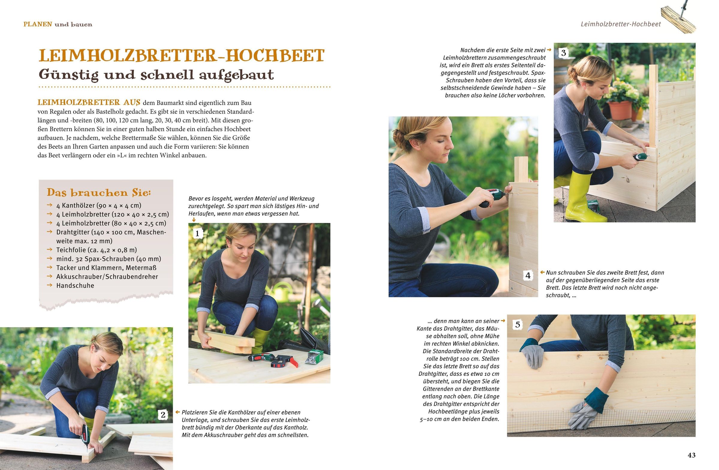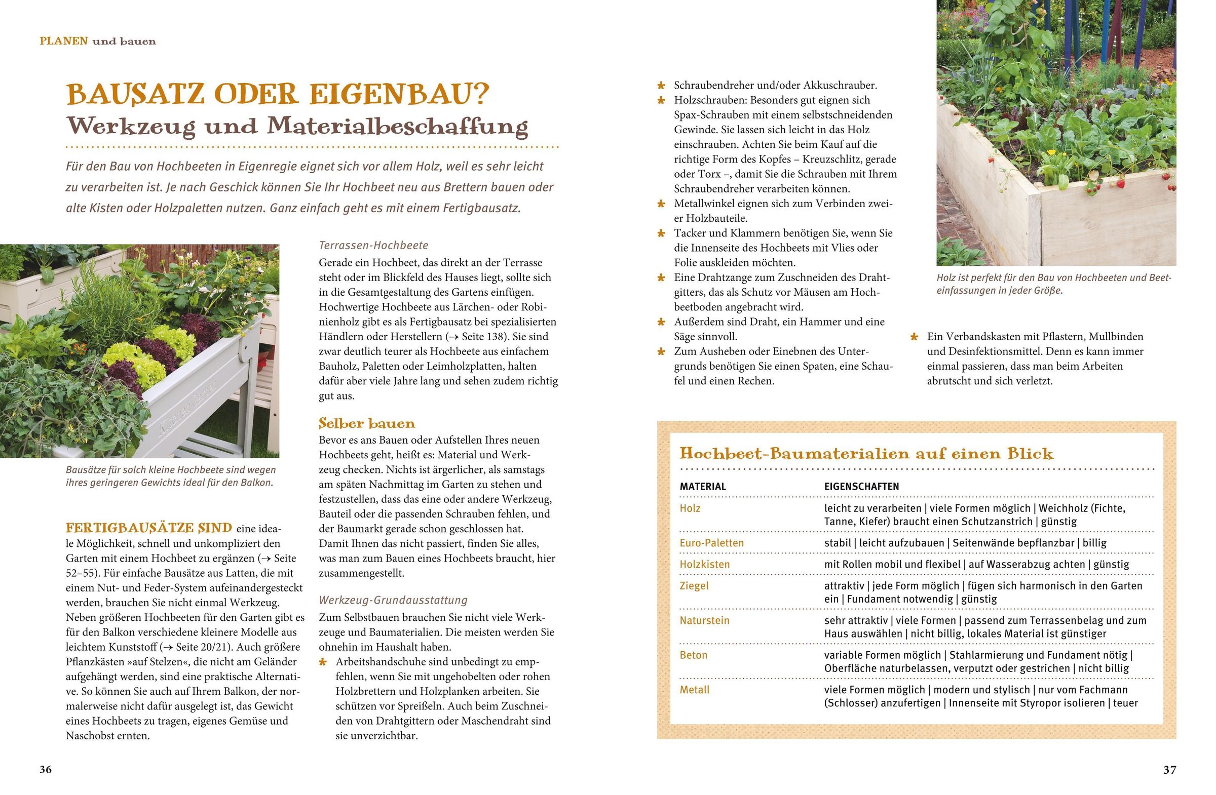 Hochbeete erleben zurzeit einen regelrechten Boom in der Gartenszene, speziell bei Selbstversorgern. Kein Wunder, denn sie lassen rückenfreundliches Arbeiten zu, ermöglichen hohe Erträge und können an (fast) jedem Standort aufgebaut werden. Dieser Ratgeber bietet detaillierte Bauanleitungen von Hochbeeten aus verschiedenen Materialien und für jeden Gartenstil. Und ob gekauft oder selbstgebaut: Der Ratgeber erklärt das ganze Know-how zu Aussaat, Bepflanzung und Pflege und liefert konkrete Bepflanzungsvorschläge für unterschiedliche Bedürfnisse. Darüber hinaus begleitet er Sie mit einem Pflegeplan durch das Gartenjahr und auch über mehrere Jahre hinweg vom Bau bis zum erneuten Aufsetzen des Hochbeetes. Pflanzenporträts informieren über die empfehlenswertesten Pflanzen. Und zahlreiche pfiffige Ideen und Anregungen zur Gestaltung und Nutzung wie beispielsweise mobile Beete und Tischbeete machen deutlich, wie vielseitig Hochbeete sind.