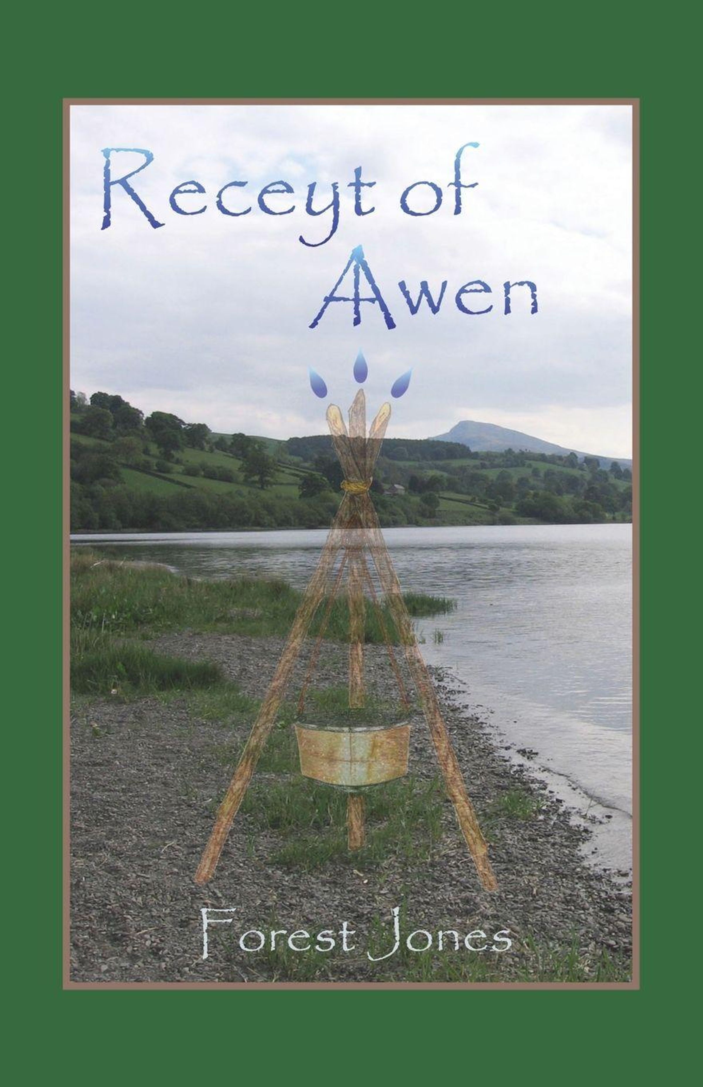 "Receyt of Awen" und "Forest Jones". Landschaftsfoto mit Flussufer, grünen Hügeln und einem Berg im Hintergrund, zentrales Symbol., Buch