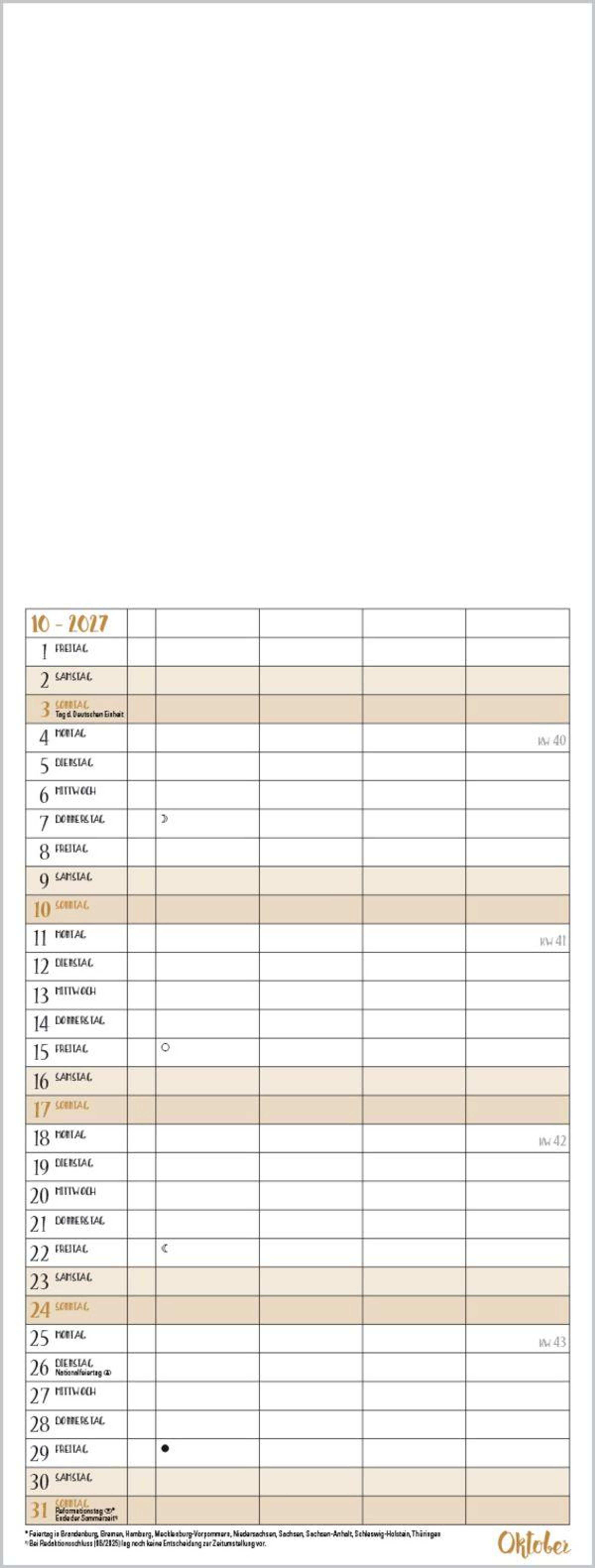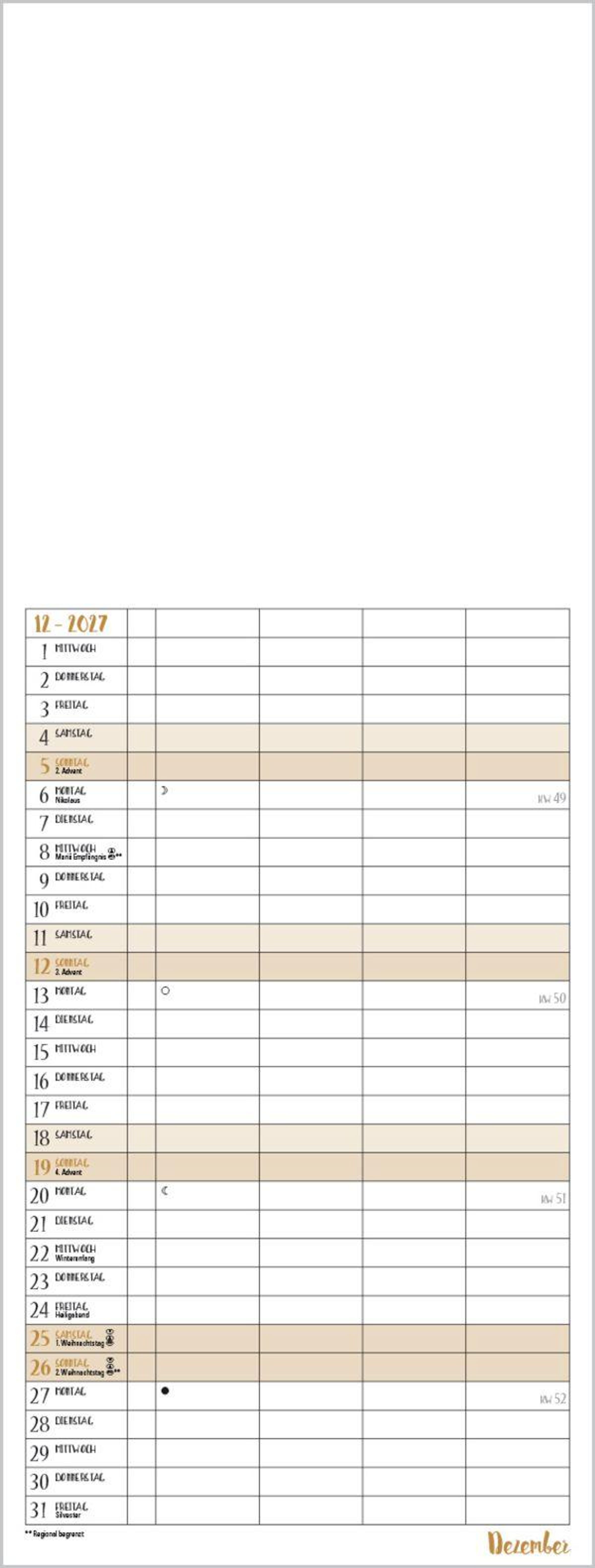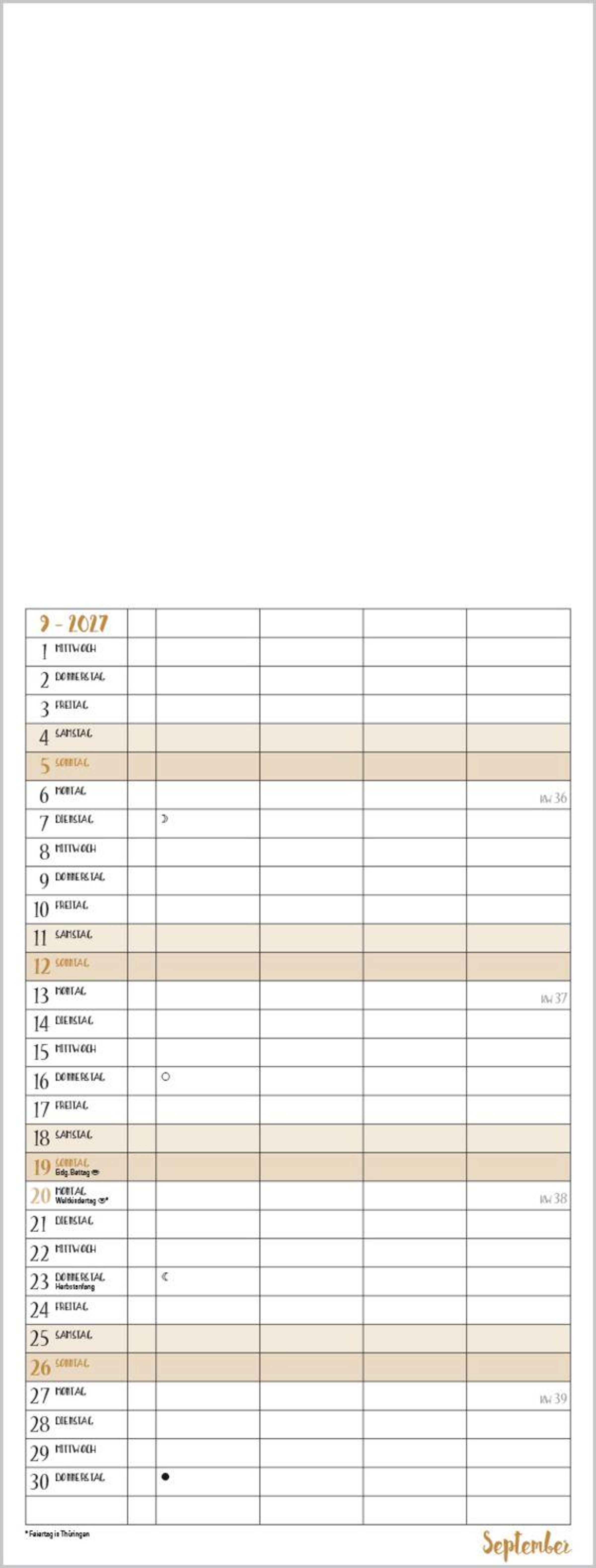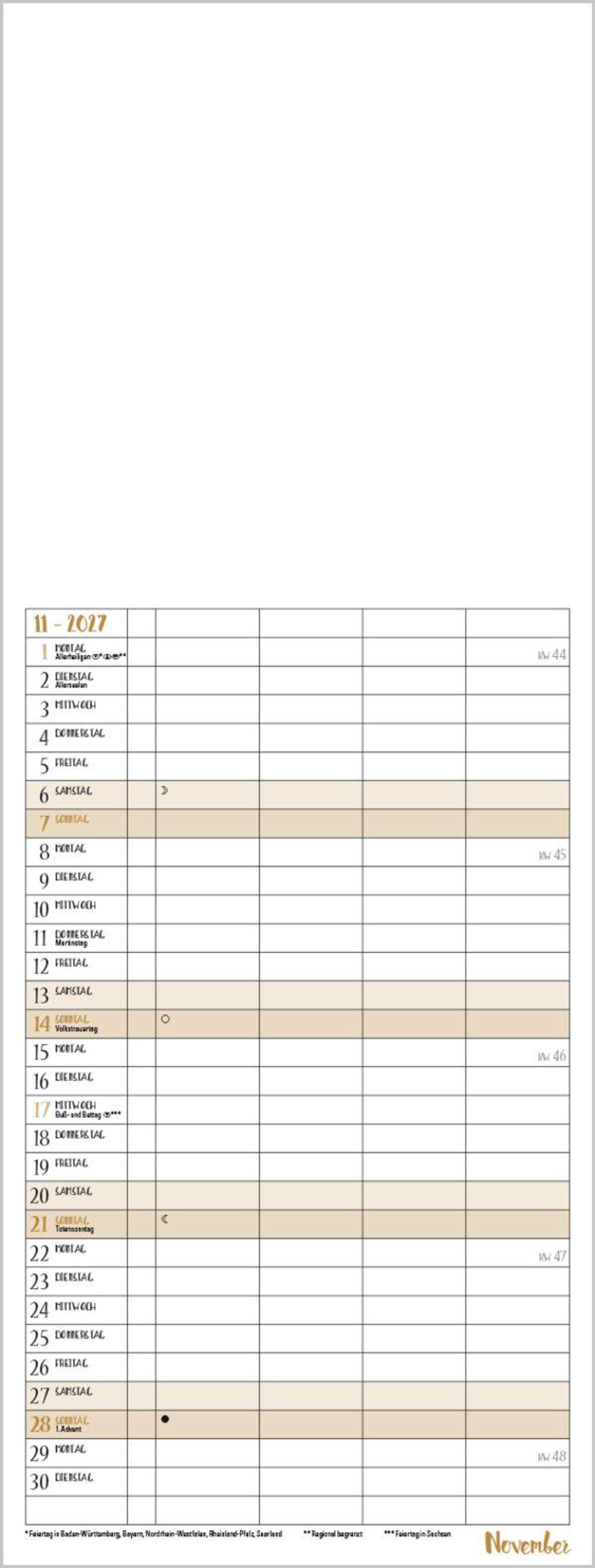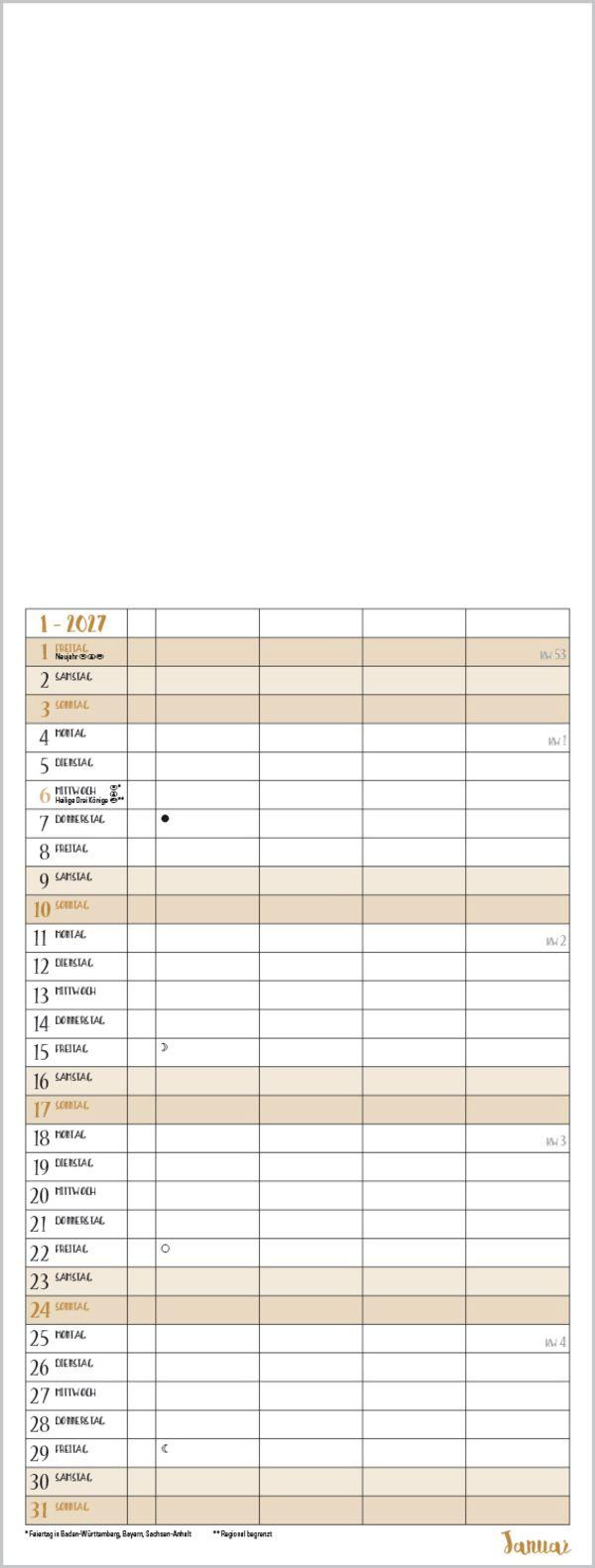 Familientimer mit hochwertigem weißem Karton und mit edlen goldfarbenen Markierungen der Wochenenden und Feiertage