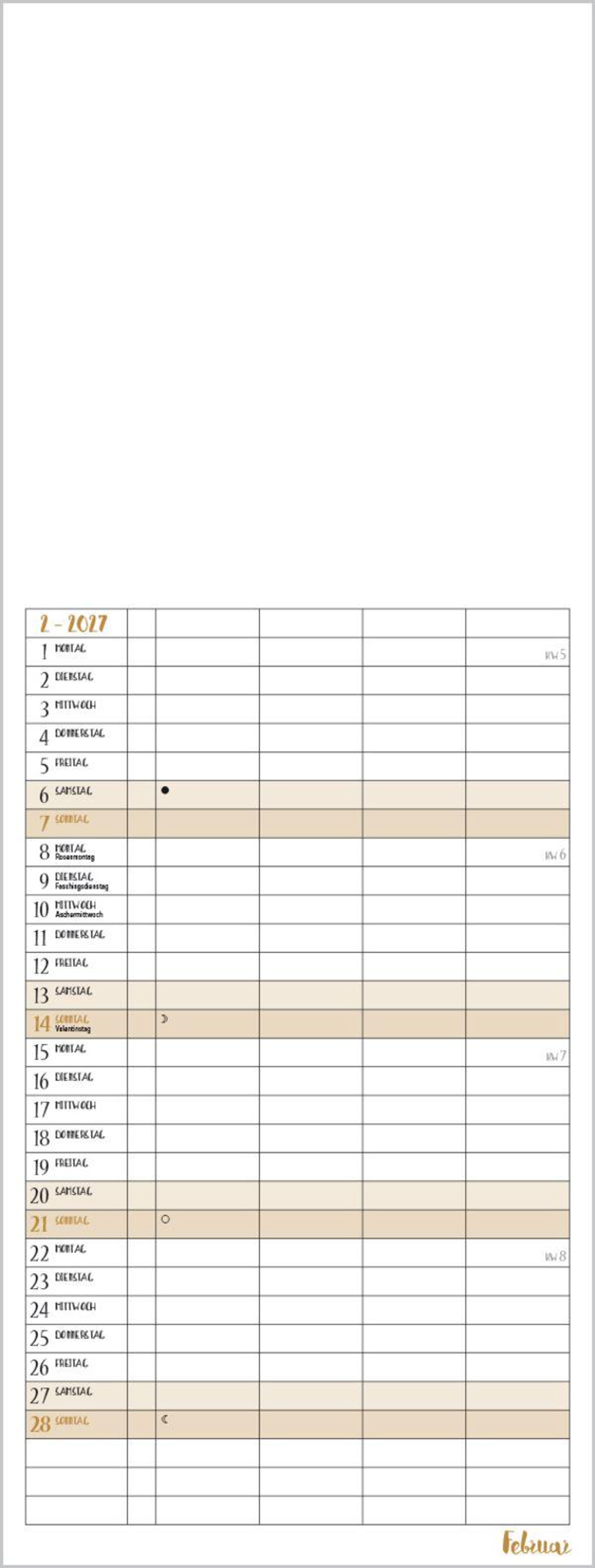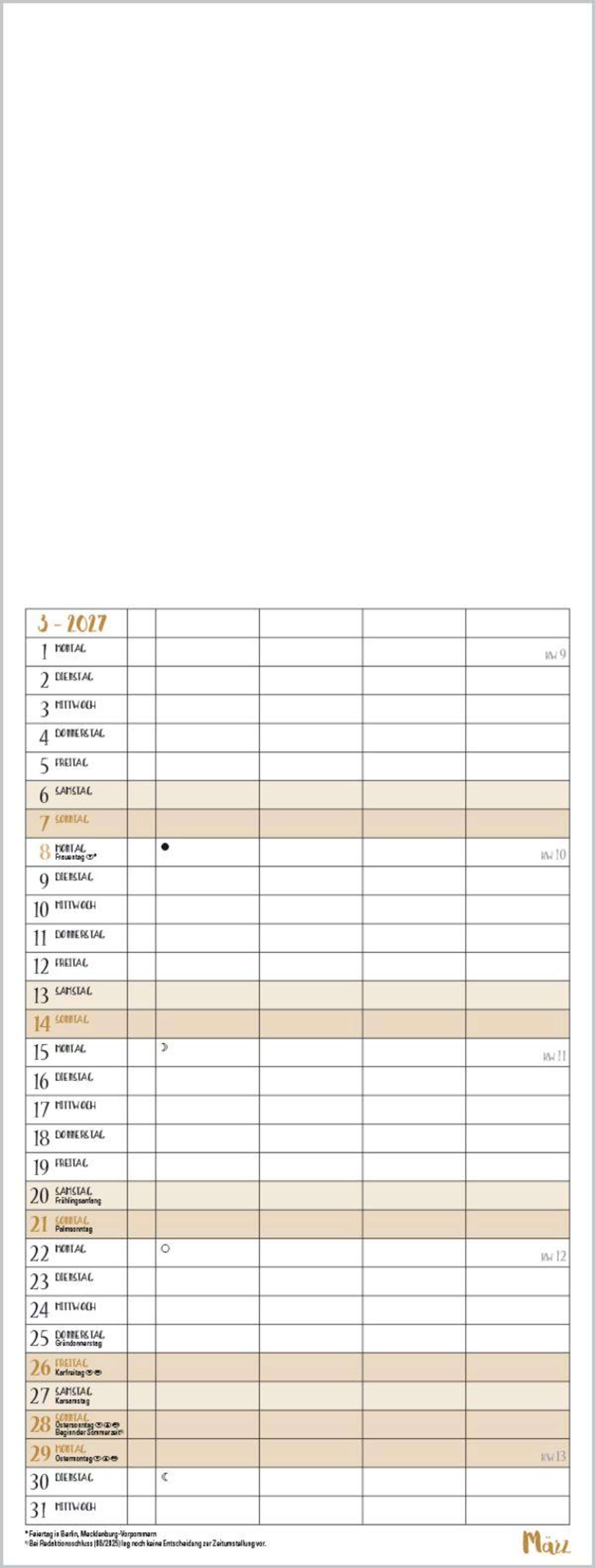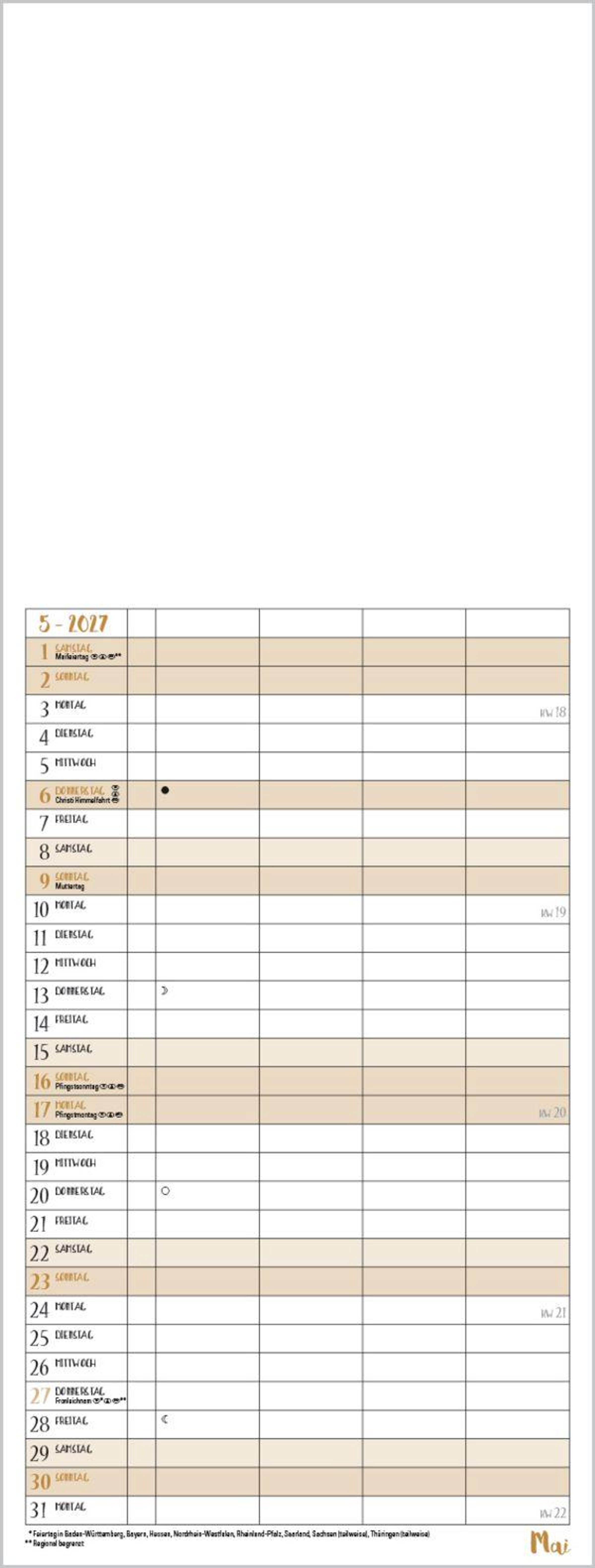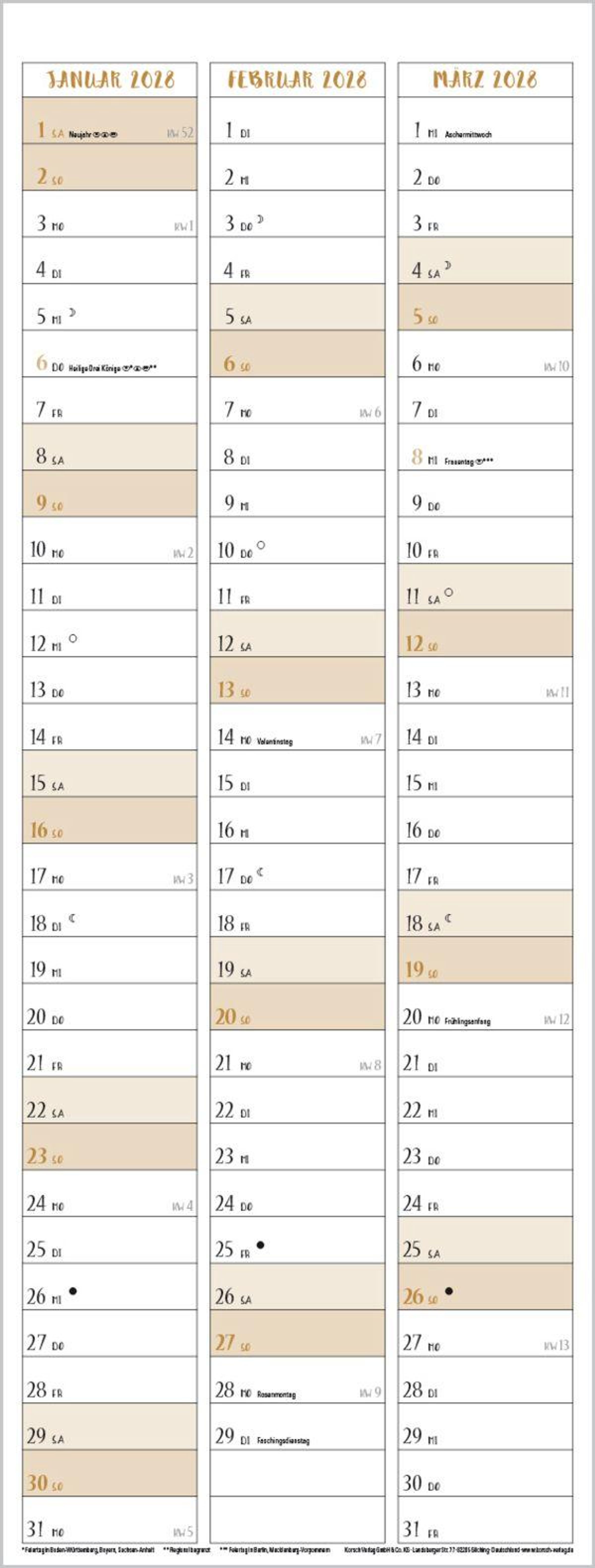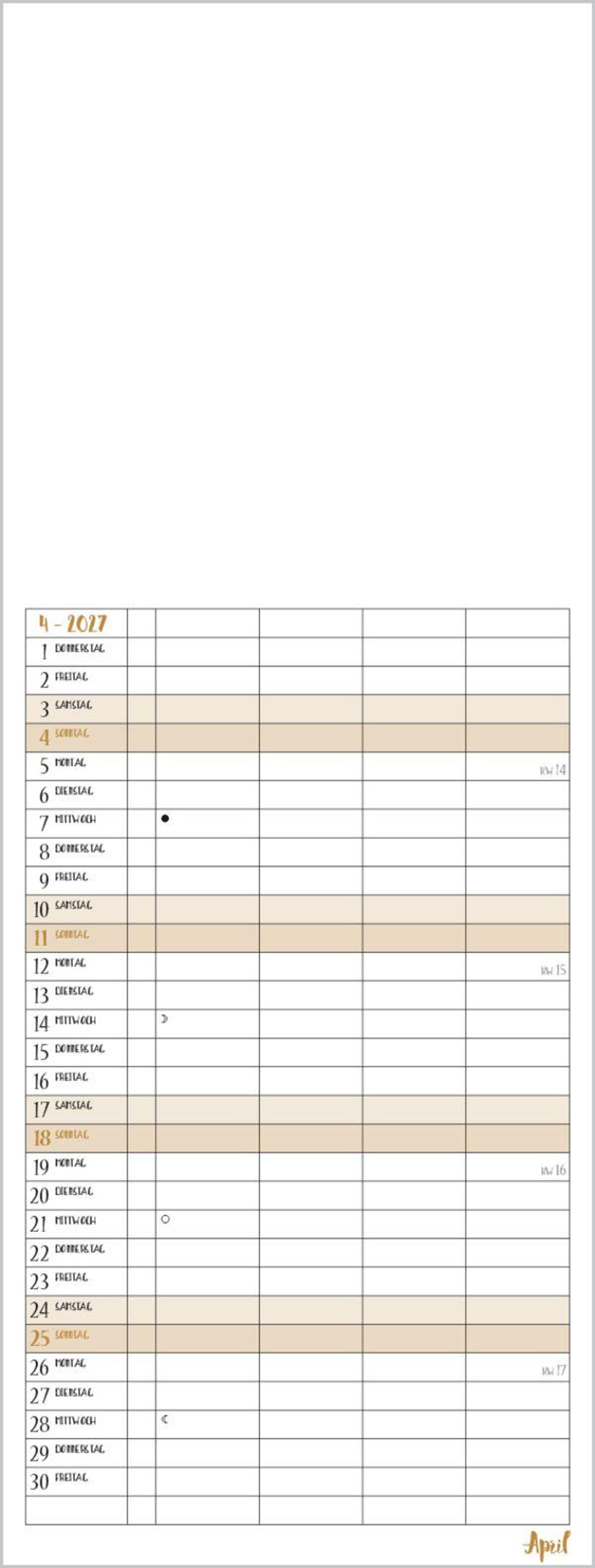Familientimer mit hochwertigem weißem Karton und mit edlen goldfarbenen Markierungen der Wochenenden und Feiertage