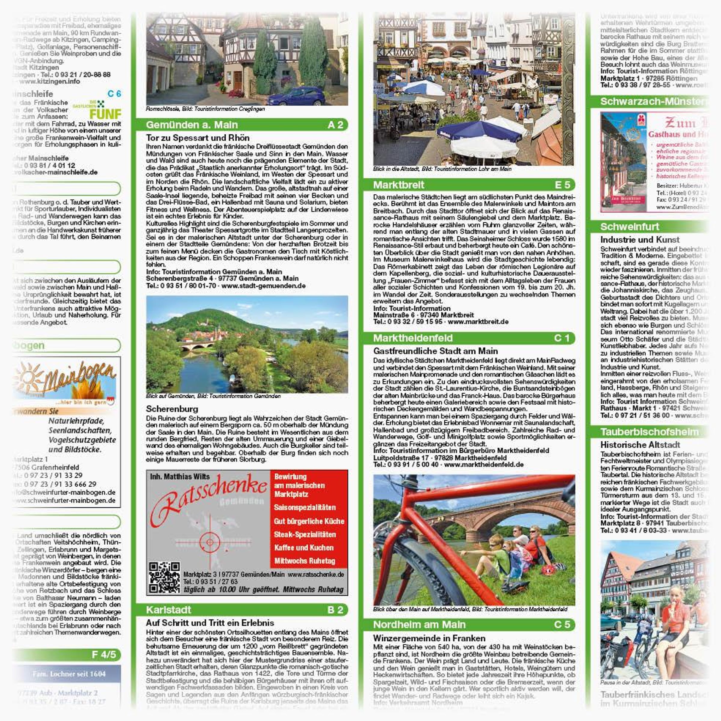 Ein Paradies für Sporturlauber, Individualisten und Romantiker stellen das Liebliche Taubertal und das Fränkische Weinland dar. Gut ausgeschilderte Radwanderrouten führen die Radfahrer durch die Naturparks Frankenhöhe, Spessart und Steigerwald sowie durch das Schweinfurter Land zu historischen und mittelalterlichen Städten, Museen und Sehenswertem. Würzburg, Tauberbischofsheim und Wertheim am Main sind dabei nur einige interessante Haltepunkte. Und die Weinberge, die man tagsüber passiert, laden nach der Radtour dazu ein, den Tag bei einem guten Glas Wein ausklingen zu lassen.