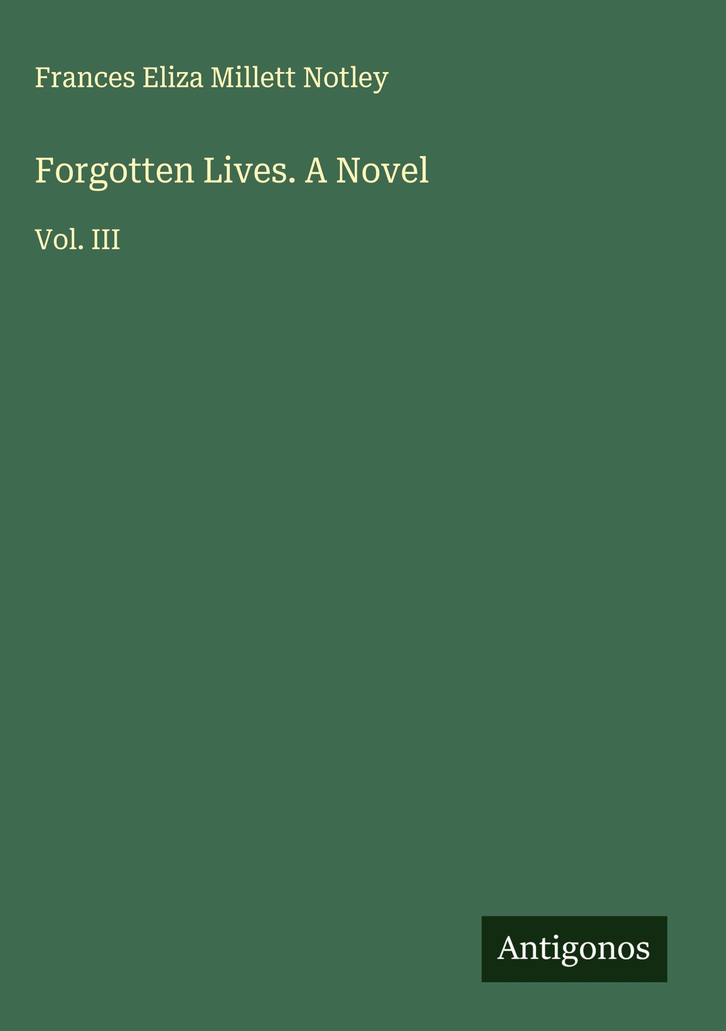 „Frances Eliza Millett Notley, Forgotten Lives. A Novel, Vol. III.“ Grüner Hintergrund, Logo mit „Antigonos“., Buch