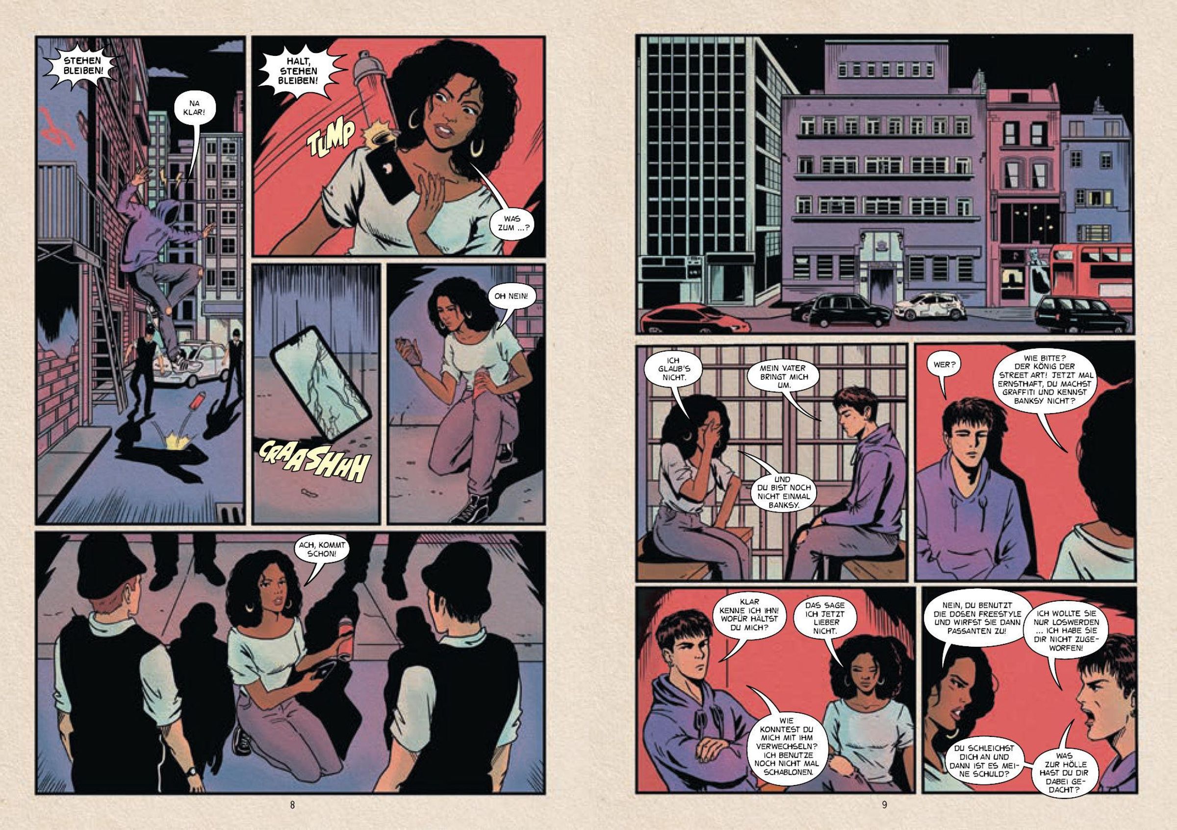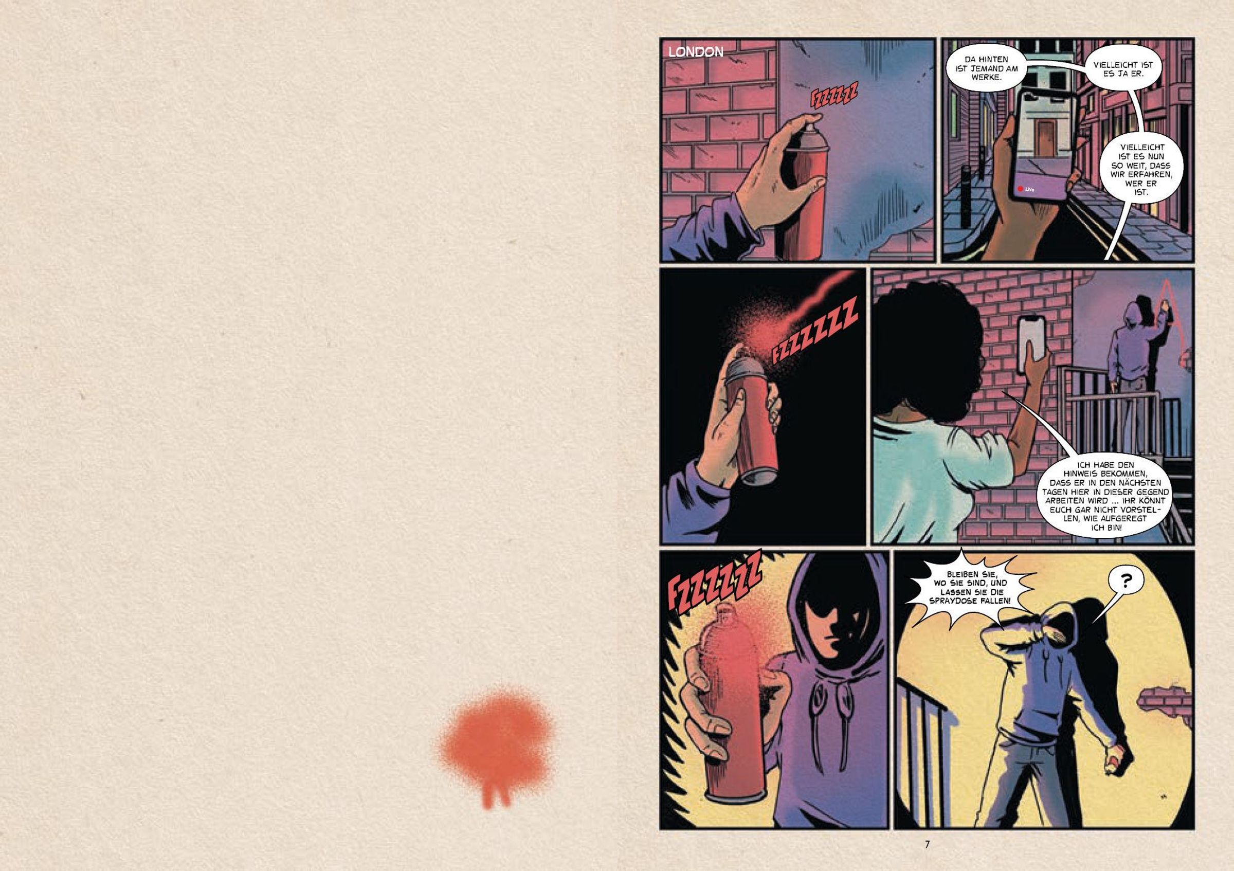 Die Protagonisten dieser komplett im Comic-Stil durchillustrierten Geschichte, ein Mädchen und ein Junge, gehen dem Leben und Wirken von Banksy wie in einem Dokumentarfilm nach: von den ersten Graffiti-Arbeiten in Bristol und London über die internationale Verbreitung seiner aufsehenerregenden Motive bis hin zu Museumsausstellungen und Rekordversteigerungen. Chronologisch aufgebaut, mit Rückblenden und Vorläufen, erschließen sich Banksys künstlerischer Werdegang, seine politische und soziale Haltung sowie die zahlreichen Theorien zu seiner Identität.