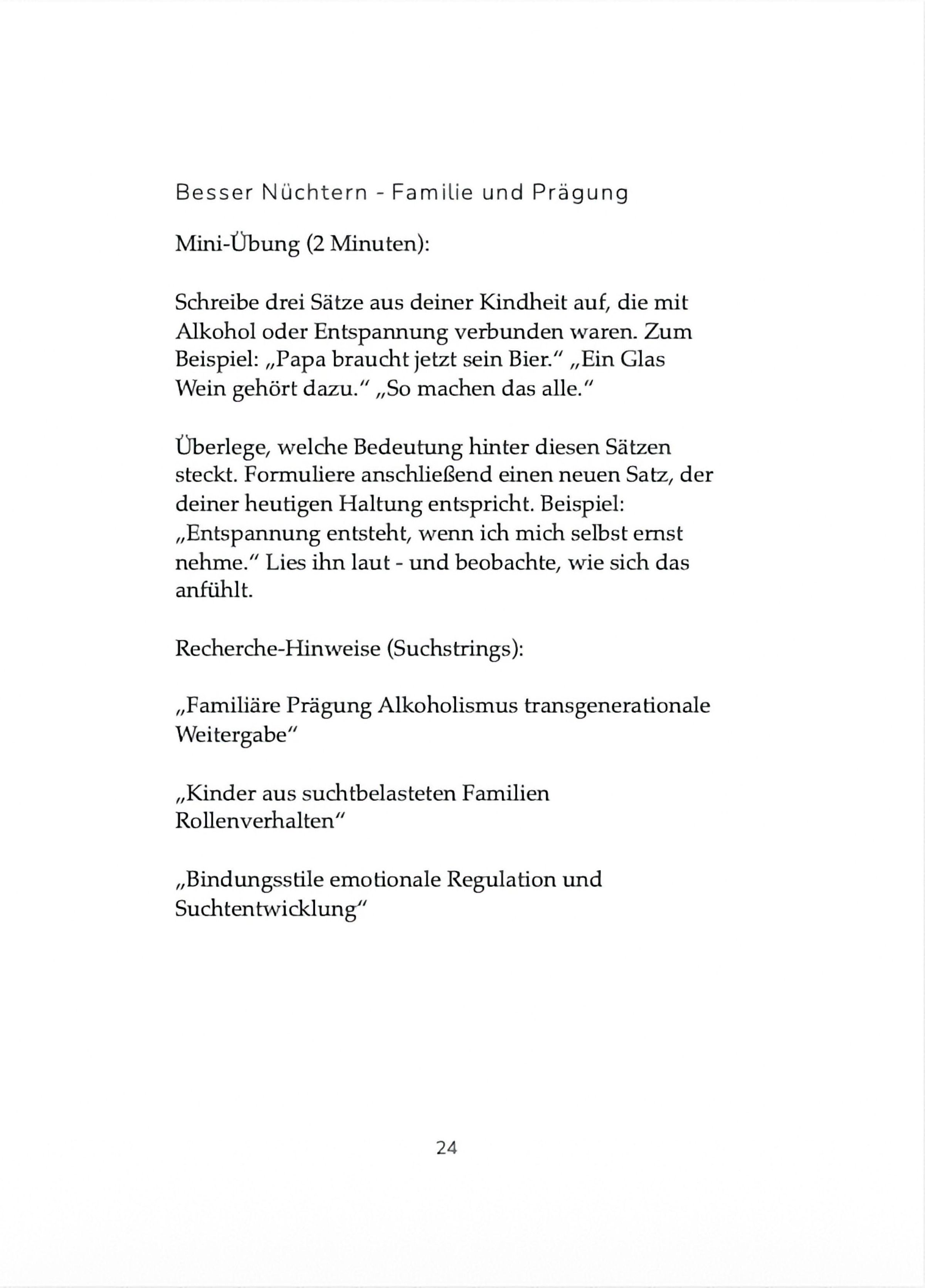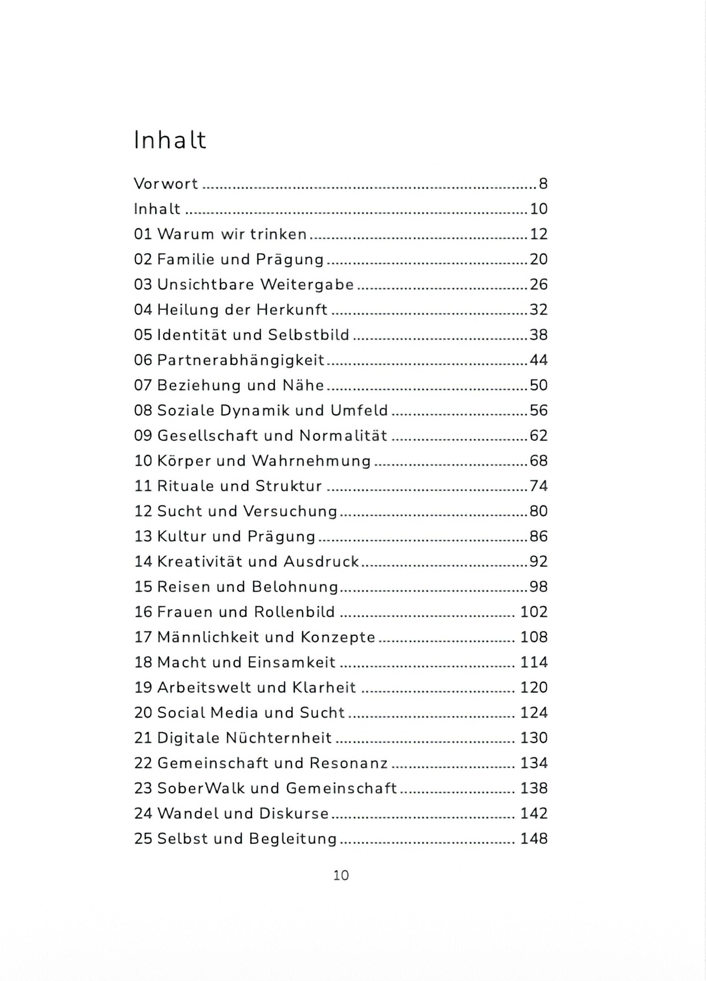 In thematischen Kapiteln öffnet es neue Perspektiven auf ein vertrautes Thema: Warum trinken wir und was geschieht, wenn Alkohol verschwindet. Das Buch lädt dazu ein, den eigenen Umgang mit Alkohol achtsam zu betrachten, ohne Dogma, aber mit Tiefgang. Es ist als Arbeitsbuch gedacht, mit Raum für eigene Kommentierungen, und möchte Andockpunkte in ein komplexes Thema geben sowie Inspiration und Hilfestellung.