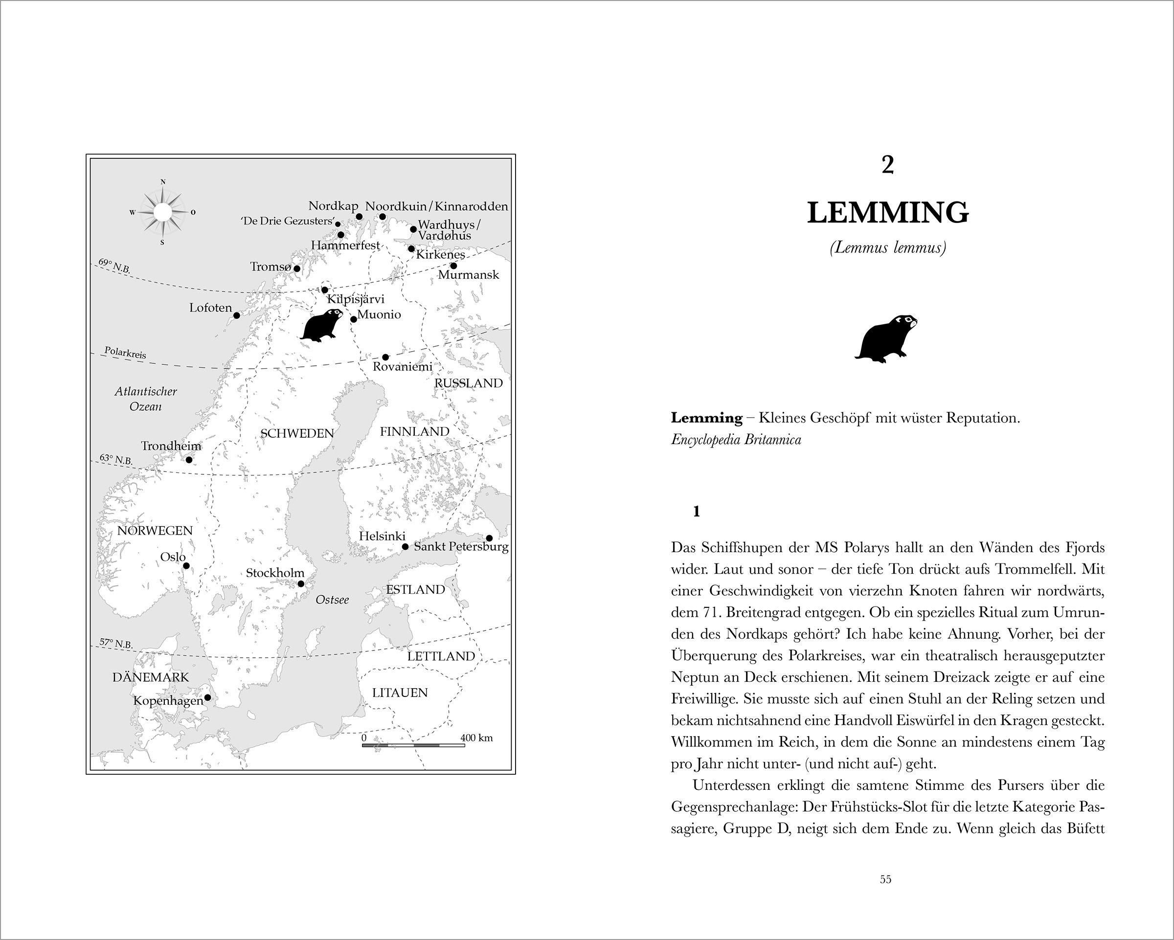 In den sieben Kapiteln des Buches sind diese sieben Tiere die tragischen Protagonisten. Jedes Kapitel bietet dazu eine vielschichtige und mitreißende Erzählung. Ein Einhornwal-Stoßzahn wird benutzt, um einen Terroranschlag in London zu verhindern; Walt Disney kauft von Inuit-Kindern Lemminge, um sie über eine Klippe zu jagen; Russland und Norwegen spielen ihren neuen Kalten Krieg mit Rentieren als Spielfiguren aus; ein ungeklärtes Massensterben von Ringelgänsen wird aufgeklärt; und Westerman riskiert sein eigenes Leben und das seiner Tochter beim Campen im norwegischen Svalbard am Ort eines tödlichen Eisbärenangriffs.