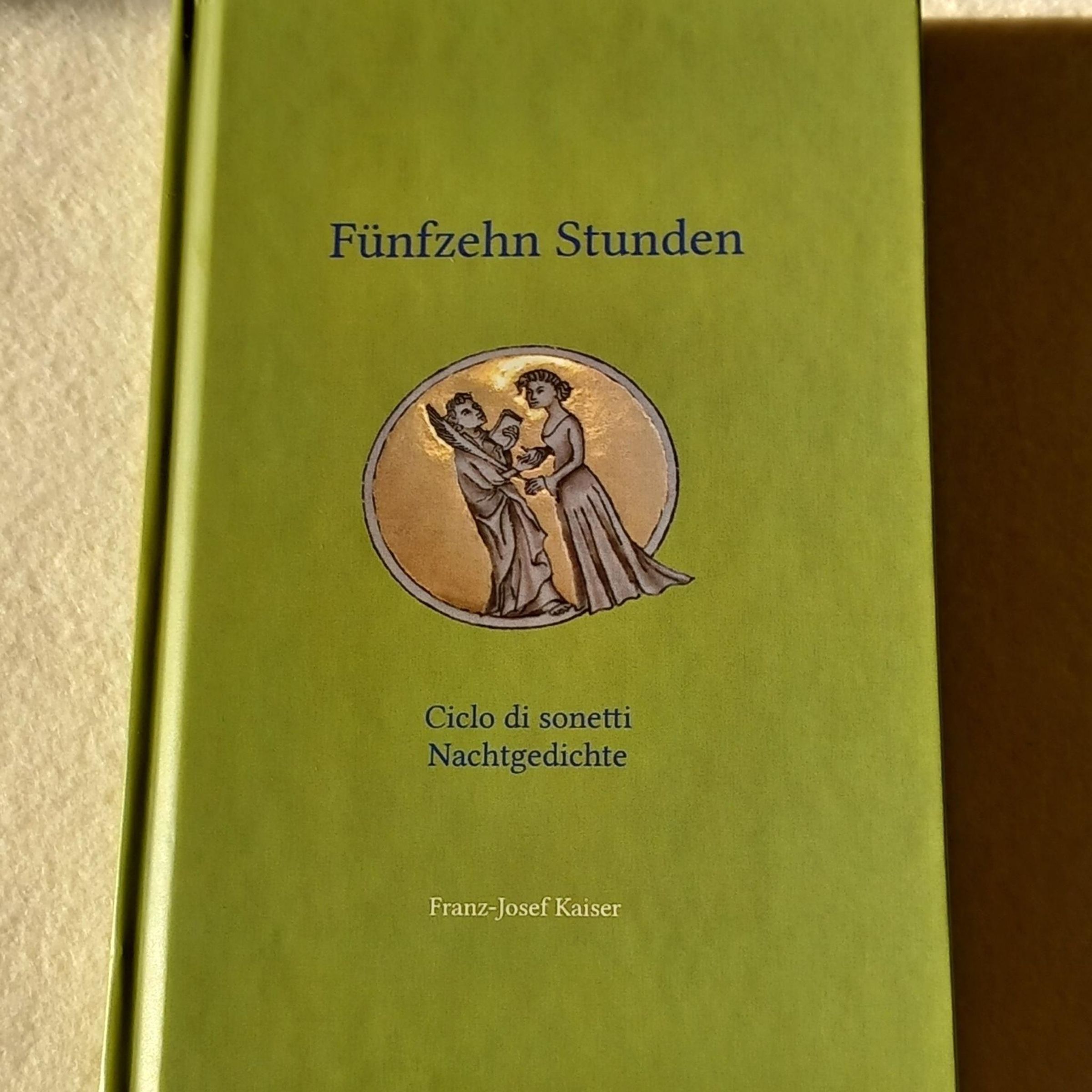 „Fünfzehn Stunden“, „Ciclo di sonetti Nachtgedichte“, Franz-Josef Kaiser. Illustration zweier Figuren in einem Kreis., Buch