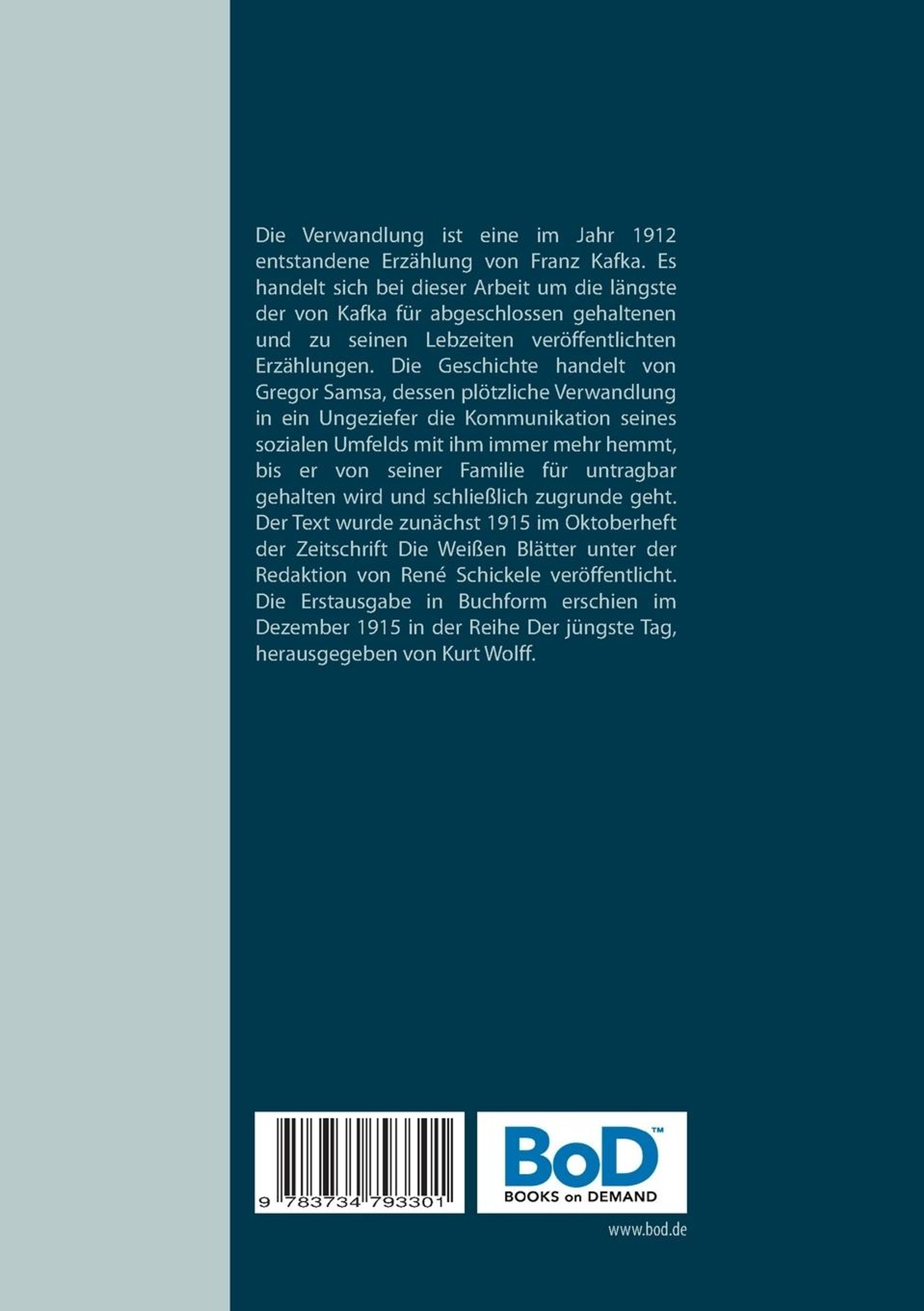 Die Verwandlung ist eine im Jahr 1912 entstandene Erzählung von Franz Kafka. Es handelt sich bei dieser Arbeit um die längste der von Kafka für abgeschlossen gehaltenen und zu seinen Lebzeiten veröffentlichten Erzählungen. Die Geschichte handelt von Gregor Samsa, dessen plötzliche Verwandlung in ein Ungeziefer die Kommunikation seines sozialen Umfelds mit ihm immer mehr hemmt, bis er von seiner Familie für untragbar gehalten wird und schließlich zugrunde geht. Der Text wurde zunächst 1915 im Oktoberheft der Zeitschrift Die Weißen Blätter unter der Redaktion von René Schickele veröffentlicht. Die Erstausgabe in Buchform erschien im Dezember 1915 in der Reihe Der jüngste Tag, herausgegeben von Kurt Wolff.