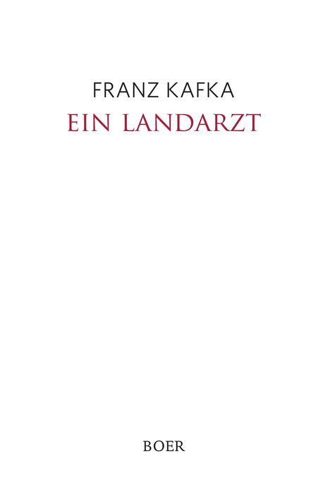 Ein Landarzt ist eine Erzählung von Franz Kafka. Sie entstand im Jahr 1917 und wurde 1918 erstmals in >>Die neue Dichtung - Ein Almanach des Kurt Wolff Verlags<< veröffentlicht. Sie war namensgebend für den gleichnamigen Erzählband Kafkas, erschienen 1920, der dreizehn weitere Prosatexte enthielt. Kafka wurde zu der Erzählung möglicherweise durch einen Onkel Siegfried Löwy inspiriert, der in einem kleinen Ort in Mähren als Landarzt arbeitete. Über diesen Onkel sagt Kafka in einen Brief an Max Brod: >>Und er lebt so auf dem Land, unausreißbar, zufrieden, so wie einen eben ein leise rauschender Irrsinn zufrieden machen kann, den man für die Melodie des Lebens hält<<. Kafkas Tagebuchaufzeichnungen vom 9. Oktober 1911 schildern einen Traum von einem Bordell mit einer Dirne, deren ganzer Körper >>mit großen siegellackroten Kreisen mit erblassenden Rändern und dazwischen versprengten roten Spritzern bedeckt war<<. Am 12. August 1917 erlitt Kafka einen heftigen Blutsturz, in Zusammenhang mit seiner Tuberkulose, an der er schließlich starb. An Max Brod schrieb er am 5. September 1917, mit der >>Blutwunde<< im Landarzt habe er seine Krankheit >>vorausgesagt<<. Kafka selbst bezeichnete Ein Landarzt als eine seiner wenigen wirklich gelungenen Erzählungen. [Wikipedia]