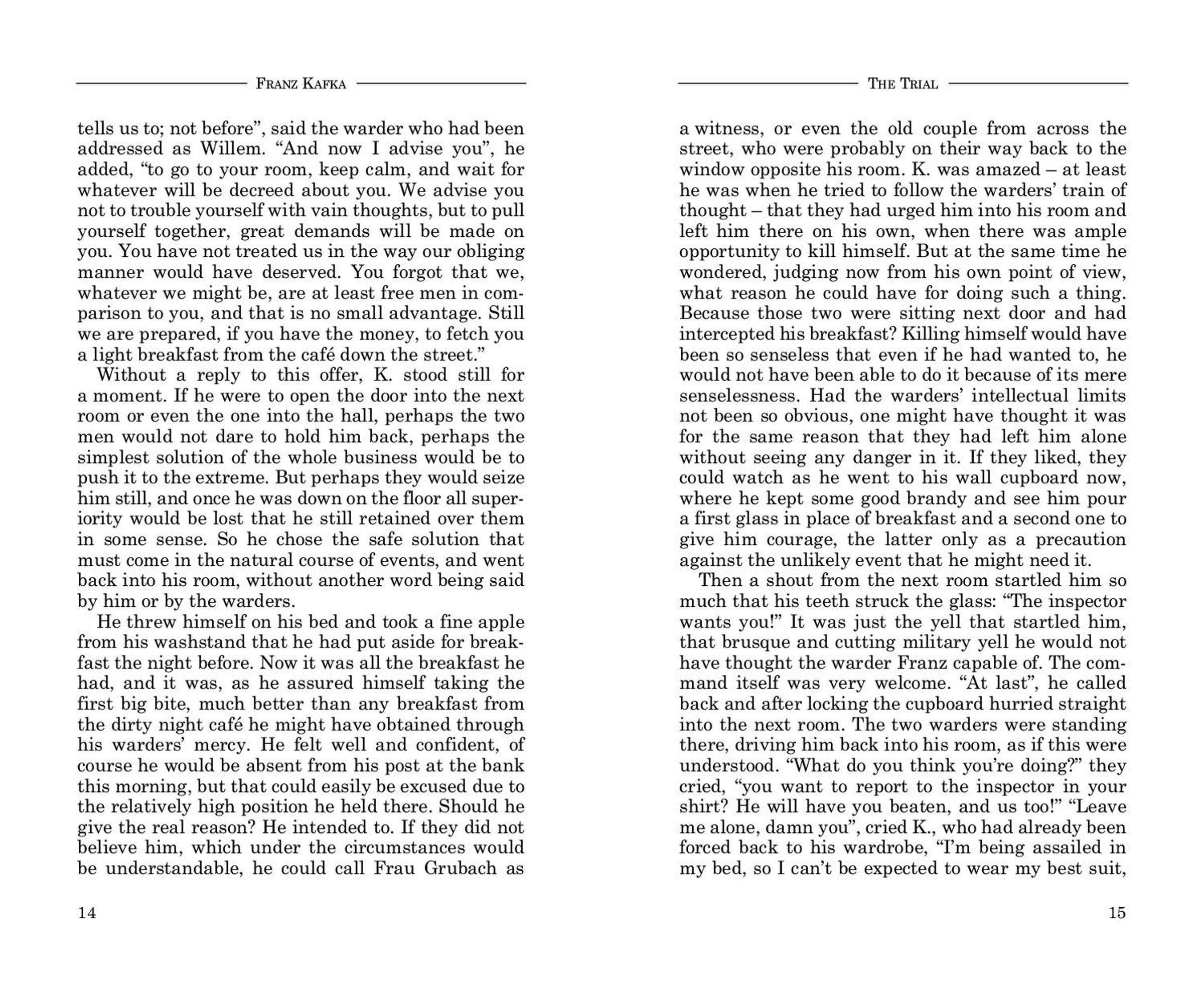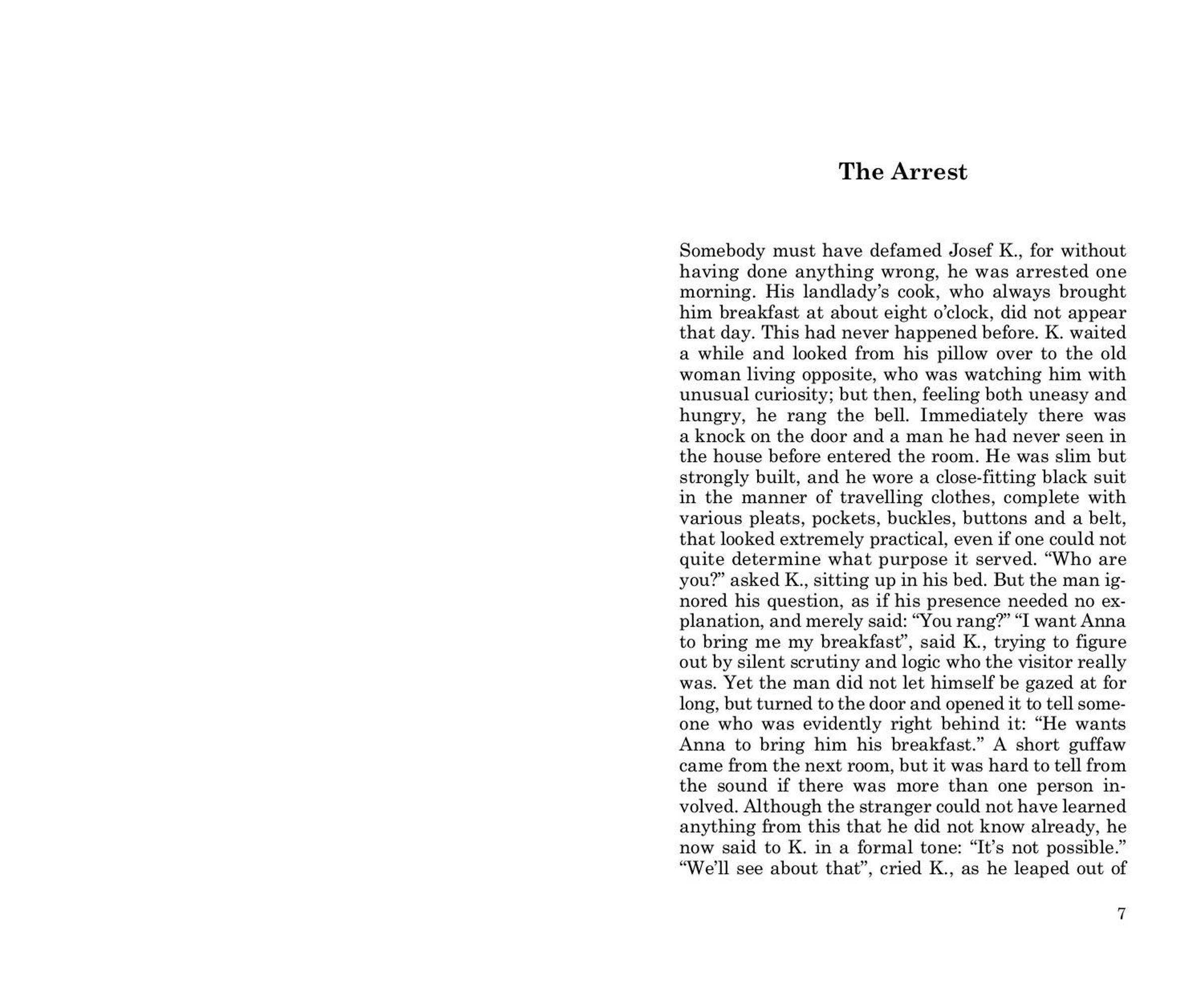 Jemand mußte Josef K. verleumdet haben, denn ohne daß er etwas Böses getan hätte, wurde er eines Morgens verhaftet. Die Köchin der Frau Grubach, seiner Zimmervermieterin, die ihm jeden Tag gegen acht Uhr früh das Frühstück brachte, kam diesmal nicht ...